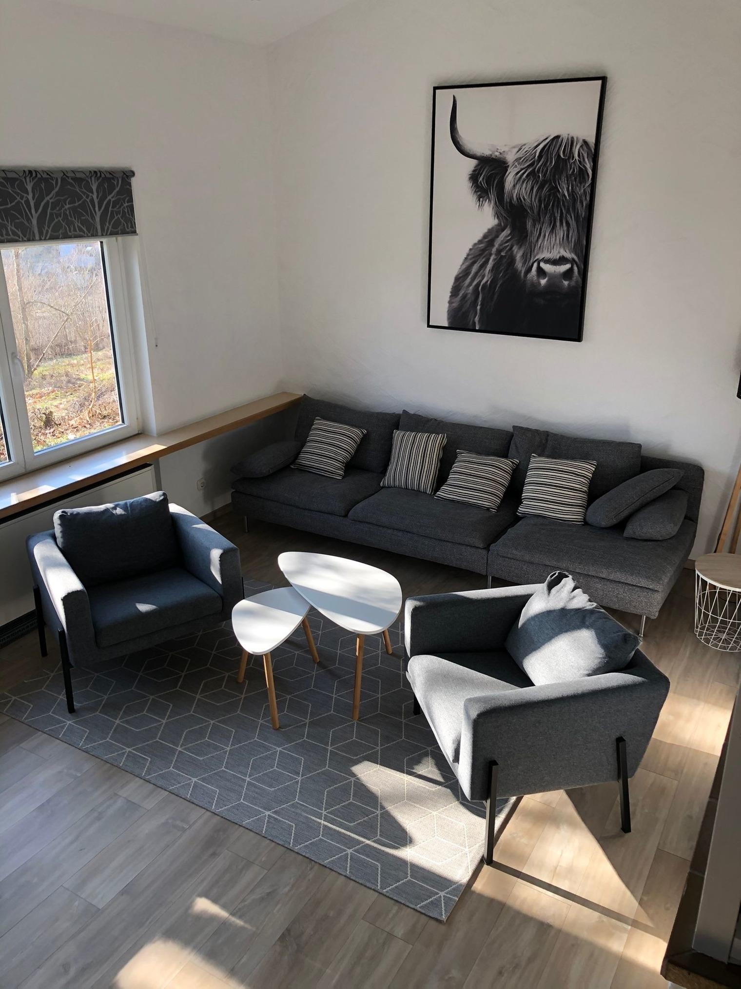 Genießen sie den hellen, großzügigen Wohnbereich mit offenem Kamin und direktem Zugang zur Terrasse und der angrenzenden Wiese.