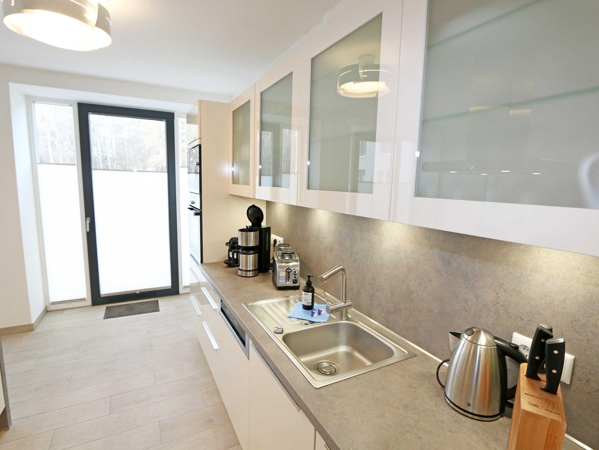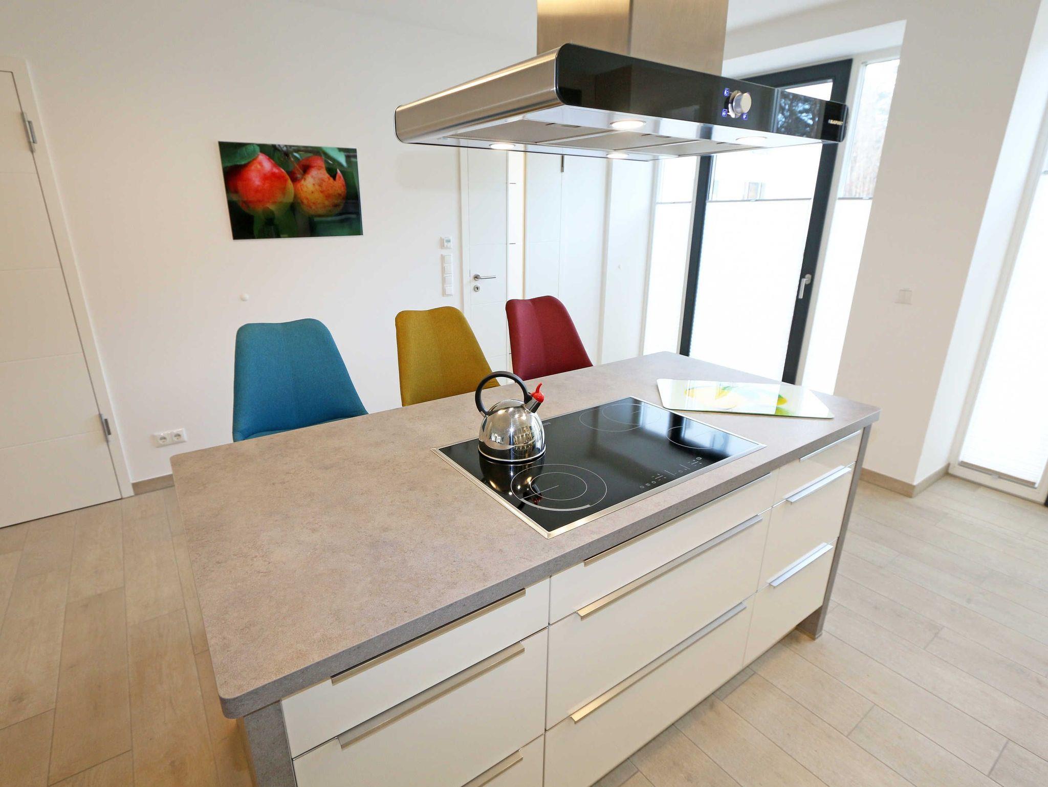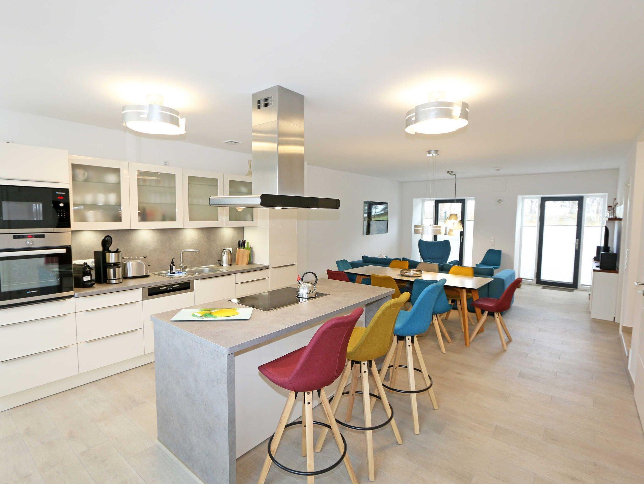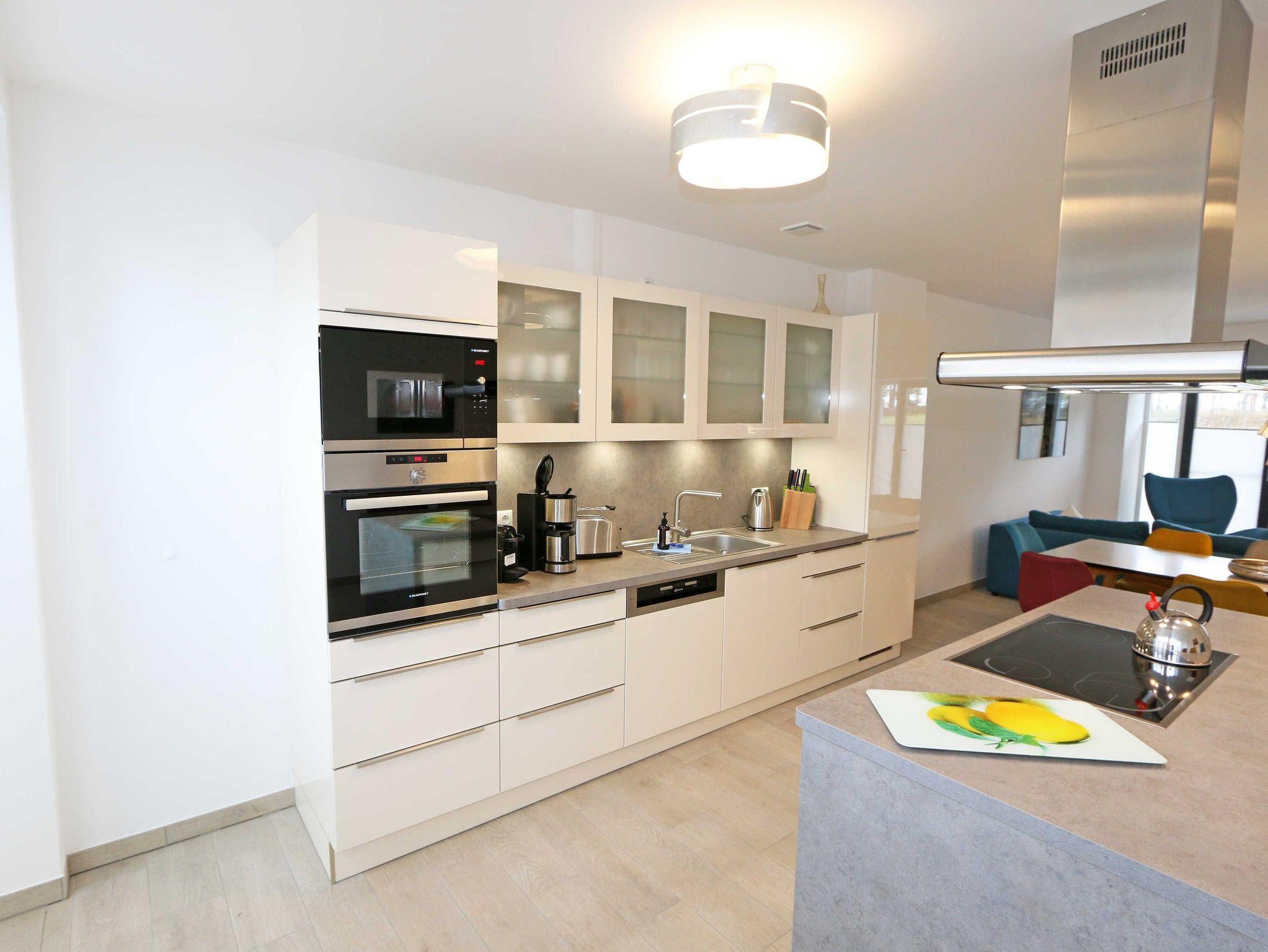 Die ca. 140 m² große 5-Raumferienwohnung (Nichtraucher), welche sich über 2 Etagen erstreckt, bietet Ihnen durch ihre erstklassige, stilsichere Ausstattung mit Balkon (Seeseite) und Terrassen im Erdgeschoss beste Voraussetzungen für einen unvergesslichen Urlaub. Dank einer gelungenen Raumaufteilung bietet die Wohnung Platz für max. 7 Erwachsene und 2 Kleinkinder bis 3 Jahre im Kinderreisebett. Im großzügigen Wohn-/Essbereich können Sie durch die komfortable Eck-Couch mit Couchtisch, Sideboard und großem Essplatz gemütliche Tage verbringen. Vier Smart-TVs und eine Mini-Stereo-Anlage mit Bluetooth und USB-Anschluss sowie das in der Wohnung kostenlos zur Verfügung gestellte W-LAN sorgen für Ihre Unterhaltung. Vom Wohnbereich gelangen Sie direkt auf Ihre 2 Terrassen, welche einmal zur Seeseite und zur Landseite ausgerichtet sind. Die moderne Küchenzeile, welche sich dem Wohnbereich anpasst, bietet Ihnen ein 4-Zonen-Cerankochfeld, Backofen, Spülmaschine, Kühlschrank mit separaten Gefrierfach, Kaffeemaschine, Nespresso Kaffeemaschine, Toaster, Wasserkocher, Mixer sowie diverse Küchenutensilien und lädt so zu gemütlichen Kochabenden ein. Drei Schlafzimmer sind mit einem Doppelbett (1x 1,60m x 2,00m, 1x 0,90m x 2,00m ausziehbar auf 1,80m und 1x 1,80m x 2,00m), Nachttischablagen mit Beleuchtung und USB-Anschlüssen sowie Kleiderschränken für Ihre Urlaubsgarderobe ausgestattet. Das vierte Schlafzimmer verfügt über ein Einzelbett (0,90m x 2,00m), Nachttischablage mit Beleuchtung und USB Anschlüssen sowie einen Kleiderschrank. Bei einem der 4 Schlafzimmer erwartet Sie zusätzlich ein Zugang zum Balkon, wo Sie einen einmaligen Blick auf die Ostsee erleben werden. Verdunklungsmöglichkeiten durch Vorhänge sowie Plissees und Insektenschutz erlauben einen geruhsamen Schlaf in allen 4 Schlafzimmern. Drei Schlafzimmer verfügen über je ein Smart-TV. Alle 3 Bäder sind jeweils mit einem WC, einer ebenerdigen Dusche, einen Kosmetikspiegel, einen Fön, einen Handtuchtrockner sowie einem Waschplatz mit großzügigen Spiegeln und Ablageflächen eingerichtet. Ein Badezimmer lockt zusätzlich mit einer Sauna zur Entspannung ein. Ein weiteres Bad wird durch ein Bidet und einer Badewanne abgerundet. Im wohnungsinternen Abstellraum finden Sie auch einen Staubsauger, einen Wäscheständer sowie ein Bügelbrett mit Bügeleisen. In einem separaten Abstellraum im Haus Granitz befindet sich zusätzlich eine Waschmaschine, welche sich für Whg 53 und 03 inklusive ist. Diese befindet sich in der 3 Etage des Hauses und kann bequem mit dem Fahrstuhl erreicht werden. Haustiere, ein kleinerer Hund ist gegen eine Gebühr, gestattet. Ein Stellplatz für Ihren PKW ist auf den gegenüberliegenden Parkplätzen für Sie reserviert. Ihre mitgebrachten Fahrräder können Sie in einem Gemeinschaftsabstellraum unterstellen. Die Erstausstattung eines Wäschepaketes (komplette Bettwäsche, 1 Duschhandtuch, 1 kleines Handtuch) können Sie bis 14 Tage vor Anreise gegen einen Aufpreis dazu buchen oder durch eigene ergänzen. Ab 2 gebuchten Paketen erhalten Sie einmalig 1 Geschirrhandtuch und 1 Duschvorleger hinzu.