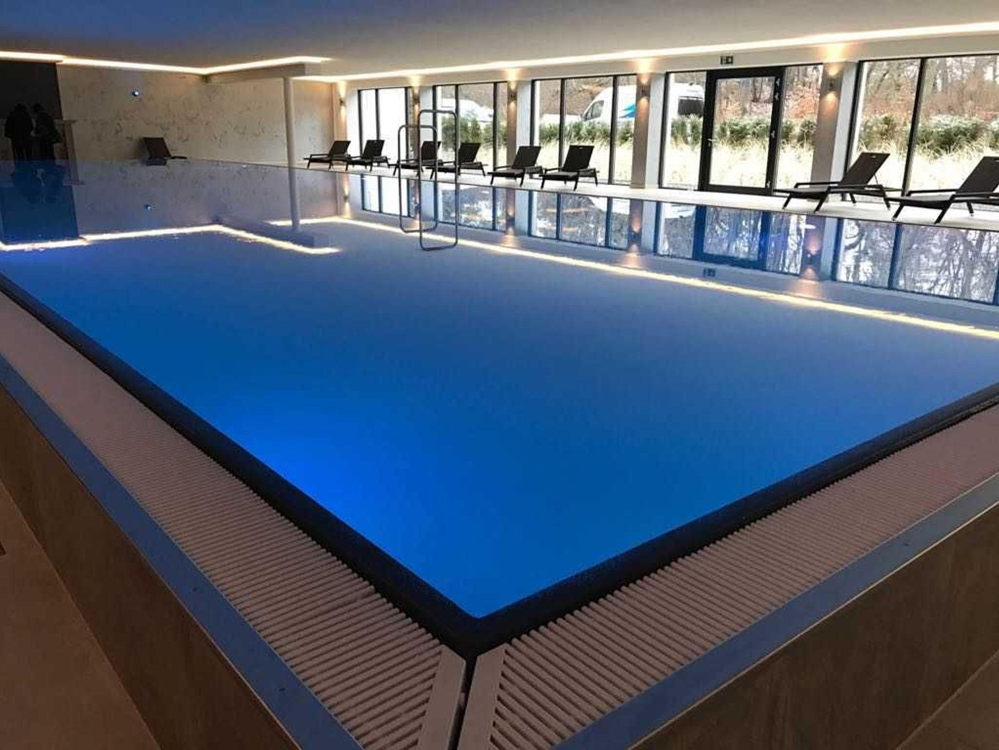 Im Erdgeschoss des Hauses finden Sie den SPA-Bereich mit Fitness- und Massageraum, Aufenthaltsbereich mit kleinen Erfrischungen, eine Bio-(60 Grad) und 90 Grad-Sauna und den Innenpool mit separatem Kinderbecken.