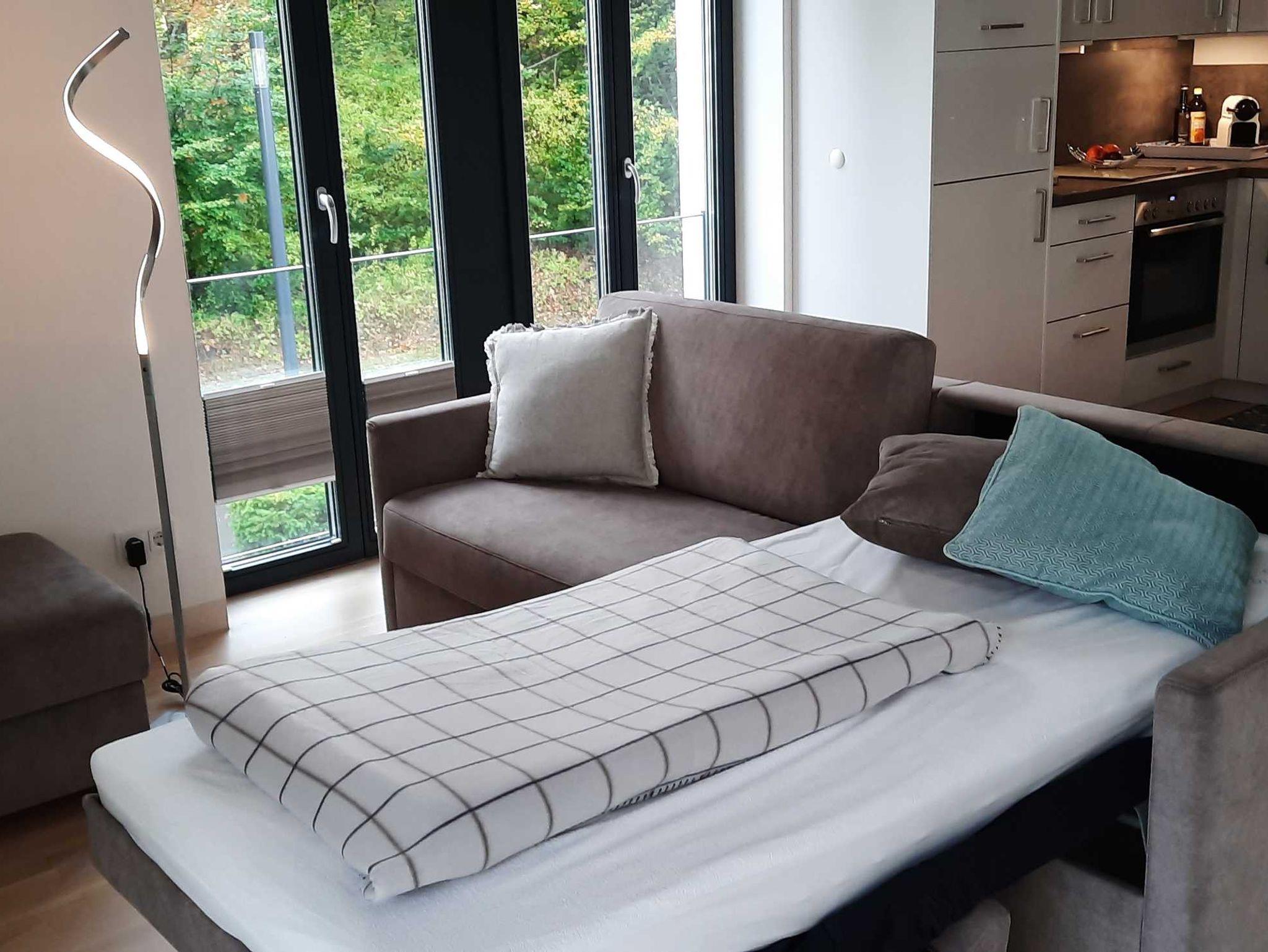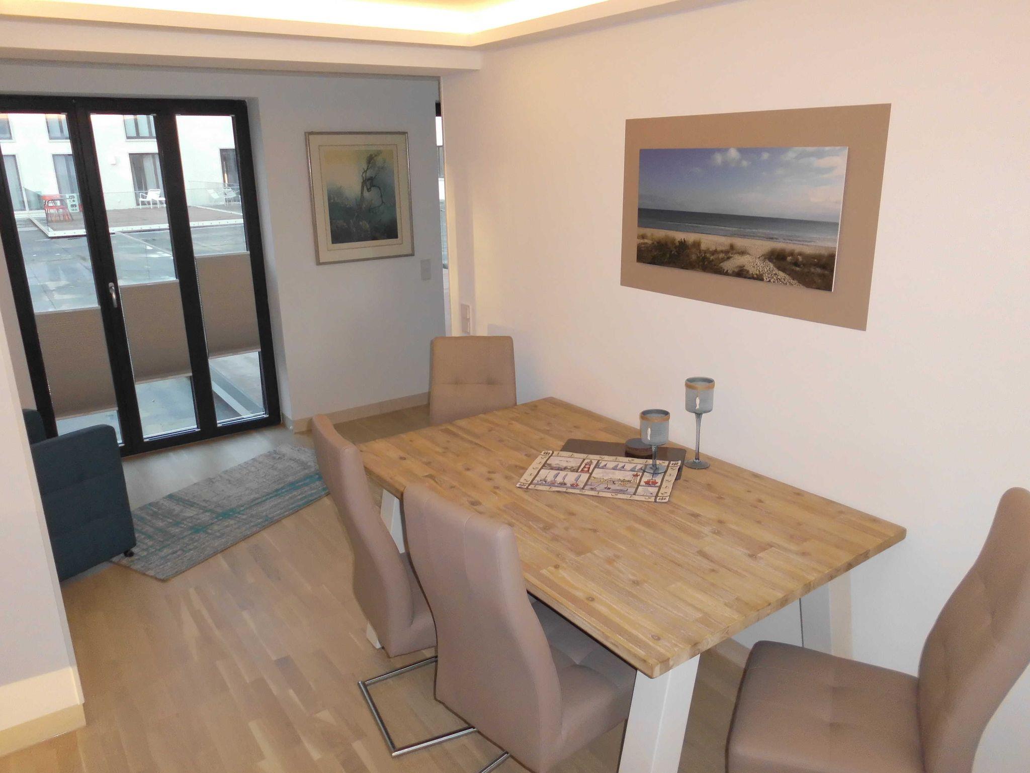 Im Wohnzimmer finden auf dem ausklappbaren Sofa (separater Lattenrost + Matratze) die 3./4. Person ihren Schlafplatz. Weitere Ausstattung sind hier ein modernes Curved Smart TV, Blue-Ray Player sowie WLan in der gesamten Wohnung.