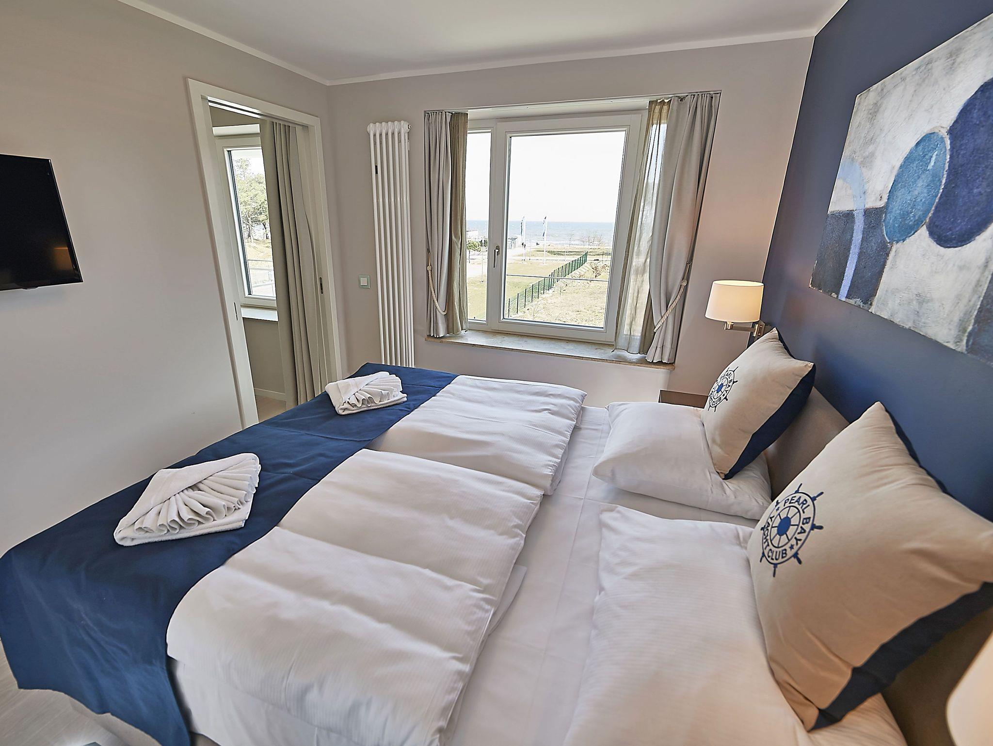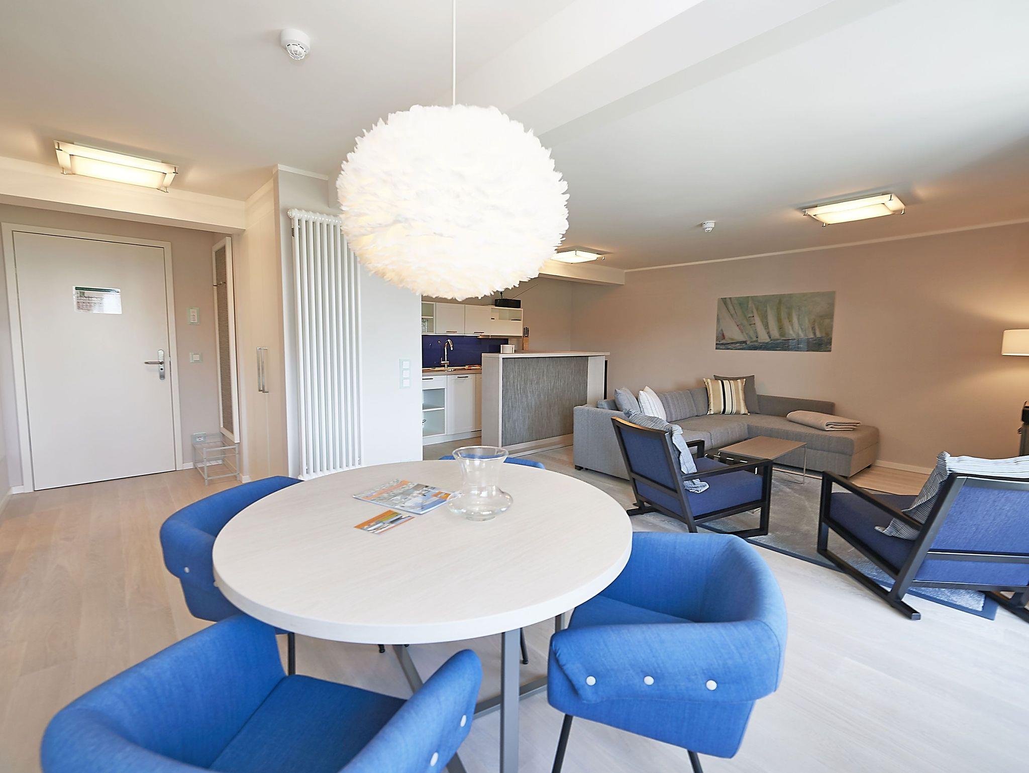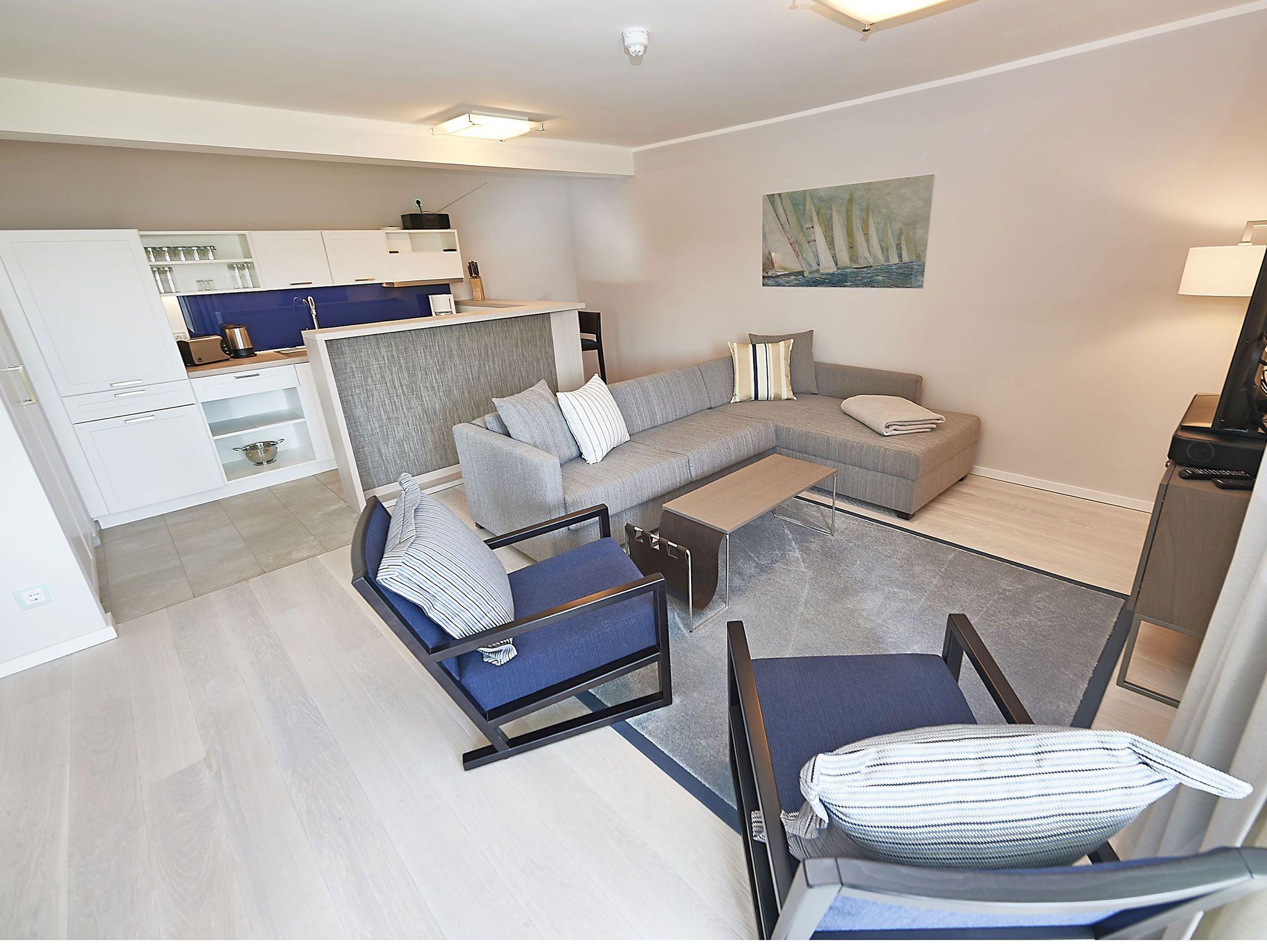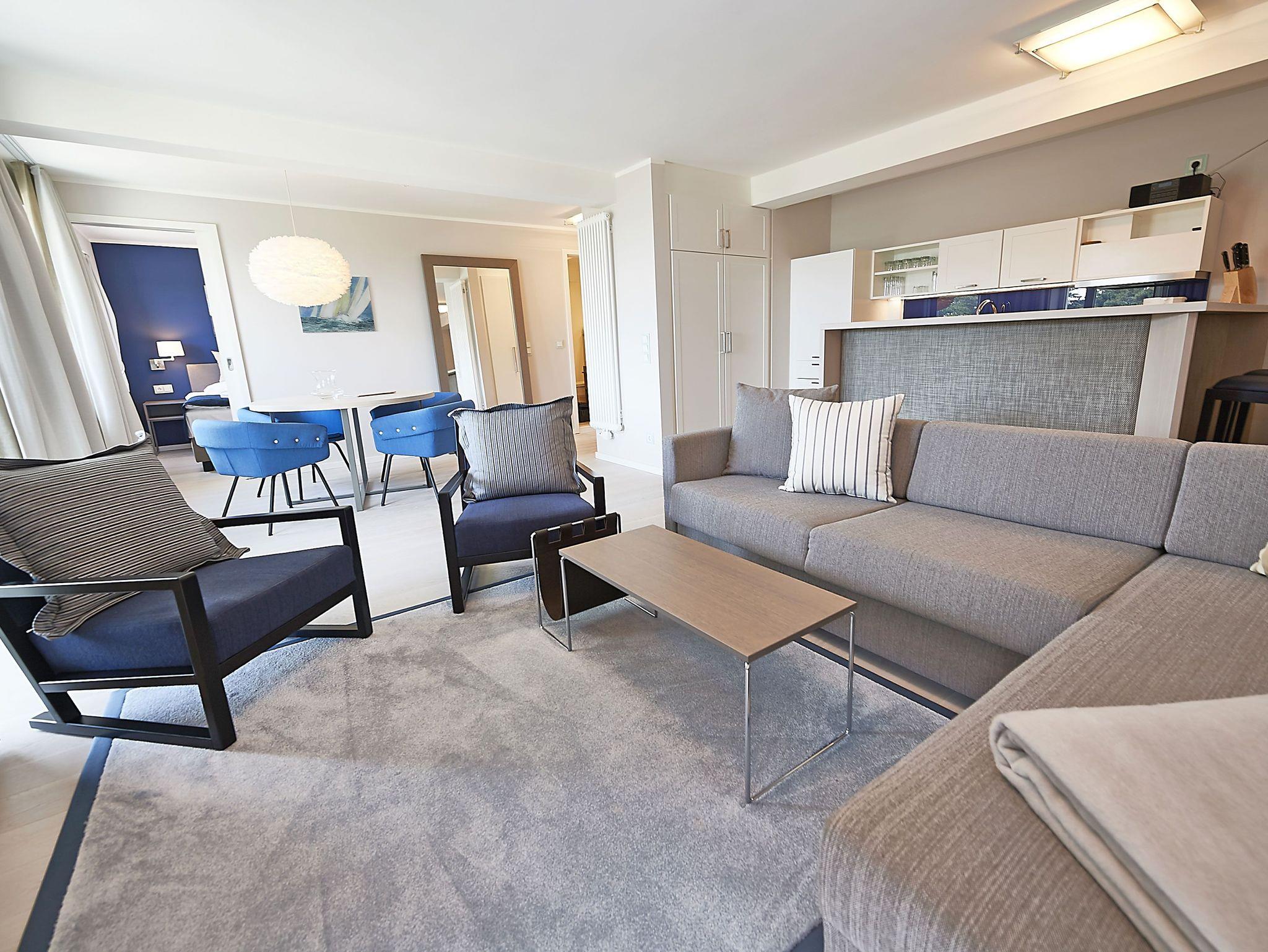 Vom Eingangsbereich aus gelangen Sie in den modern ausgestatteten Wohnbereich mit Couchgarnitur, einem Flachbild-TV, einem Radio mit USB-Anschluss, Bluetooth und Internet, einem Essplatz und einer Küchenkomplettzeile mit zusätzlichen Barhockern. Vom großen Balkon und sogar vom Bett aus können Sie die Weite der Ostsee genießen. Die Balkonmöbel stehen saisonal - in der Regel von Mai bis Ende September - zur Verfügung.