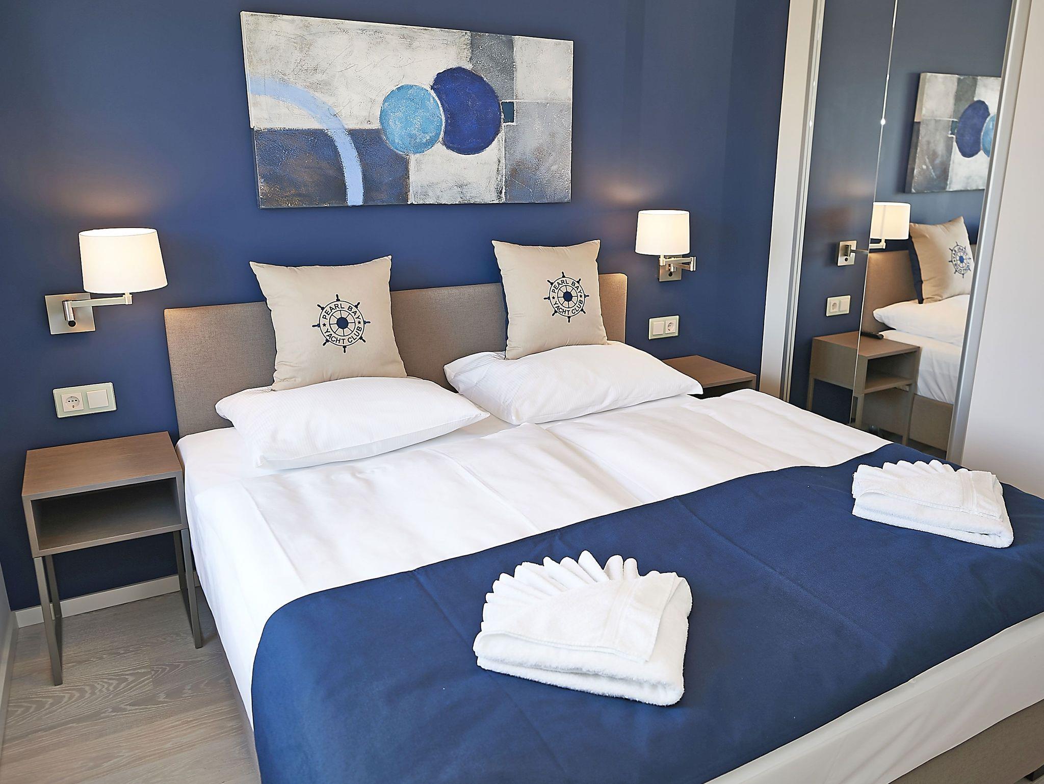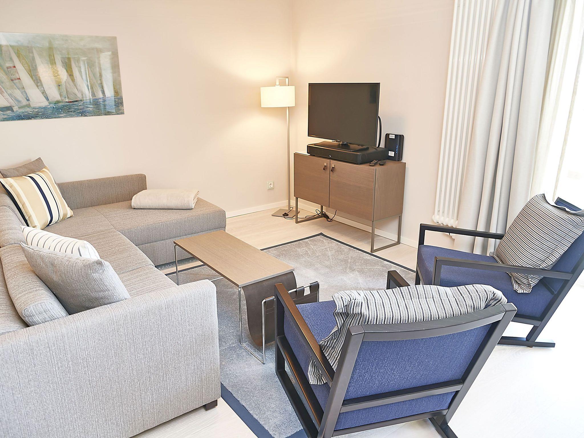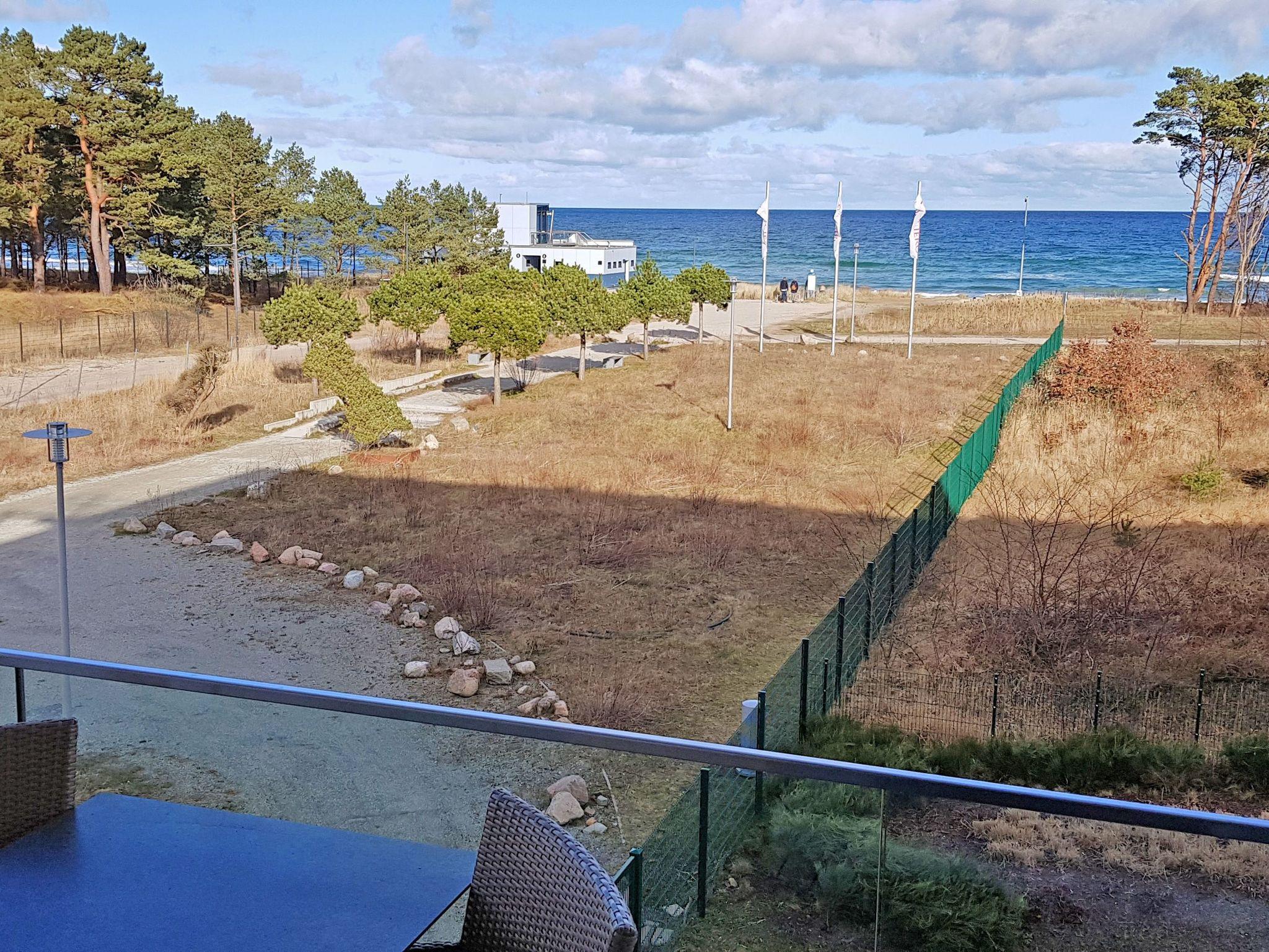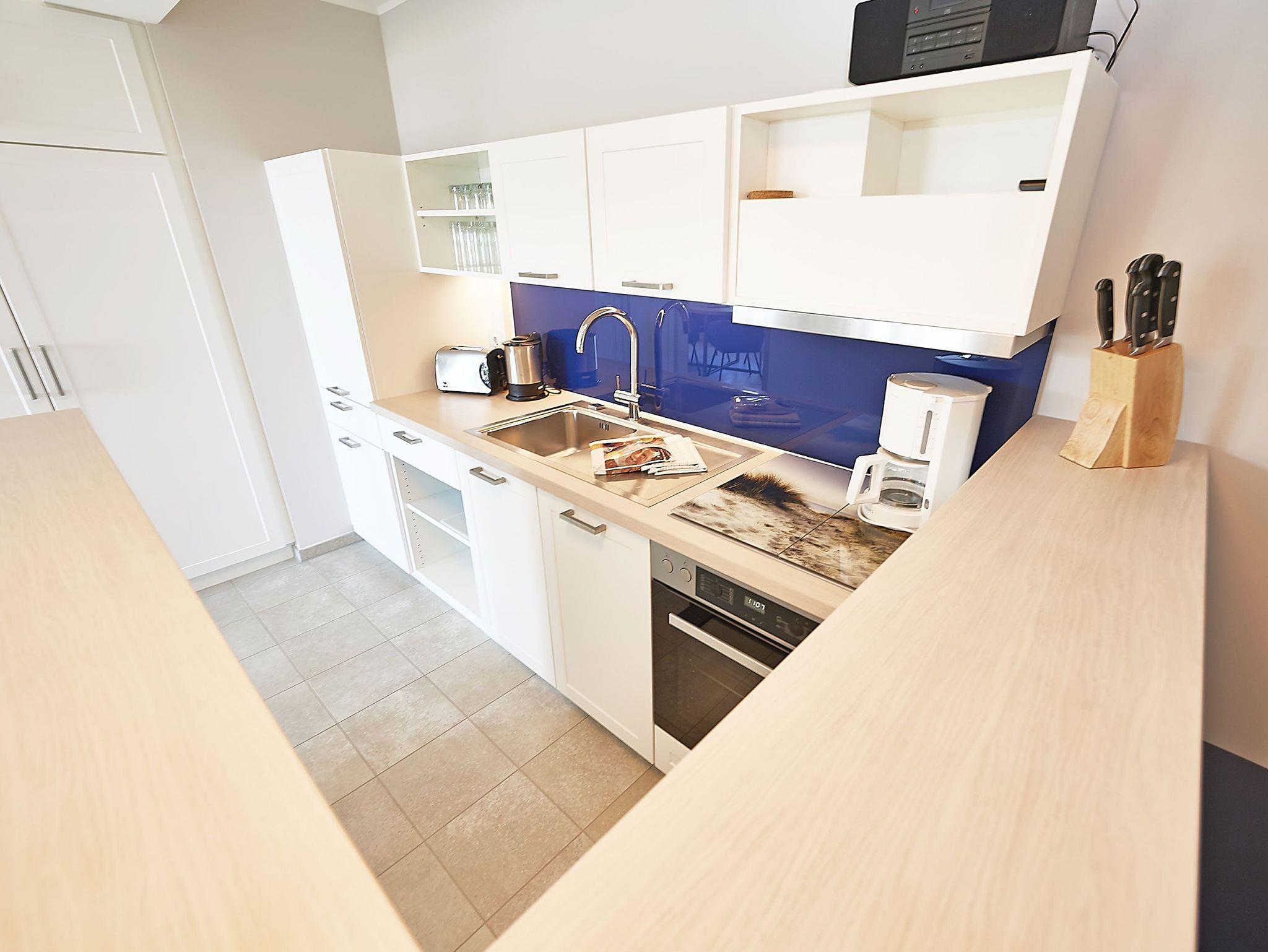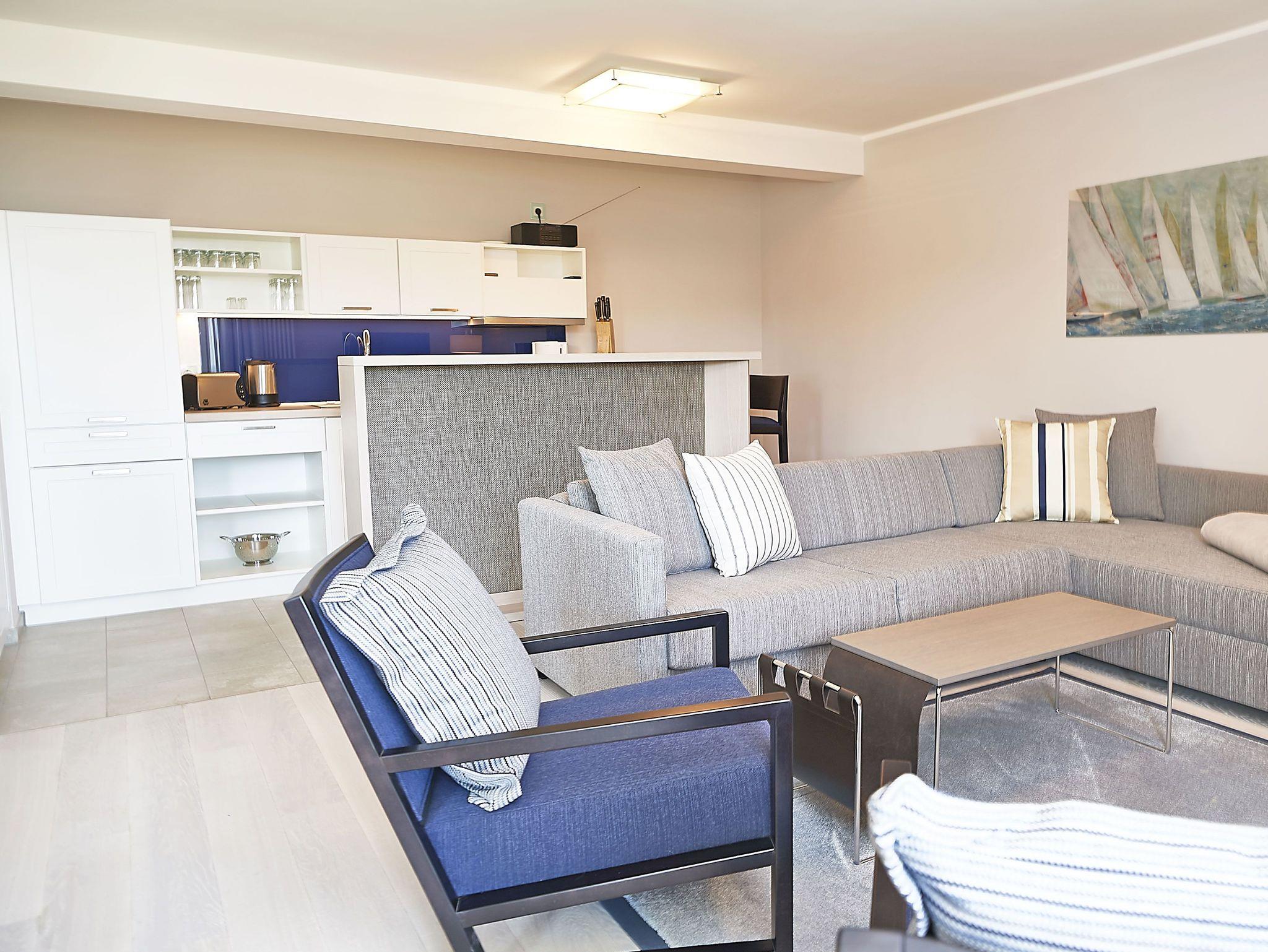 Vom Eingangsbereich aus gelangen Sie in den modern ausgestatteten Wohnbereich mit Couchgarnitur, einem Flachbild-TV, einem Radio mit USB-Anschluss, Bluetooth und Internet, einem Essplatz und einer Küchenkomplettzeile mit zusätzlichen Barhockern. Vom großen Balkon und sogar vom Bett aus können Sie die Weite der Ostsee genießen. Die Balkonmöbel stehen saisonal - in der Regel von Mai bis Ende September - zur Verfügung.