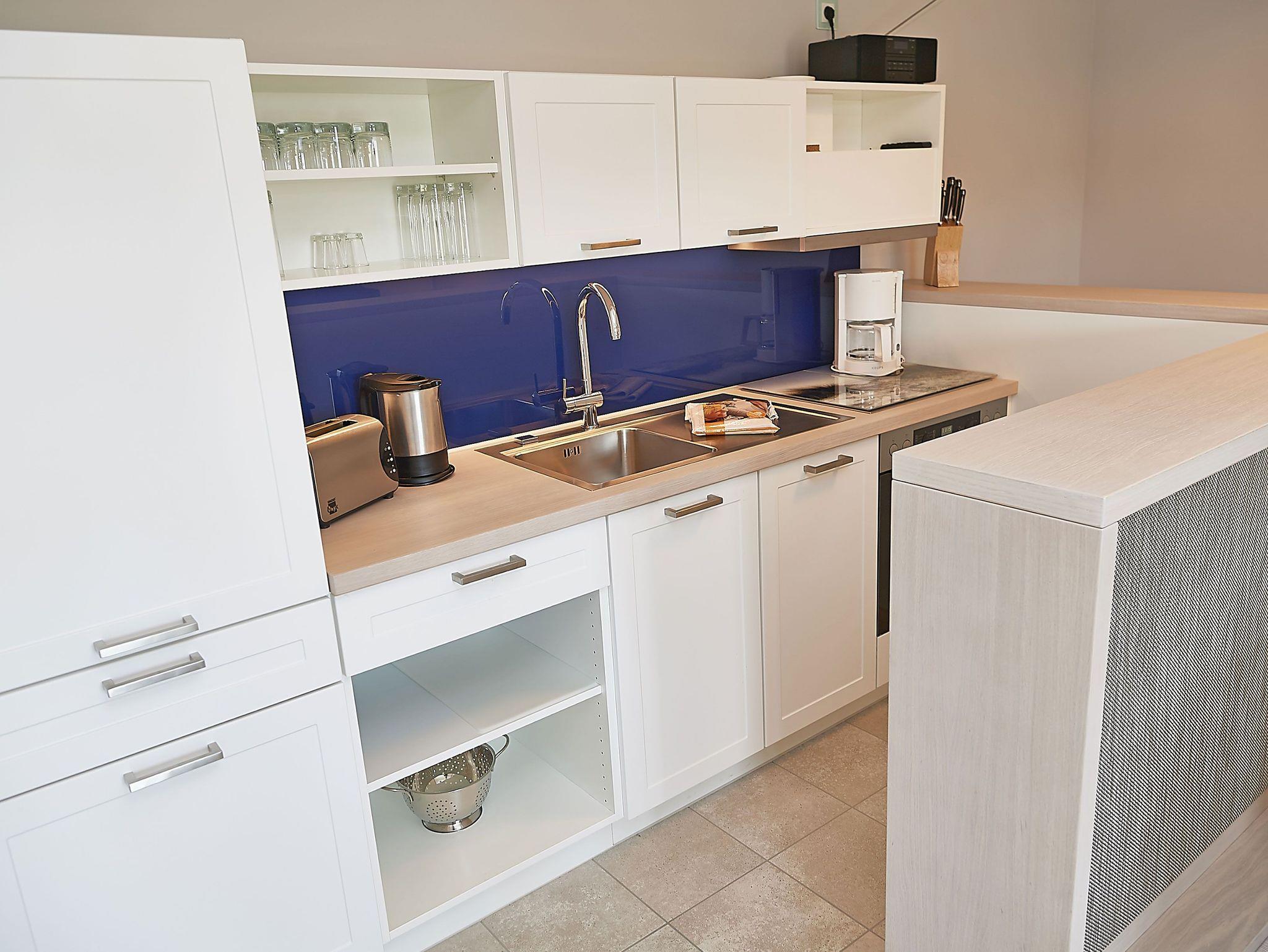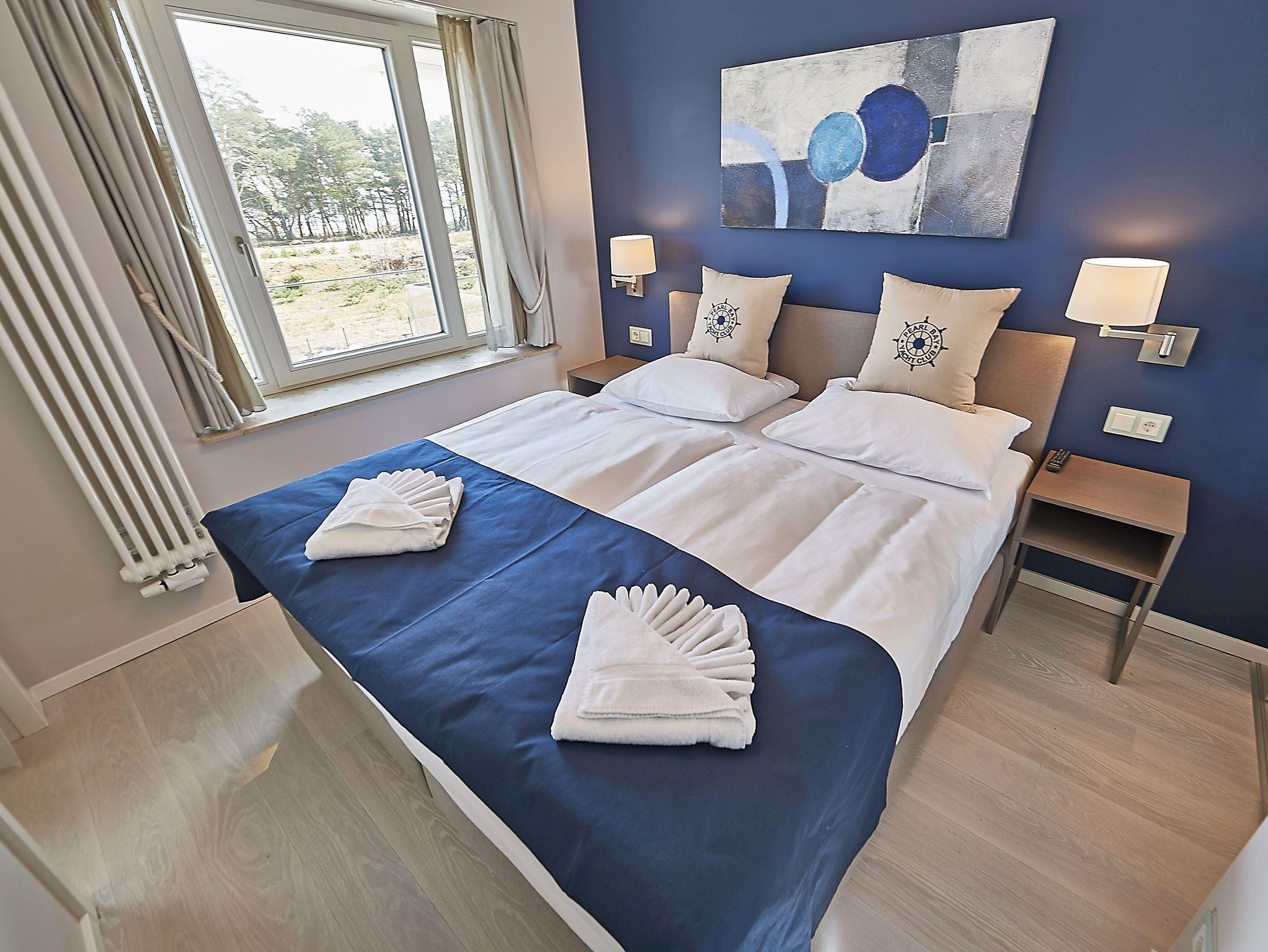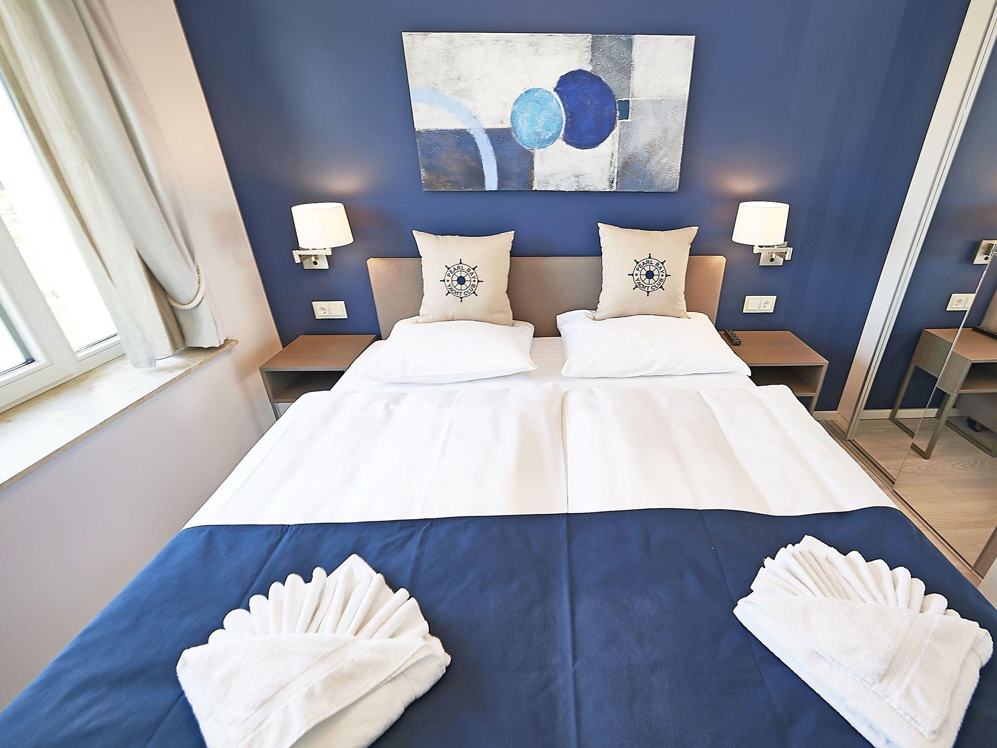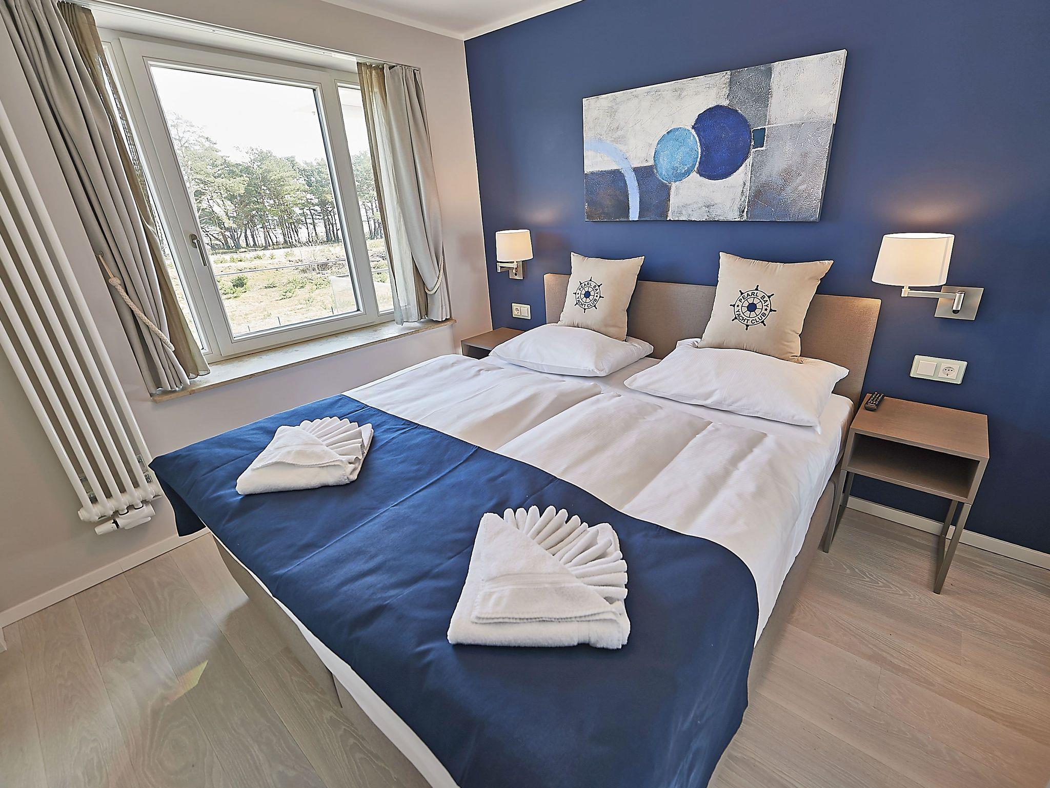 Vom Eingangsbereich aus gelangen Sie in den modern ausgestatteten Wohnbereich mit Couchgarnitur, einem Flachbild-TV, einem Radio mit USB-Anschluss, Bluetooth und Internet, einem Essplatz und einer Küchenkomplettzeile mit zusätzlichen Barhockern. Vom großen Balkon und sogar vom Bett aus können Sie die Weite der Ostsee genießen. Die Balkonmöbel stehen saisonal - in der Regel von Mai bis Ende September - zur Verfügung.