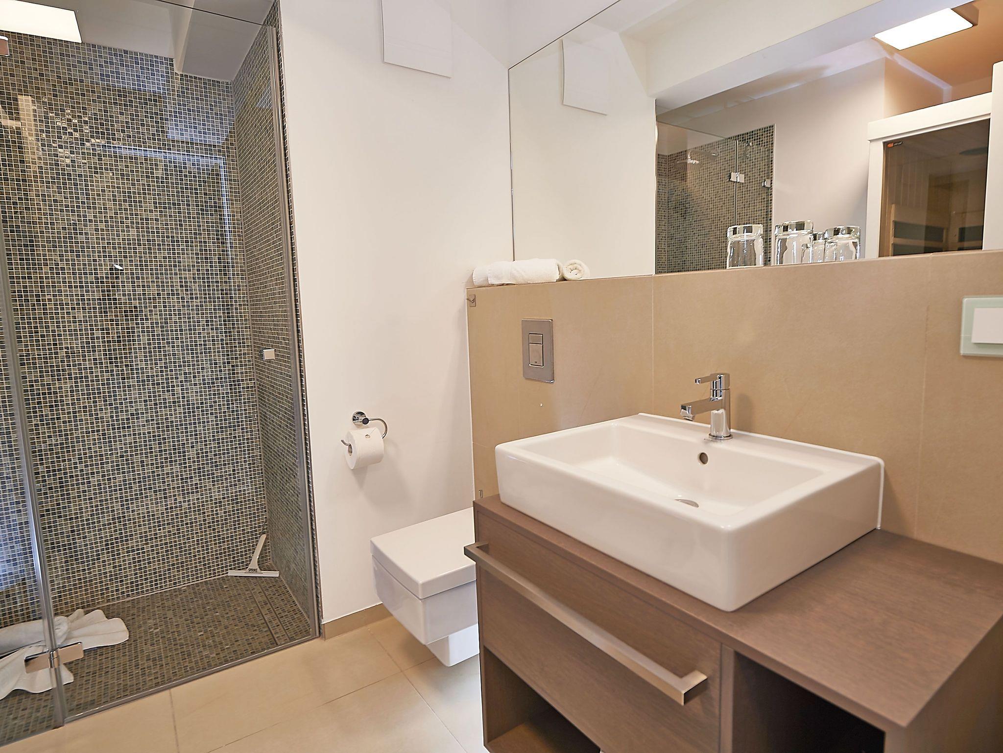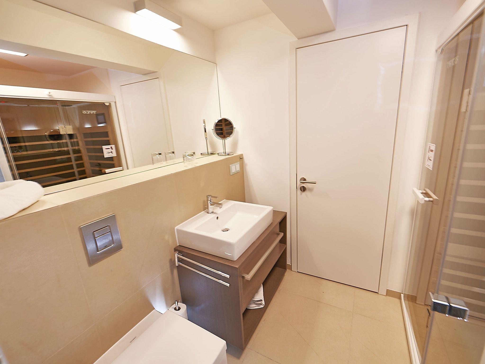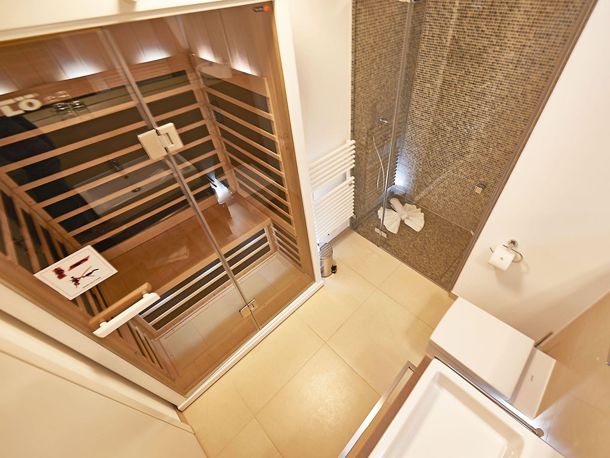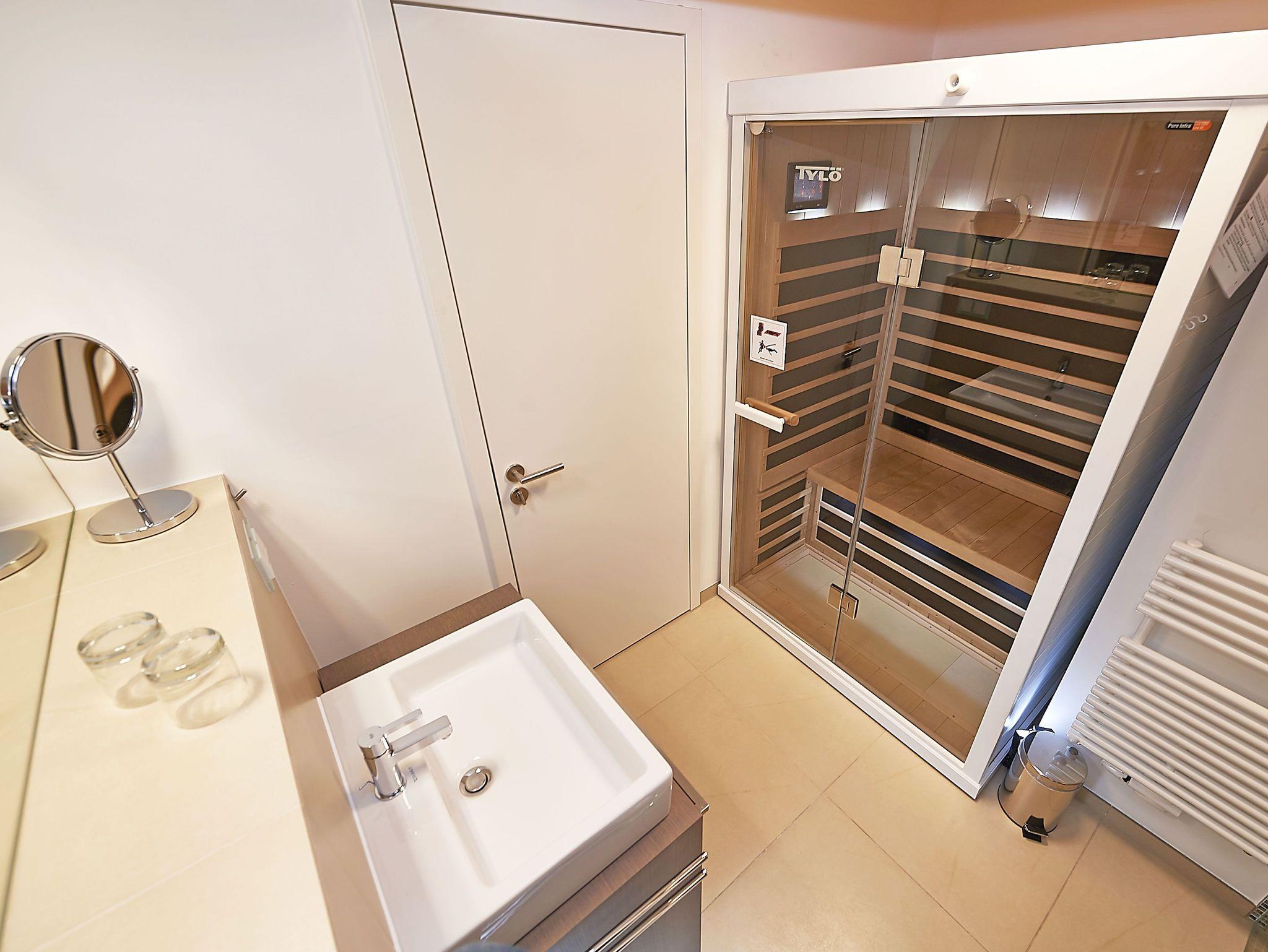 Die Wohnung verfügt weiterhin über ein modern gefliestes Badezimmer mit bodengleicher Dusche sowie eine Infrarotkabine der Marke Tylö für zwei Personen.