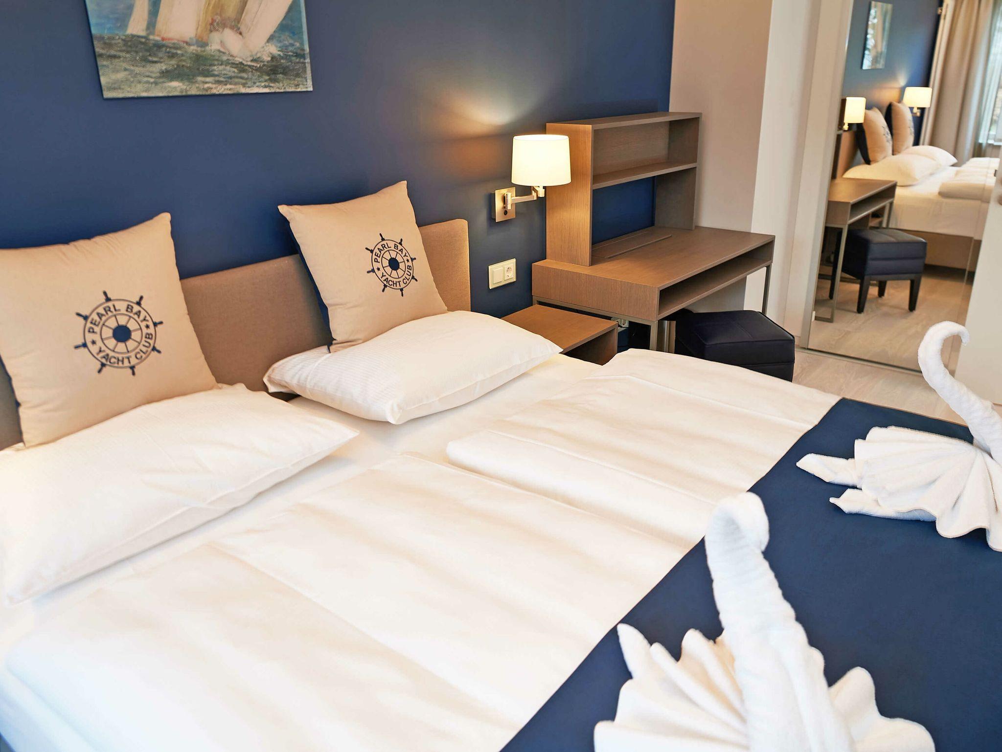 Beide Schlafzimmer sind jeweils mit komfortablen Boxspring-Betten (1,80 x 2,00 m) ausgestattet. Im großen Schlafzimmer befinden sich darüber hinaus ein weiterer Flachbild-TV und ein Safe.