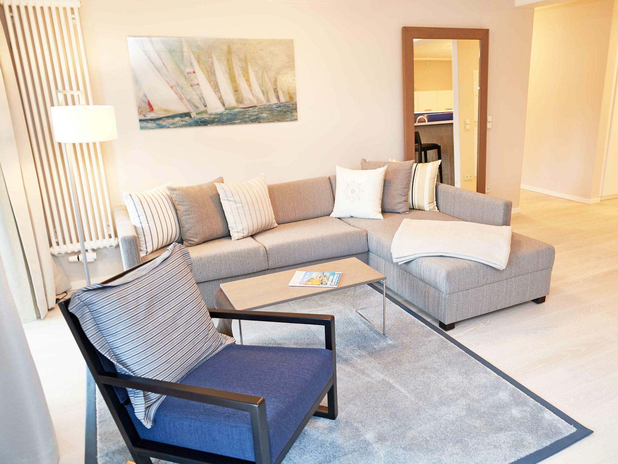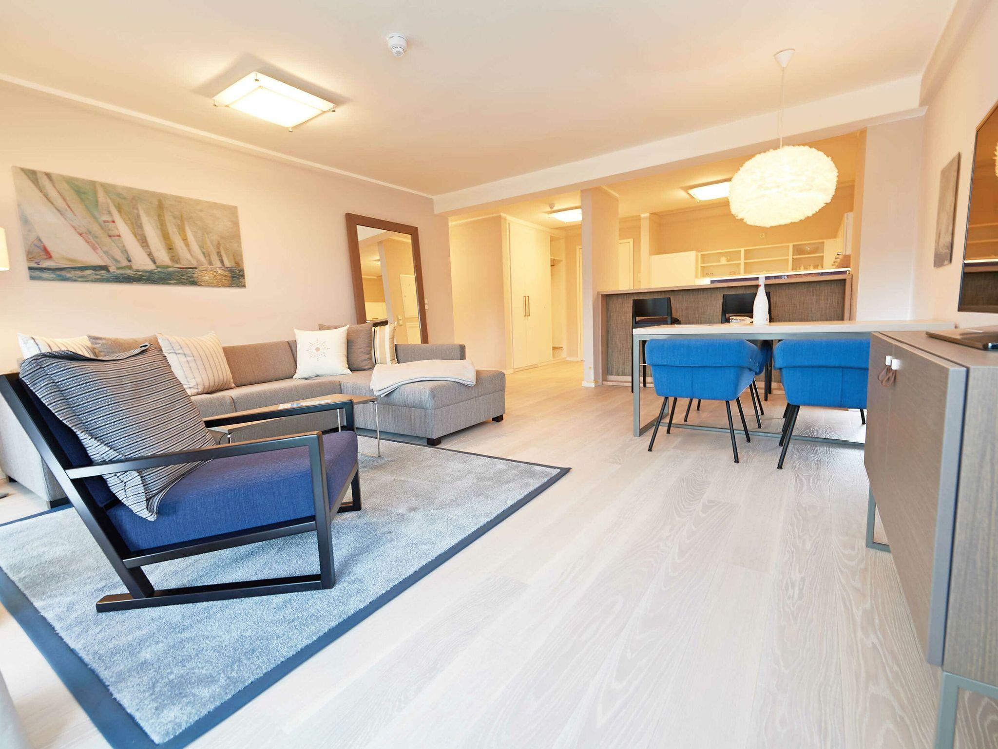 Vom Eingangsbereich aus gelangen Sie in den modern ausgestatteten Wohnbereich mit Couchgarnitur sowie einem Essplatz für bis zu 4 Personen und einer separierten Küchenzeile. Im Wohnbereich finden Sie einen Flachbild-Fernseher mit Home Cinema System, Radio und Blu-ray/DVD/CD Player.