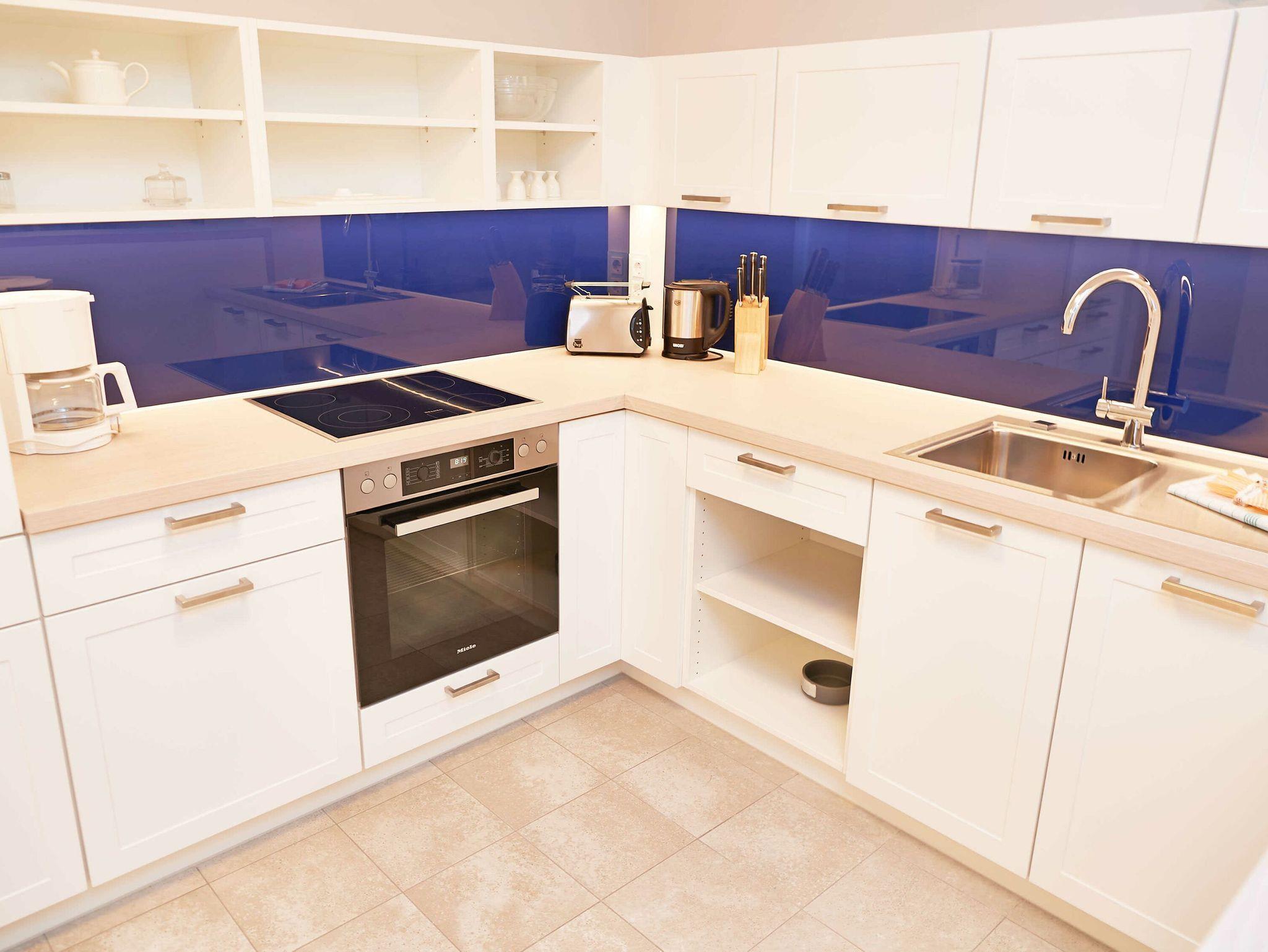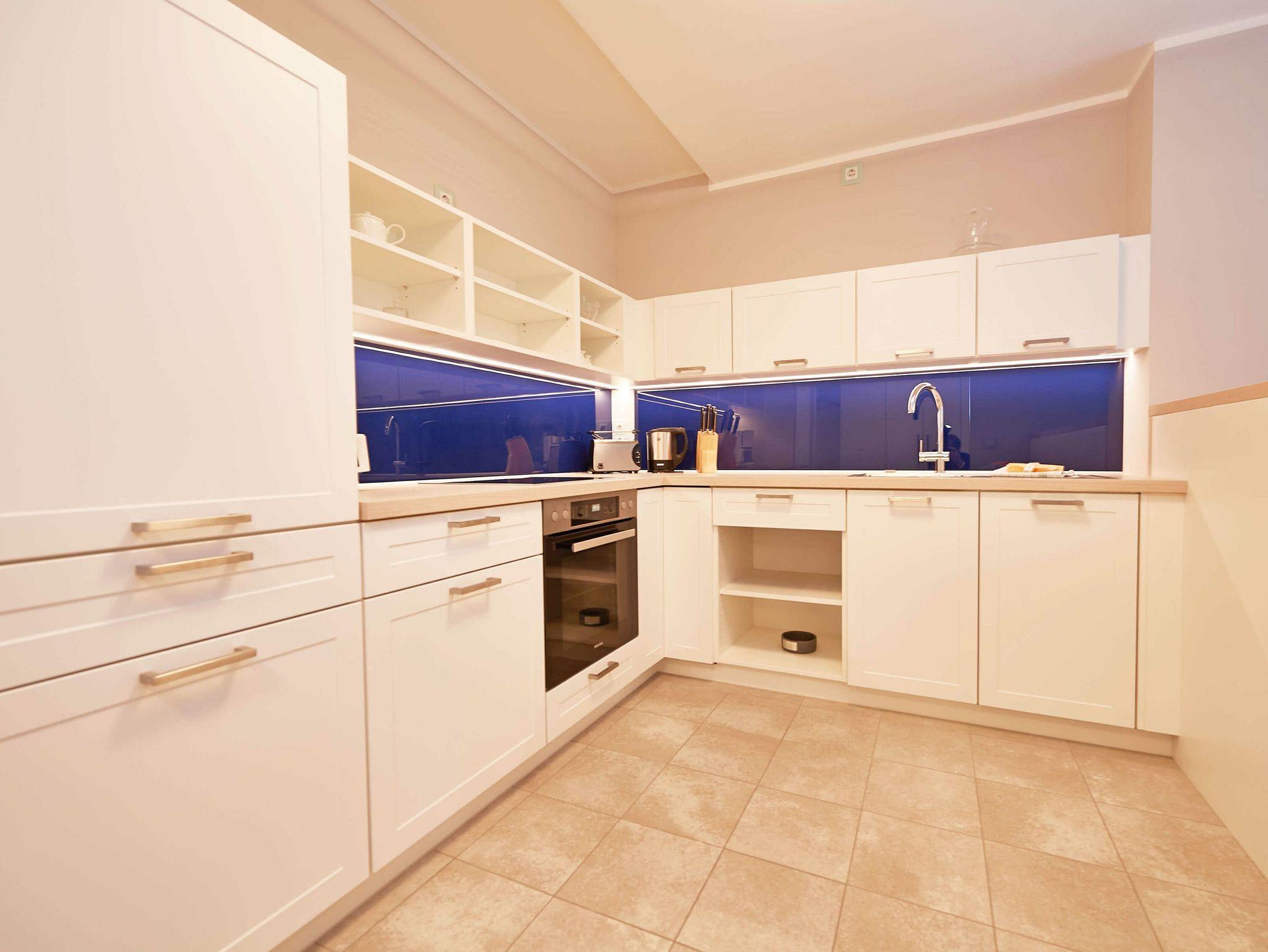 Die voll ausgestattete Küchenzeile beinhaltet u.a. einen Kühlschrank mit Gefrierfach, einen Backofen, ein 4-Platten-Ceranfeld, eine Spülmaschine, Kaffeemaschine, Wasserkocher, Toaster und diverses Kleininventar, das die Küchenausstattung komplettiert.