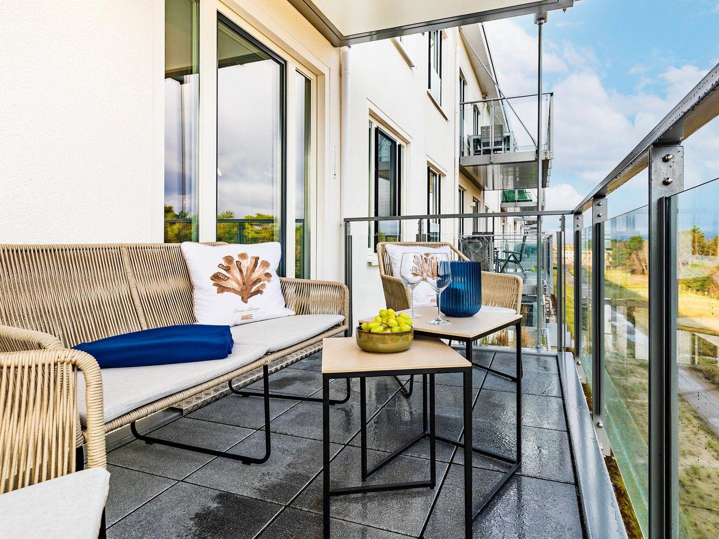 - Balkon mit Tisch und 4 Stühlen, Blick auf das Meer