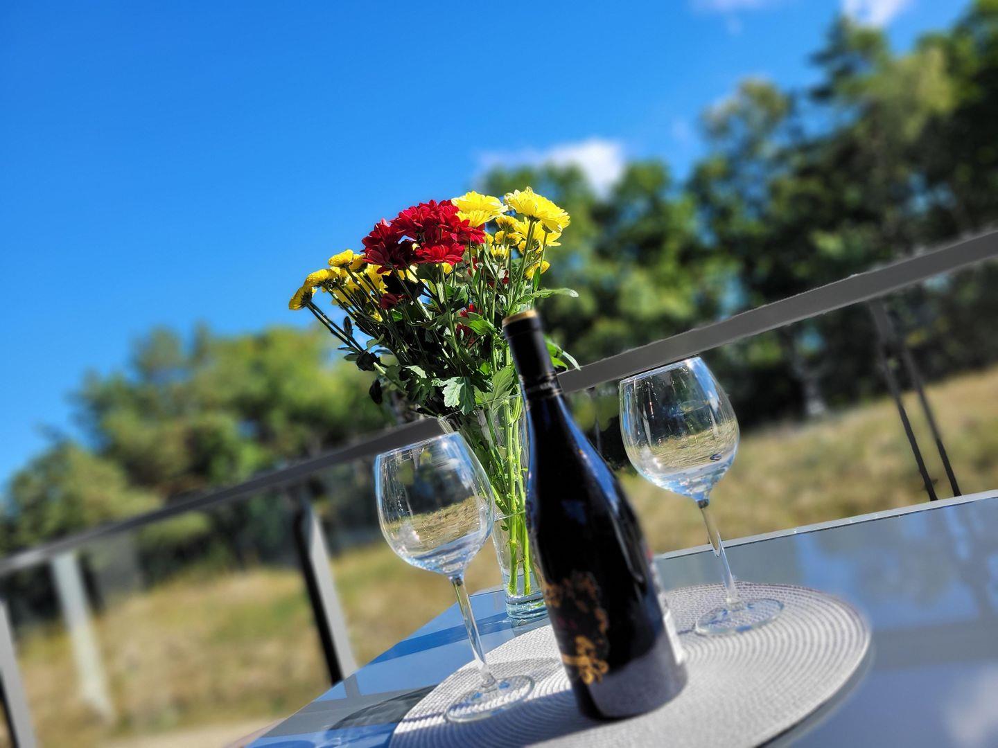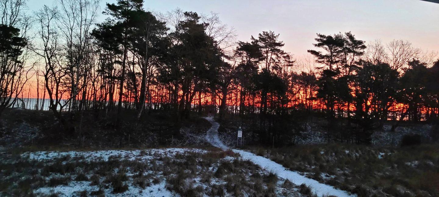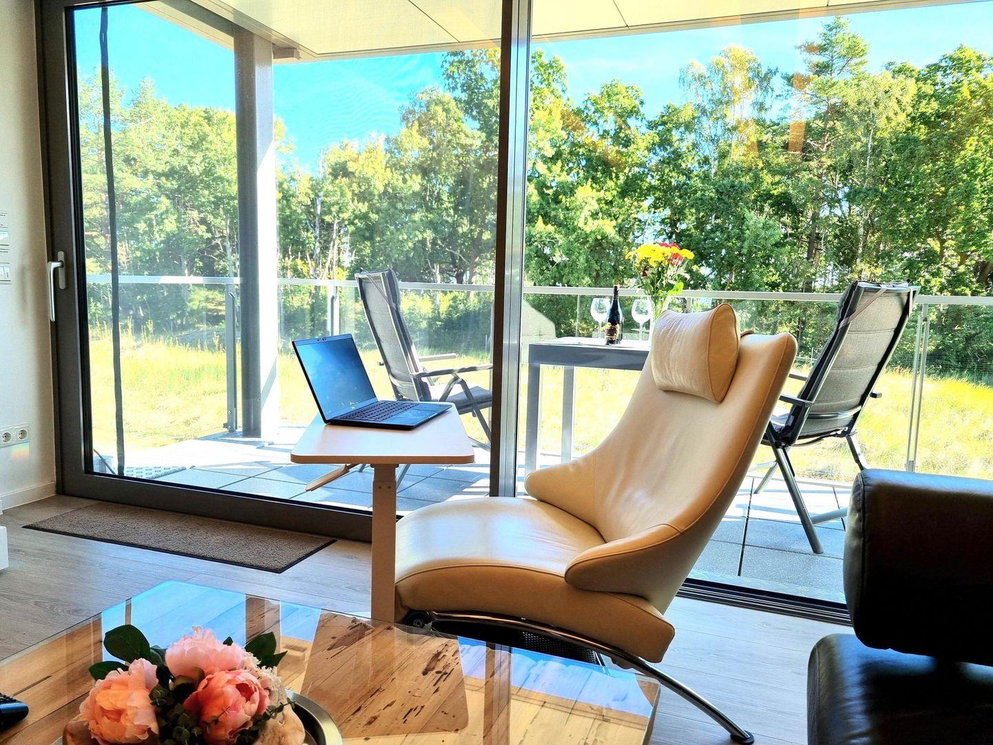 - Balkon: Sitzmöglichkeit für 5 Personen, Blick durch den Dünenwald auf das Meer