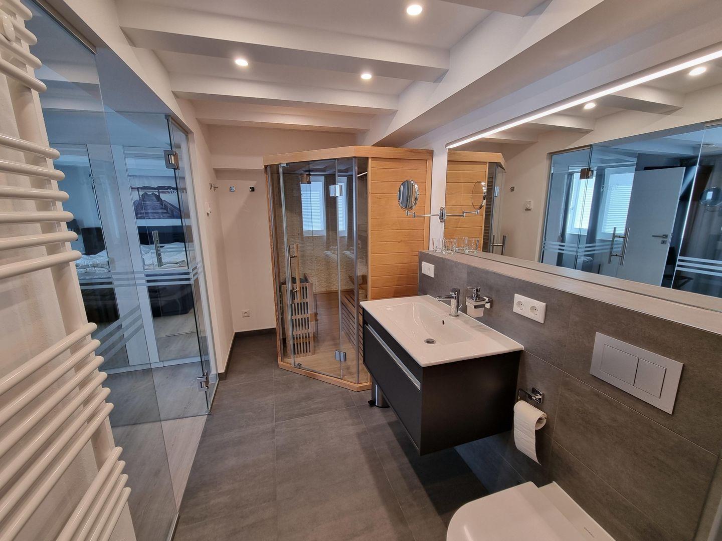 - Badezimmer 1: Sauna, Regendusche, WC, Haartrockner