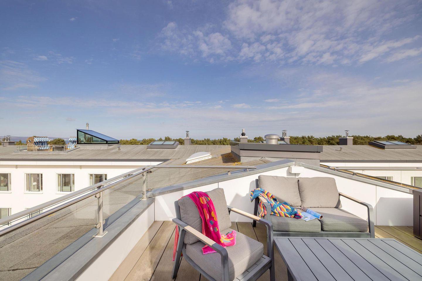 Den Blick über die Düne schweifen lassen, zwischen den Bäumen lugt schon das Meer hervor. "Dünenblick" heißt dieses Appartement, das sich im 3. Obergeschoss befindet. Bodentiefe Fenster mit einem Glasbalkon geben den Blick auf die Ostsee frei. Ankommen, Koffer liegen lassen, über die Düne und mit wenigen Schritten sind Sie am Meer. Frische Seeluft und Wellenrauschen, feinster Sandstrand soweit das Auge reicht, so kann ein entspannter Urlaub beginnen.