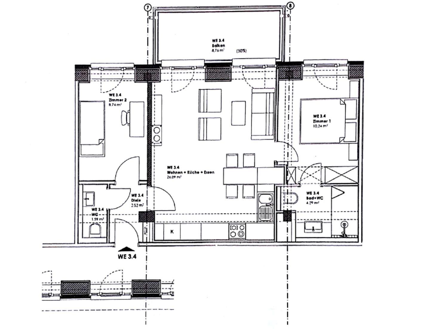 - Wohn/Essbereich: Sofa, Essbereich, TV, Zugang zum Balkon