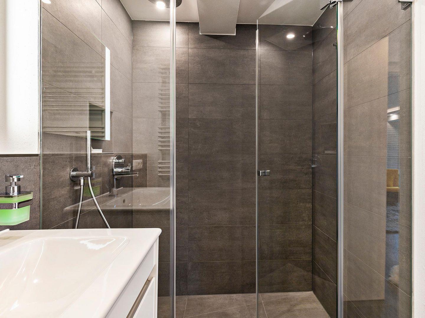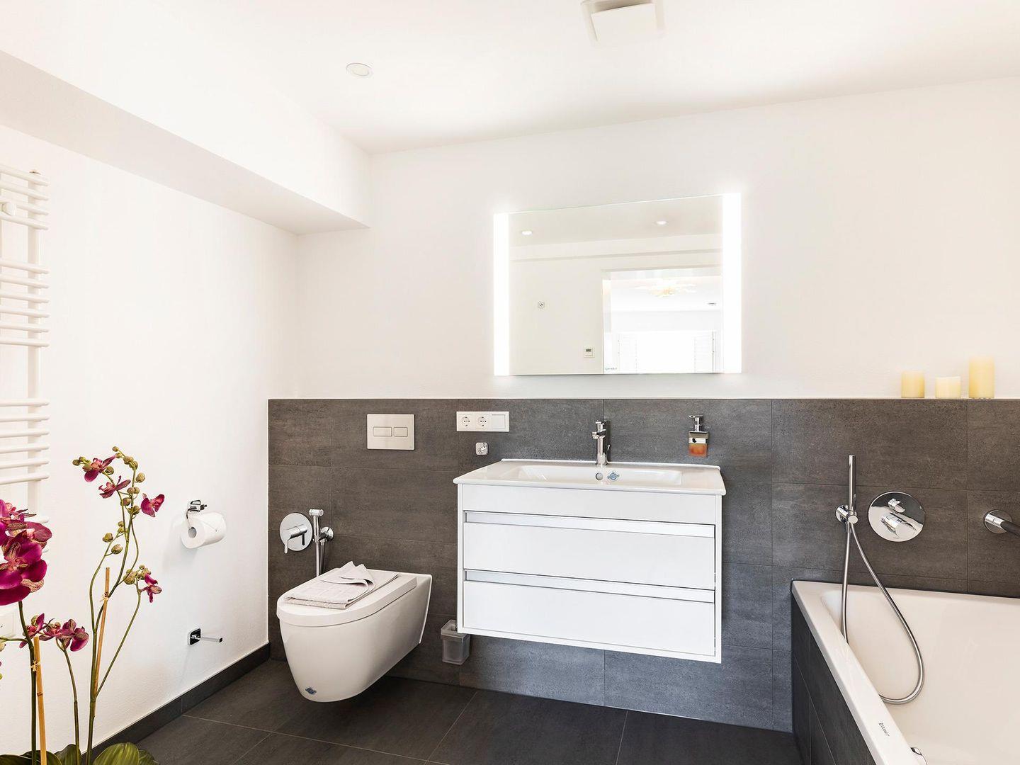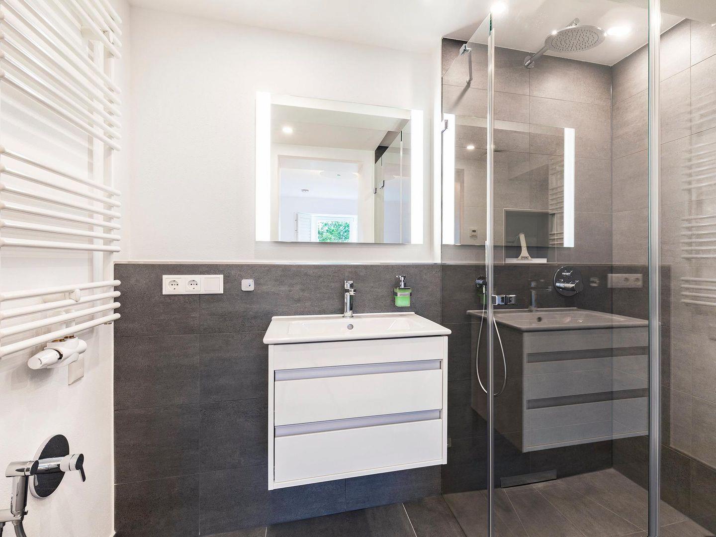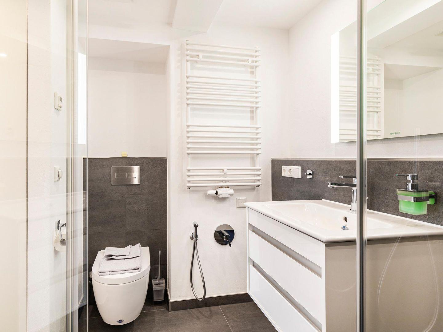 - Badezimmer 1: Regendusche, WC, Badewanne und Föhn