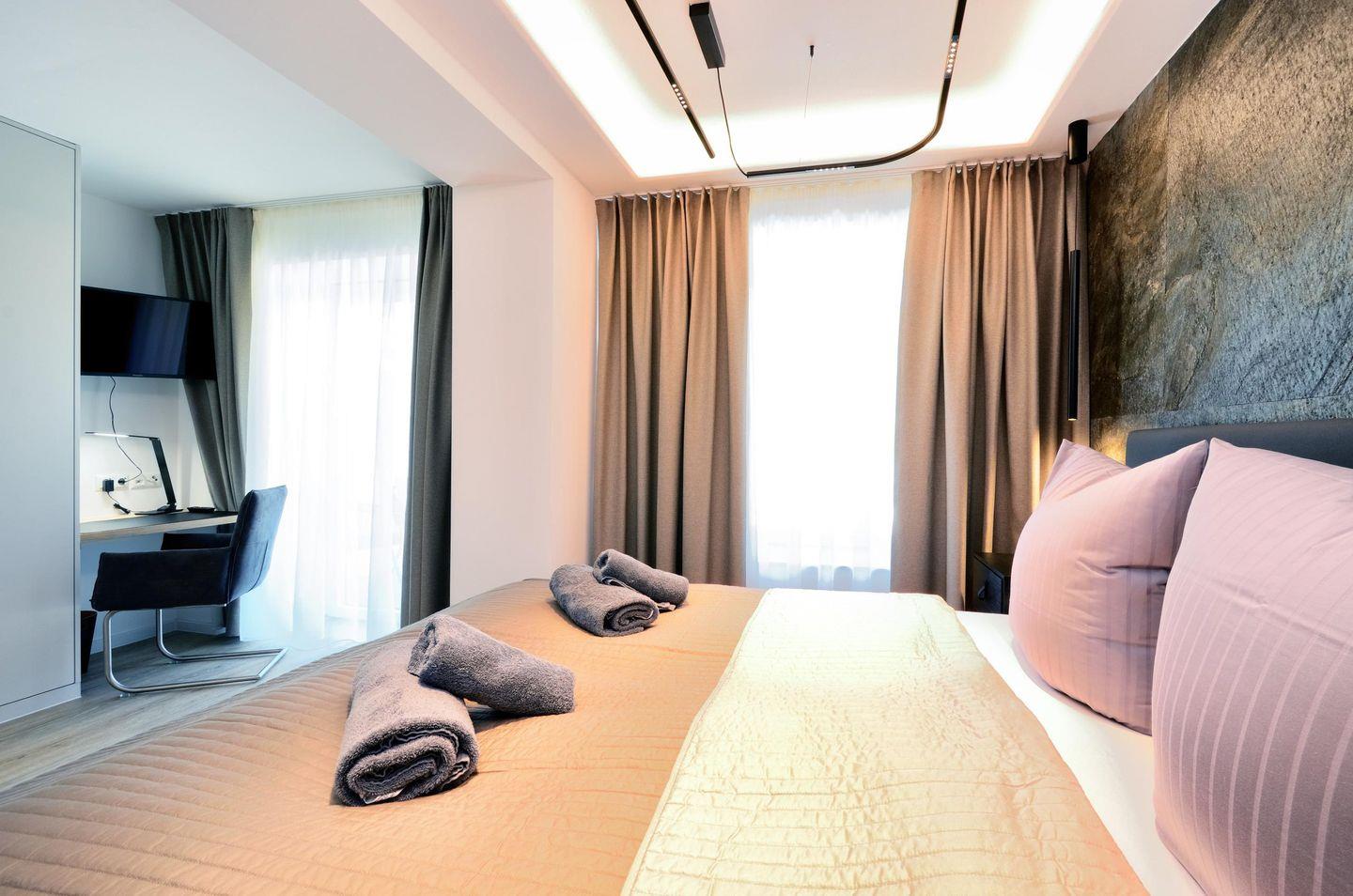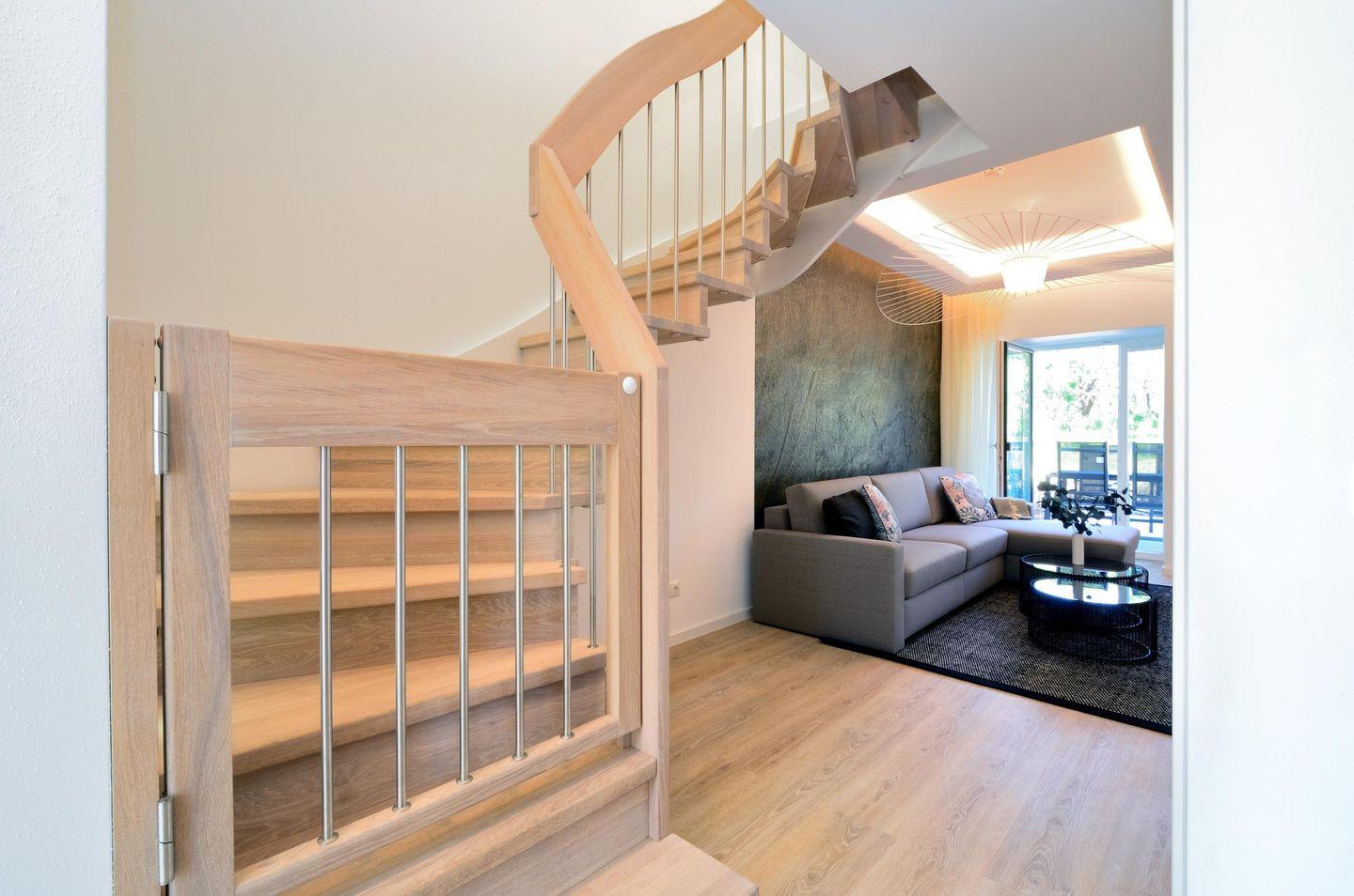 Wenn Sie sich für das GOODDAYS entscheiden, dürfen Sie sich auf eine Ferienwohnung der Extraklasse freuen. Die hochwertig möblierte 3-Zimmer-Maisonette-Wohnung überzeugt durch die exklusive Möblierung, sowie ein angenehmes Wohngefühl durch den Einsatz von natürlichen Materialien auf den zwei Ebenen. Eine ideale Familienwohnung, insbesondere für Familien mit kleinen Kindern. Im Elternschlafzimmer befindet sich ein Boxspringbett eines namenhaften Herstellers, der sich auf Luxushotels spezialisiert hat. Hier werden Sie wie auf Wolken schlafen. Im Kinderzimmer finden auch die Kleinsten ein gemütliches Schlafplätzchen. Zum einen steht ein Etagenbett (mit Rausfallschutz) zur Verfügung. Das Bett wurde aus massivem Buchenholz von allerhöchster Qualität gefertigt und mit hochwertigen Beschlägen ausgestattet, somit ist es sowohl für Kinder als auch für Erwachsene geeignet. Für die Kleinsten steht zudem ein rollbares Gitterbettchen (60cmx120cm) bereit. Die Schlafzimmer sind jeweils mit Schreibtischen und großen, geräumigen Kleiderschränken ausgestattet. Zwischen den Zimmern befindet sich das Designer- Badezimmer mit großem Duschbereich, in dem auch die Babybadewanne noch Platz hat.