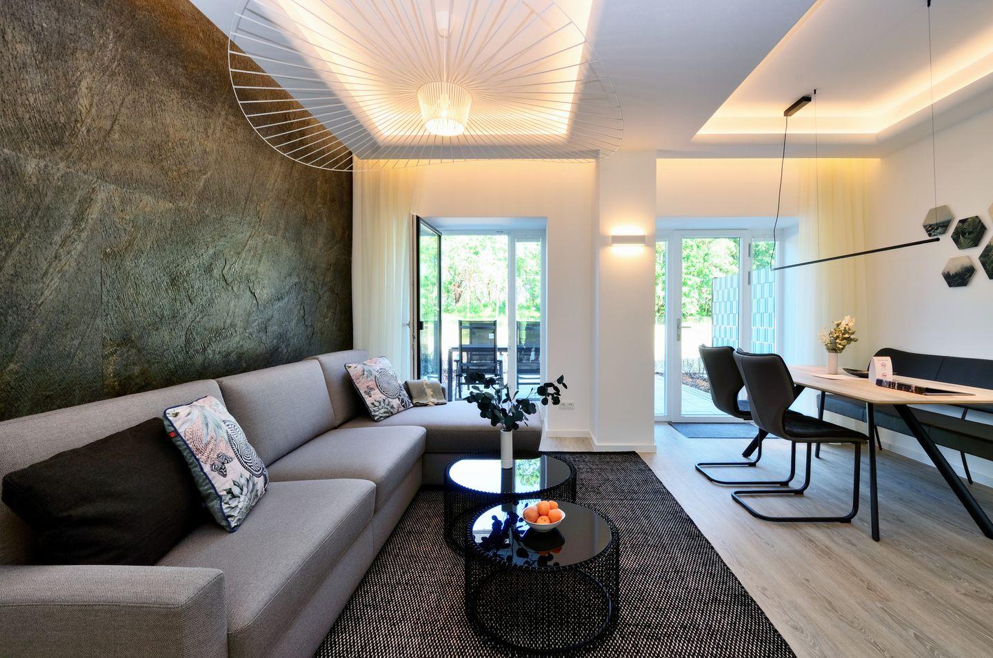 - Wohn/Essbereich: Sofa, Sitzbereich, Essbereich, TV, Zugang zur Terrasse