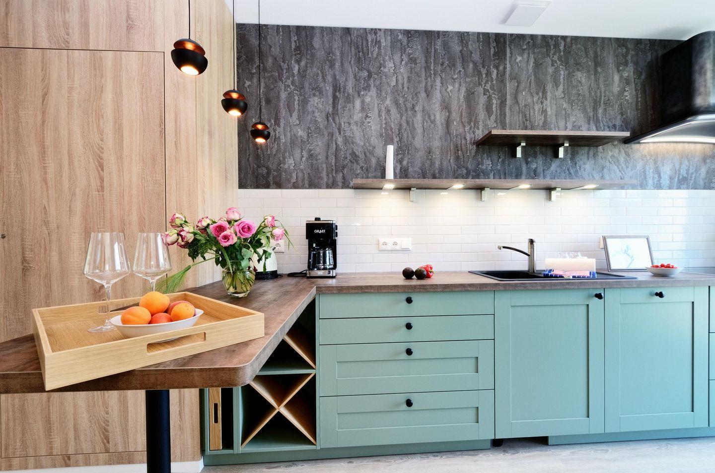 Im unteren Bereich befindet sich das Gäste-Bad und die top ausgestattete Küche mit hochwertigen Markengeräten. In die Küche integriert ist ein kleiner Tresen mit Barhockern. Auch im angrenzenden Ess- und Wohnbereich wurde wieder großen Wert auf hochwertige Einrichtungsgegenstände mit außergewöhnlichem Design und Materialien gelegt. Bei Regenwetter könnte der riesige 85 Zoll LED-Fernseher die Zeit bis zum nächsten Abenteuer überbrücken.