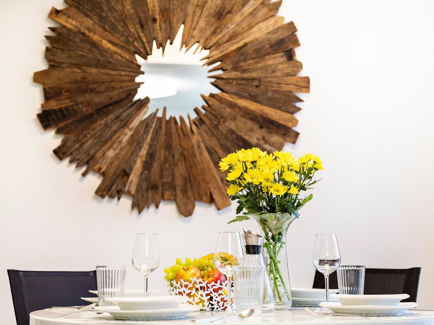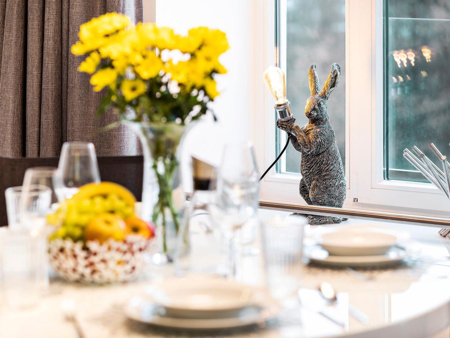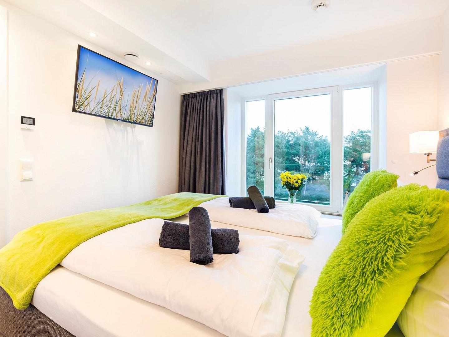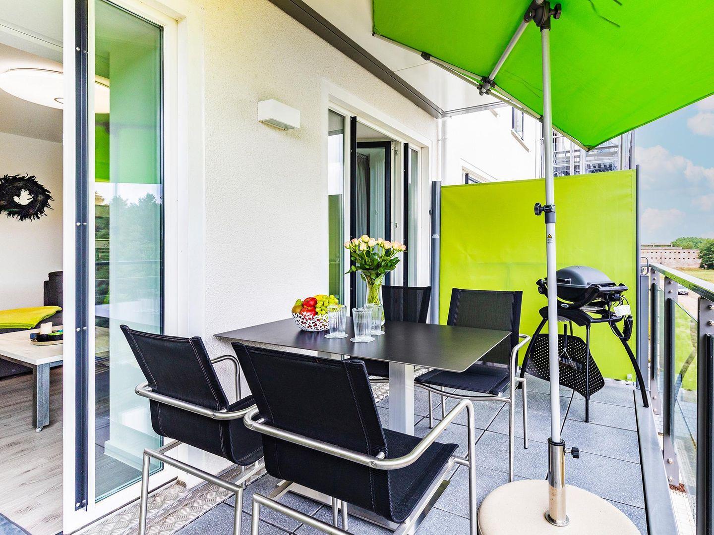 Eine moderne Essgruppe bietet direkte Aussicht Richtung Ostsee. Alle Fenster im Apartment können verdunkelt werden. Sofern Sie mit offenem Fenster schlafen, können Sie das Rauschen der Ostsee-Wellen genießen.