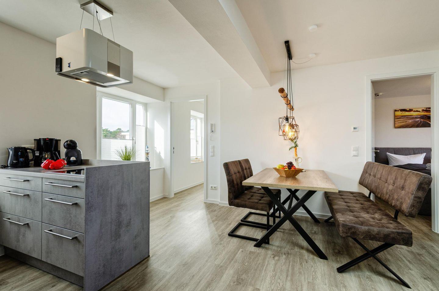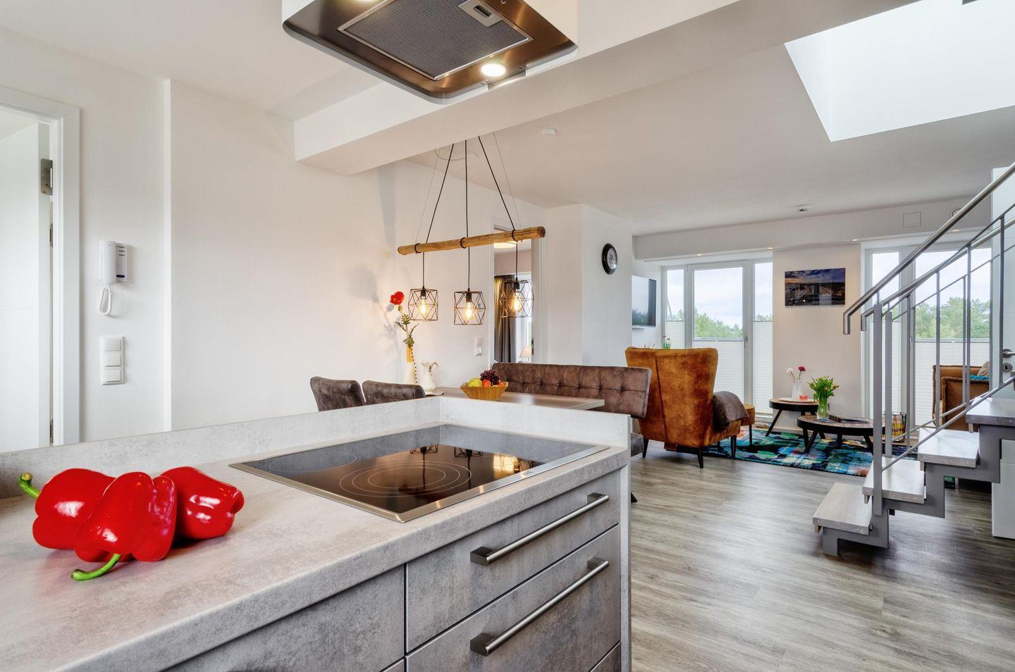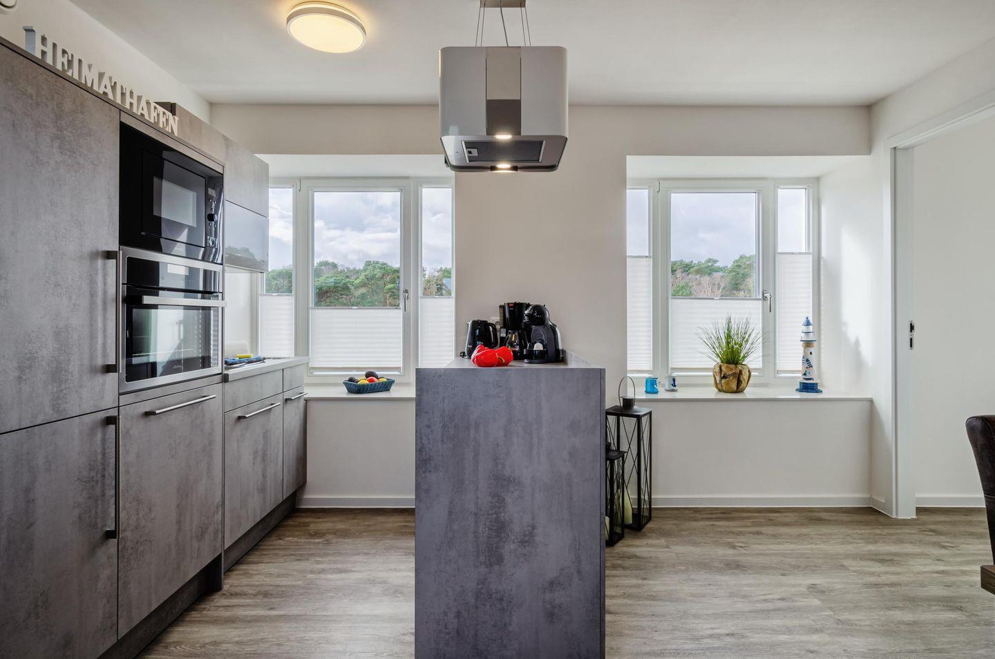 Hier bin ich Mensch ? Hier darf ich es sein. Im Heimathafen im 5. Obergeschoss mit dem Blick auf das Meer, dem Geruch der frischen Brise, dem wiegen der Bäume und dem Gefühl des Loslassens, kurz: jetzt ist Urlaubszeit. Koffer fallen lassen und schnell hinauf auf die Dachterrasse. Sie werden begeistert sein. In diesem Nichtraucher-Apartment werden Sie sich sofort wohlfühlen. Ein offener Wohn- und Kochbereich empfängt Sie. Bodentiefe Fenster geben den Blick frei, von hier aus können Sie auch den verglasten Balkon betreten. In zwei gemütlichen Schlafzimmern können Sie, mit Blick zum Meer und dem flüstern der Wellen, seelenruhig einschlafen. Sie haben hier die Möglichkeit gemeinsam oder getrennt zu Duschen, ein zweites Bad steht Ihnen ebenfalls zur Verfügung.