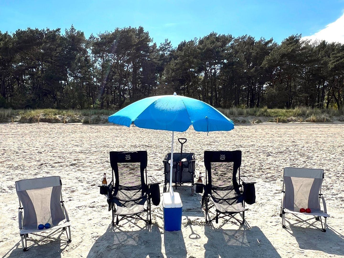 - Strandpaket mit Bollerwagen, Stühle, Sonnenschirm, Strandmuschel und -spiele, Kühlbox und Geschirr