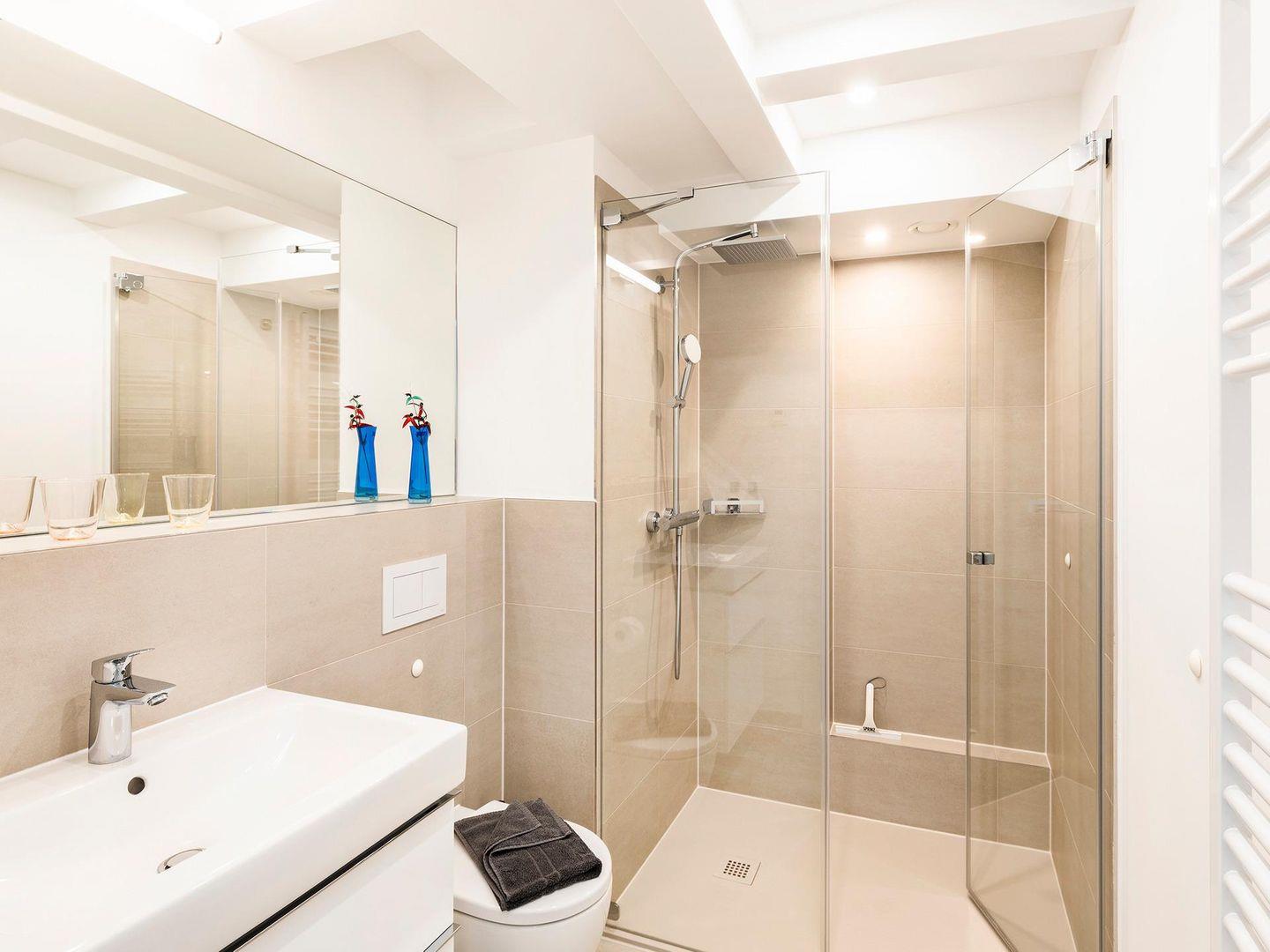 - Badezimmer 1: Regendusche, WC, Waschbecken, Handtuchheizung, Haartrockner, Kosmetikspiegel
