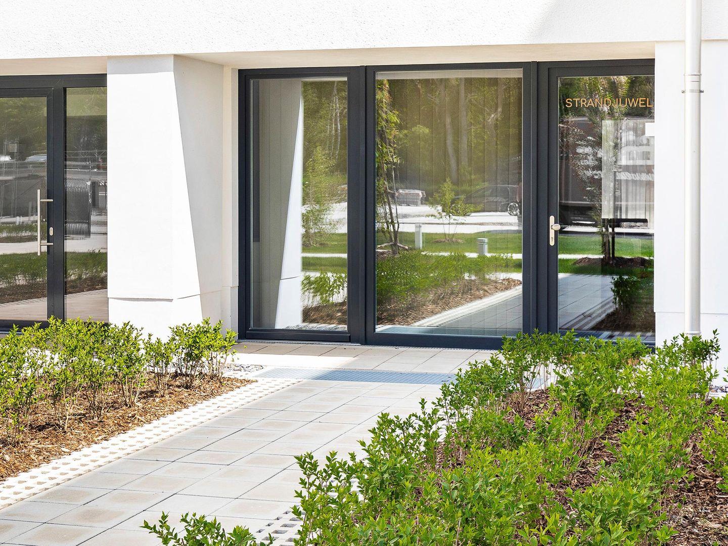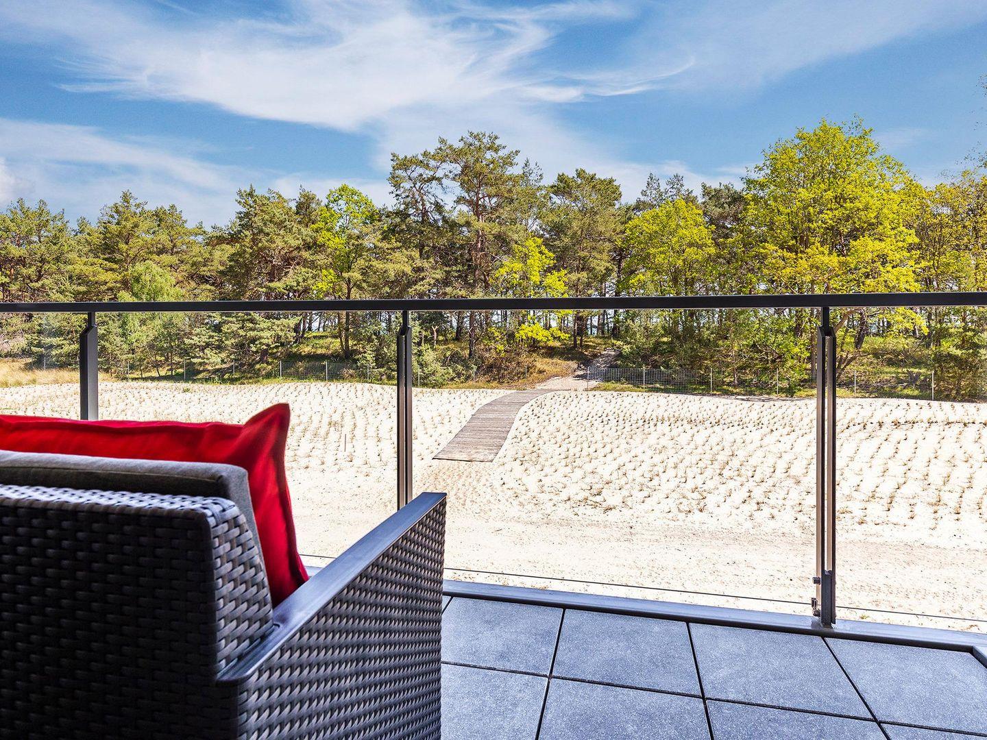 - Terrasse: Sonnenschirm und Sitzmöglichkeit mit Blick auf Dünenlandschaft (Seeseite)
