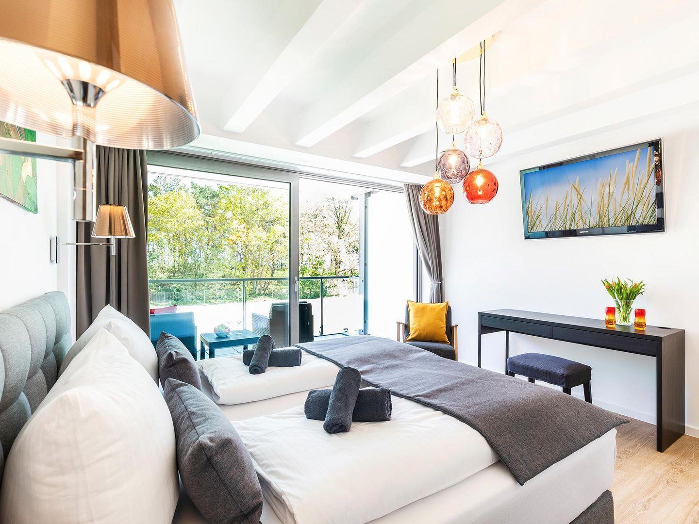 - Schlafzimmer 1: Doppelbett (180x200), Smart-TV, Kleiderschrank, Ganzkörperspiegel, Verdunklungsgardinen, Insektenschutzgitter, Zugang zum Balkon