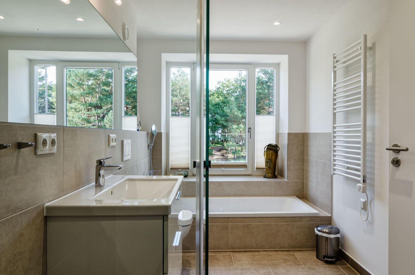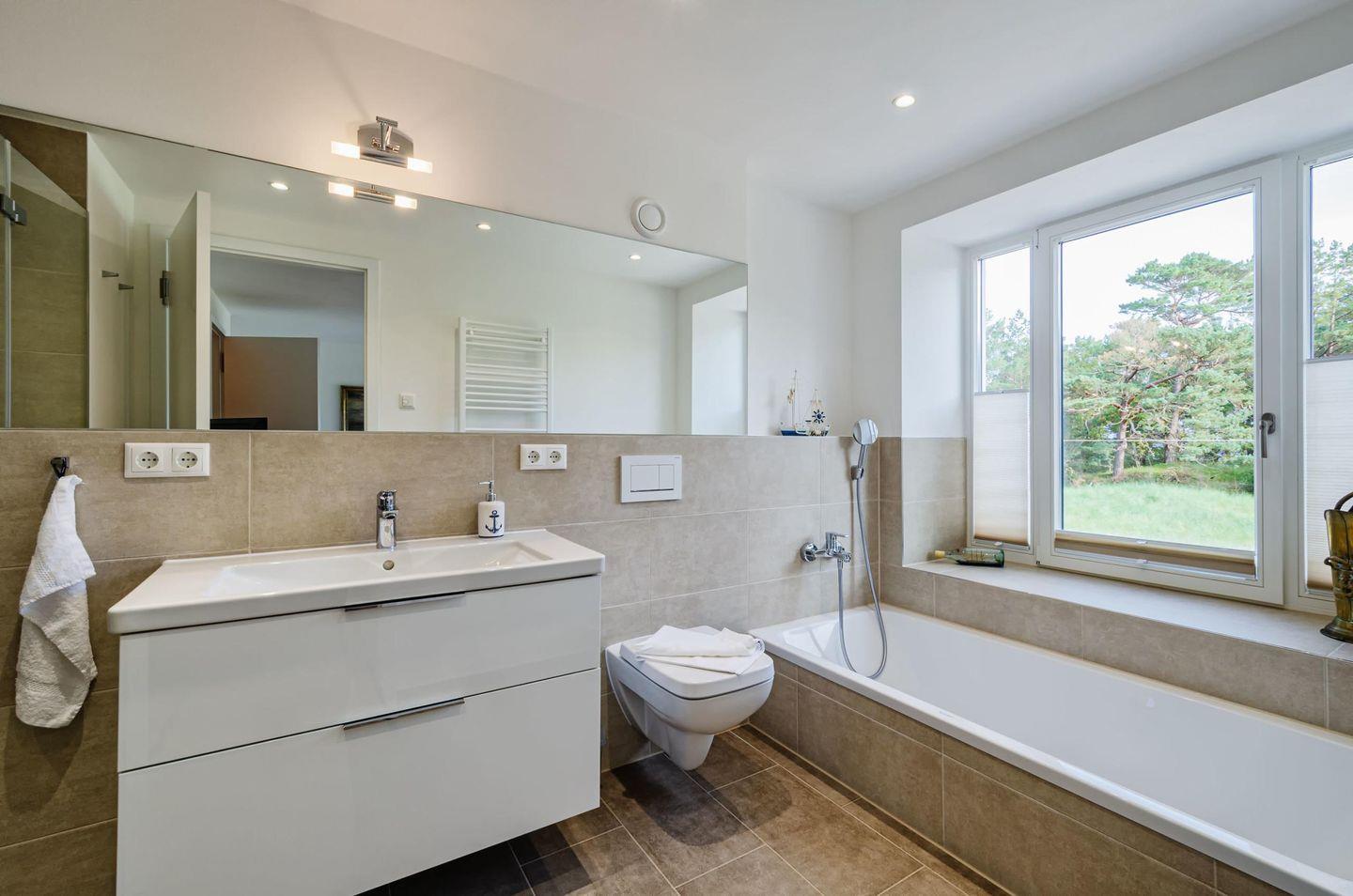 Eine geschwungene Treppe führt Sie hinauf in das erste Obergeschoss, hier erwarten Sie 2 Bäder und 3 Schlafzimmer, die Schlafplätze für bis zu 6 Personen bieten. Eines der Schlafzimmer grenzt direkt an das Master-Badezimmer an, in welchem Sie neben einer Dusche auch eine Badewanne, mit Ausblick zum Meer und dem Dünenwäldchen, erwartet.
