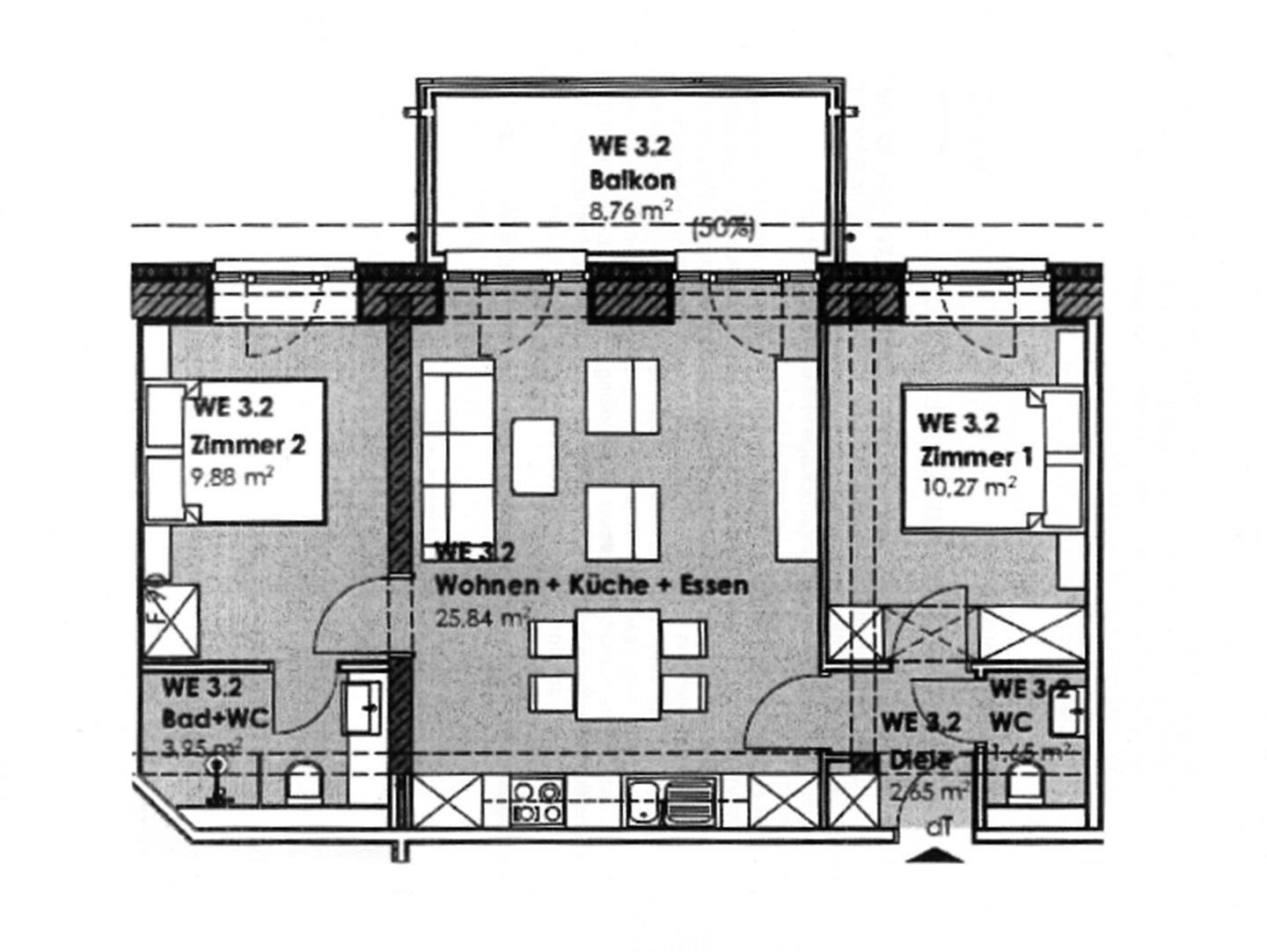 - Wohnzimmer: Sofa, TV, Zugang zum Balkon