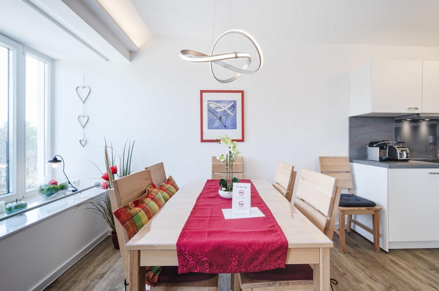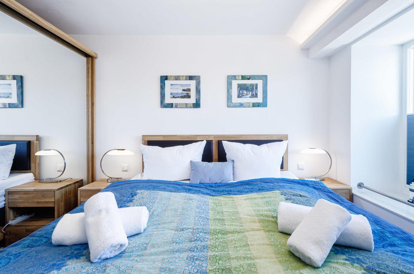 Im Haus Stubnitz angekommen gelangen Sie mit dem Aufzug ins 4. Obergeschoss, wo sich das 2-Zimmerapartment "SeeMelodie" befindet. Das geschmackvoll mit farbigen Akzenten modern eingerichtete Apartment verfügt über einen geräumigen Wohn-Essbereich mit offener Küche. Eine Schlafcouch bietet optional auch einer 3. Person Platz ohne Enge zu verbreiten. Auch Hunde finden in diesem Bereich ein gemütliches Hundeschlafbett. Im Küchenbereich finden Sie alles, was zur kulinarischen Versorgung erforderlich ist. Sie können die Mahlzeiten gemütlich am Esstisch vor dem Fenster einnehmen oder setzen sich auf den Balkon. Genießen Sie dabei den Blick über den Kiefernwald aufs Meer und lauschen Sie der Seemelodie. Das Schlafzimmer mit Boxspringbetten für 2 Personen vermittelt jene entspannende Atmosphäre, wie sie für einen erholsamen Schlaf erforderlich ist. Im bodenbeheizten Badezimmer finden Sie neben der bodengleich begehbaren Duschkabine mit Regendusche alles, was man in einem modern eingerichteten Badezimmer erwartet.
