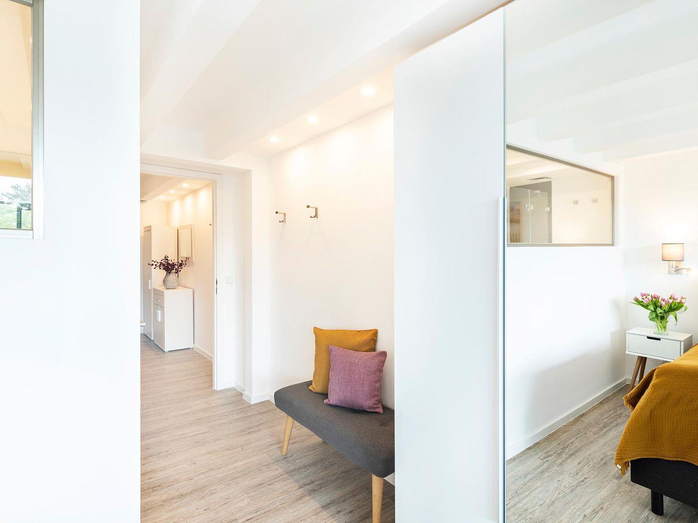 - Schlafzimmer 2: Doppelbett (180 x 200), Kleiderschrank, TV, Verdunklungsgardinen