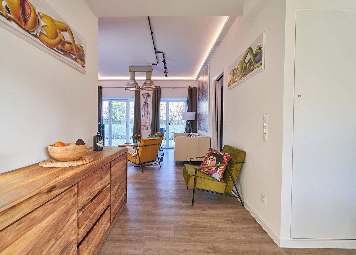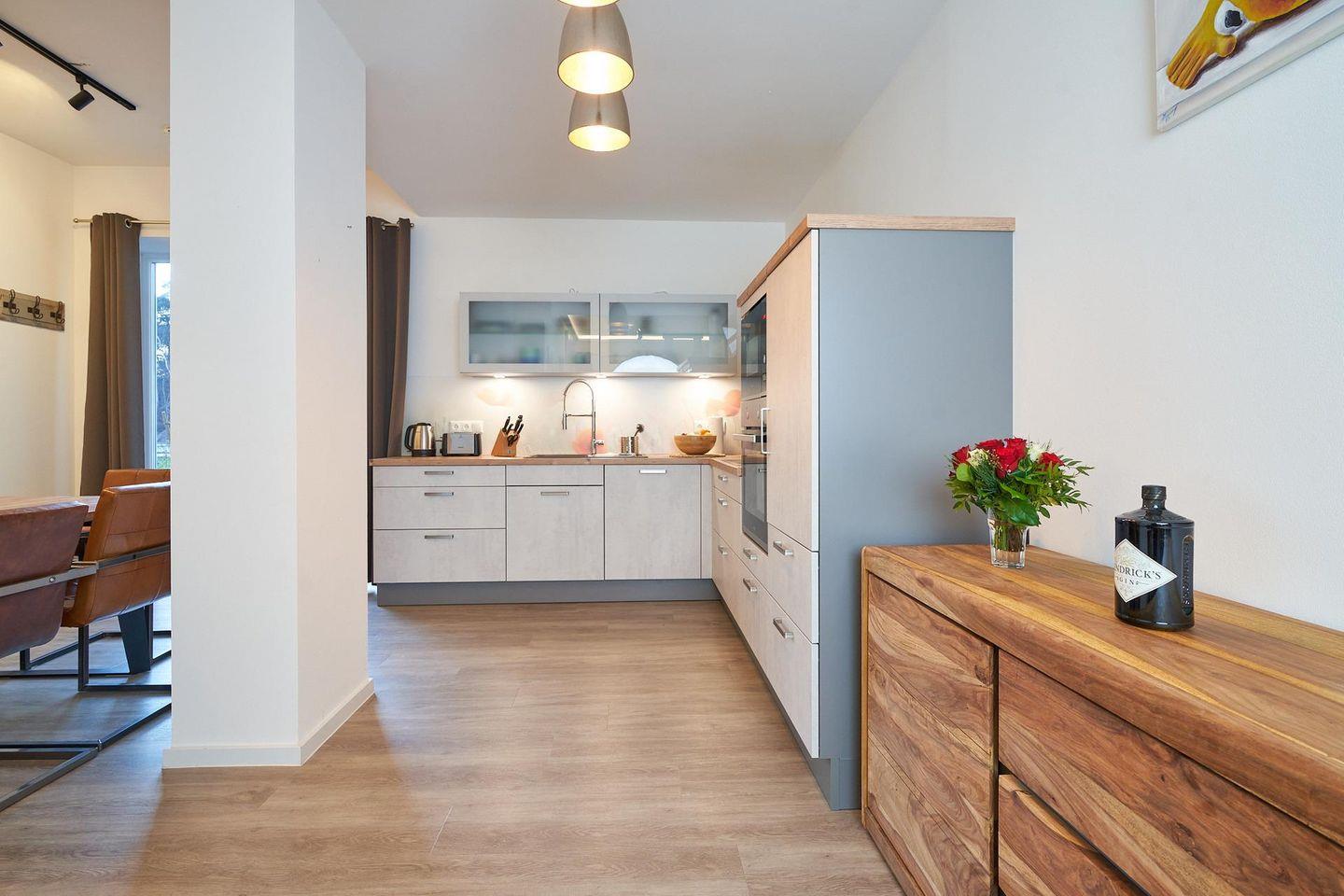 Hinter dieser Ferienwohnung im Erdgeschoss des Hauses Hiddensee verbirgt sich eine luxuriöse ausgestattete Nichtraucherwohnung. Dort heißt man Sie rechtherzlich willkommen und lädt Sie ein, den Stress des Alltags zu vergessen. Hier werden - mit Blick zum Meer - Träume war. Durch bodentiefe Fenster können Sie das Schauspiel der Wellen beobachten und das Wiegen der Bäume im Wind. Es wird Ihnen ein Lächeln auf die Lippen zaubern. Dieses komfortable Ferienzuhause teilt sich auf in: zwei Schlafzimmer die Platz für vier Personen oder eine Familie mit zwei Kindern bietet, mit je einem Flachbild-TV, zwei separate moderne Badezimmer, eines mit Dusche und WC, das zweite mit Badewanne und WC. Ein Wohn- und Essbereich lässt die Familie zusammenkommen. Gleich nebenan, in Sichtweite, können Sie köstliche Speisen in einer modernen Küche zubereiten. Kostenfreier WLAN-Zugang ist selbstverständlich.