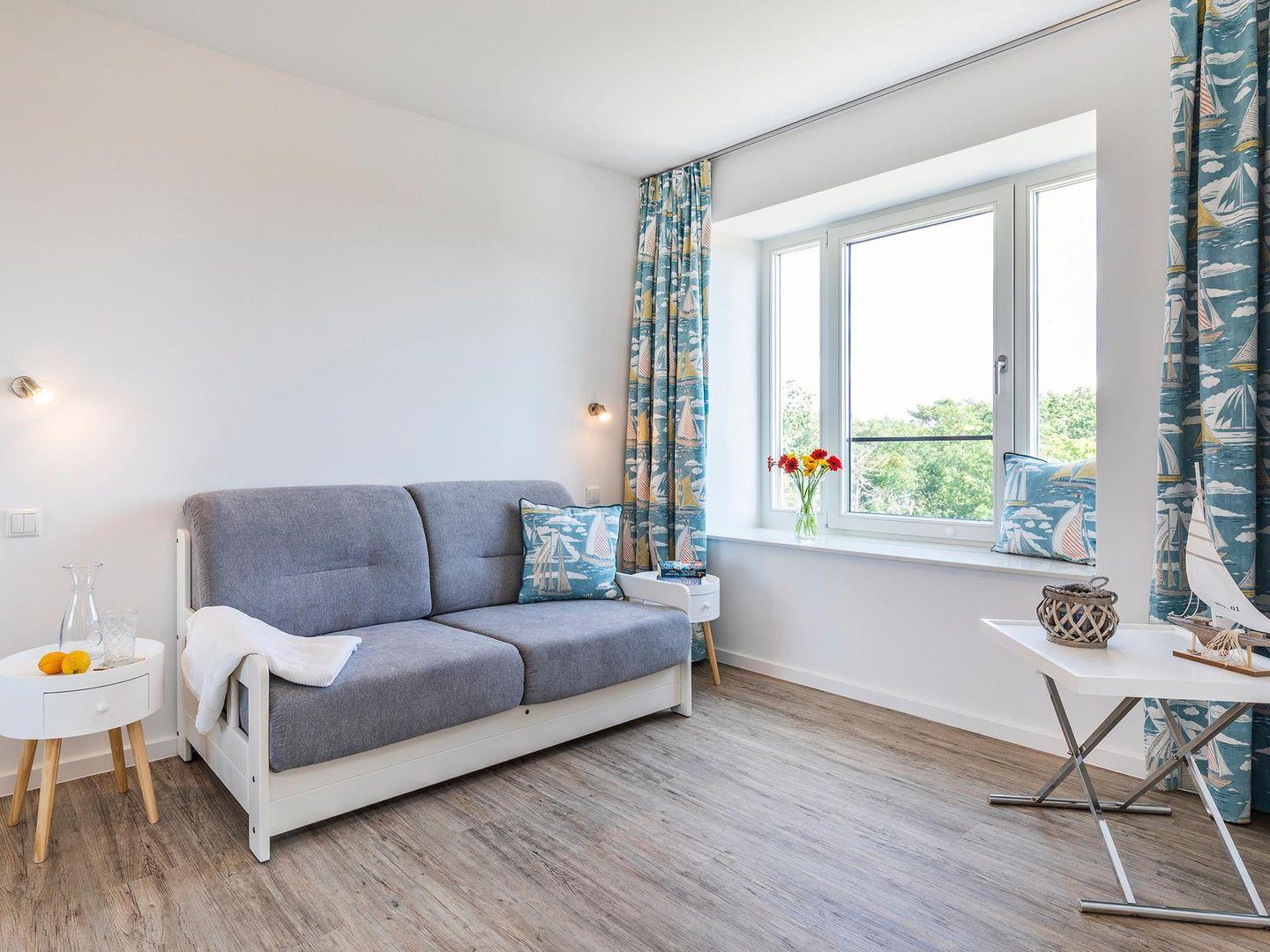 Im Haus Mönchgut erwartet dich eine lichte Ferienwohnung nur 50 m vom Meer entfernt. Ein ruhiges Schlafzimmer und ein zweites Zimmer mit Schlafsofa schenken Flexibilität, der hohe Wohnraum mit Dachfenstern führt auf den Balkon mit Blick über Dünen und Wasser. Warme Böden, WLAN, Gäste-WC und eine moderne Küche begleiten deinen Aufenthalt – und ein Elektrogrill sorgt für entspannte Abende. Ein Parkplatz steht bereit.