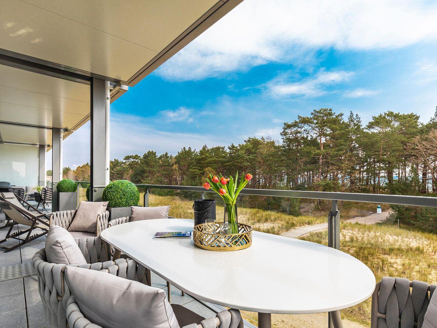 - Balkon mit Tisch und Sitzmöglichkeiten, Blick Richtung Meer