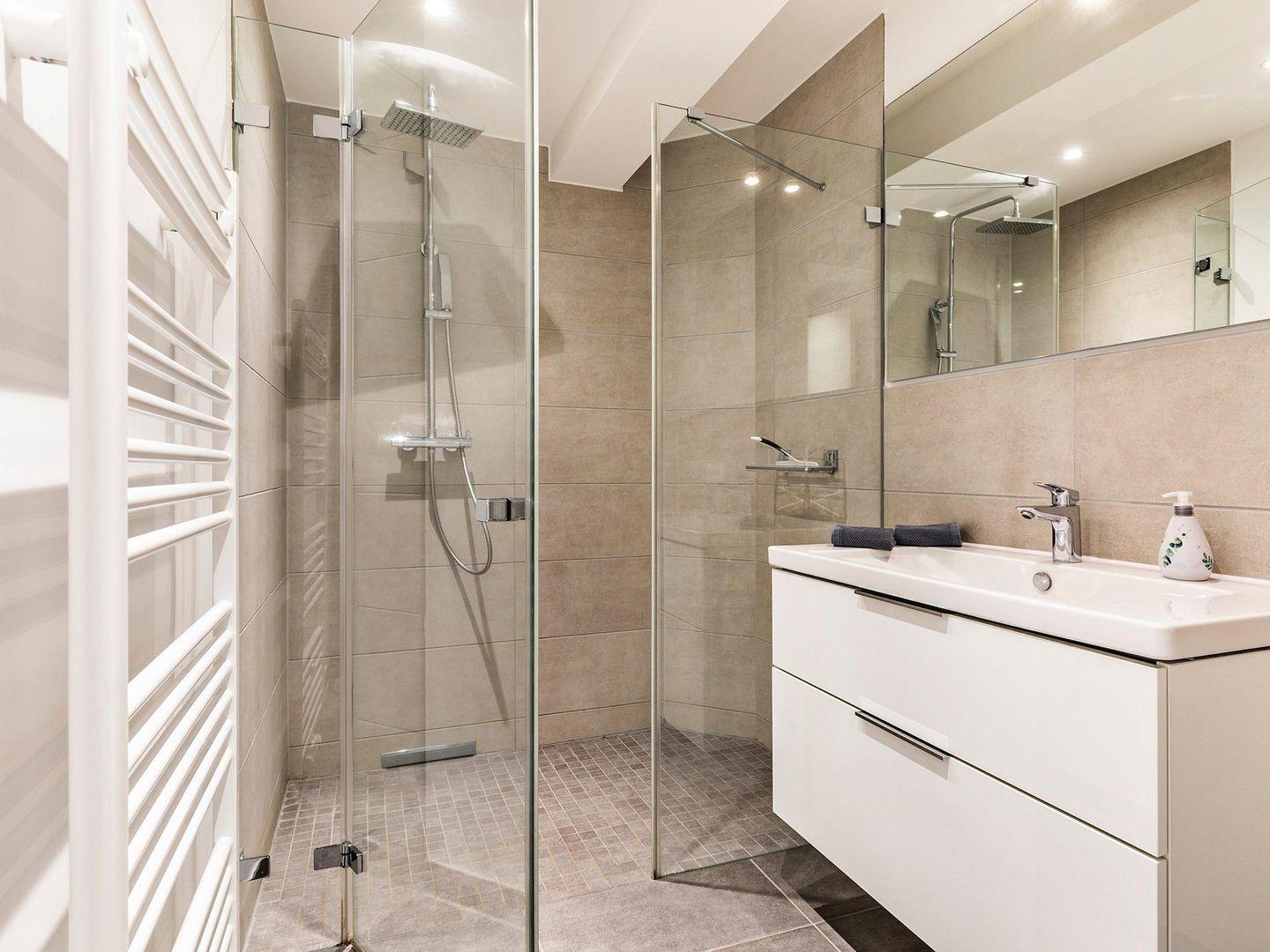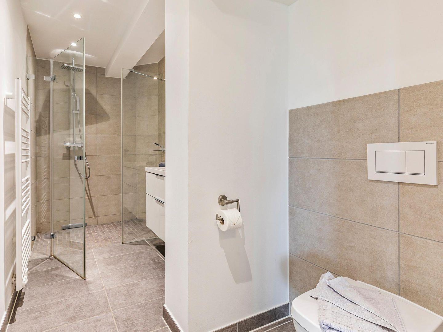 - Badezimmer: Regendusche, WC, Haartrockner