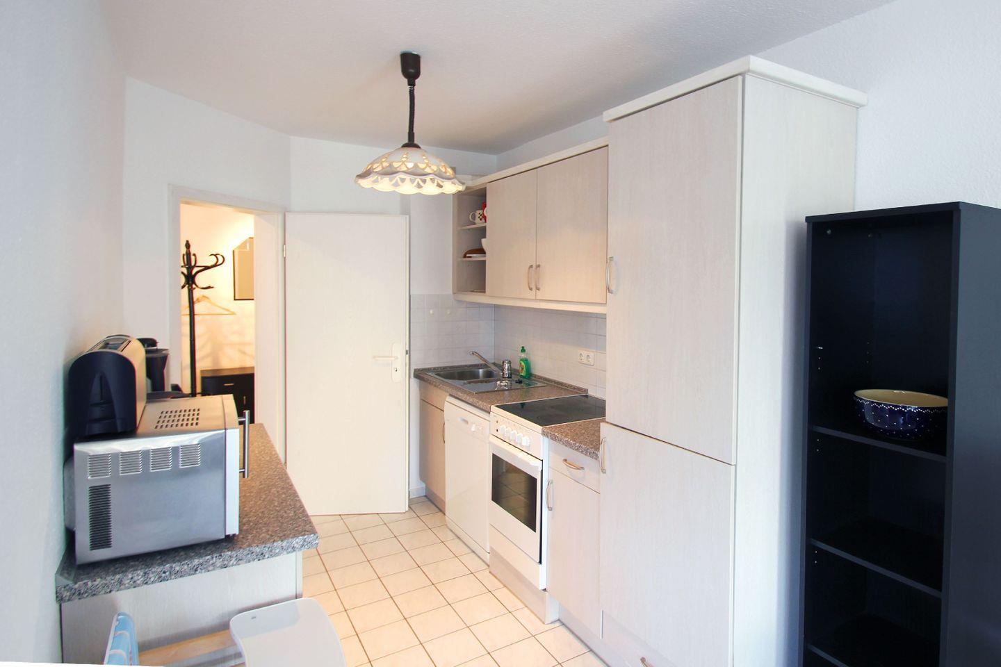 KÜCHE // Küchenzeile, 4-Platten Ceranherd, Spülmaschine, Kühlschrank mit Gefrierfach, Backofen, Mikrowelle, Toaster, Wasserkocher, Kaffeemaschine, reichlich Besteck, Geschirr und Küchenutensilien ++