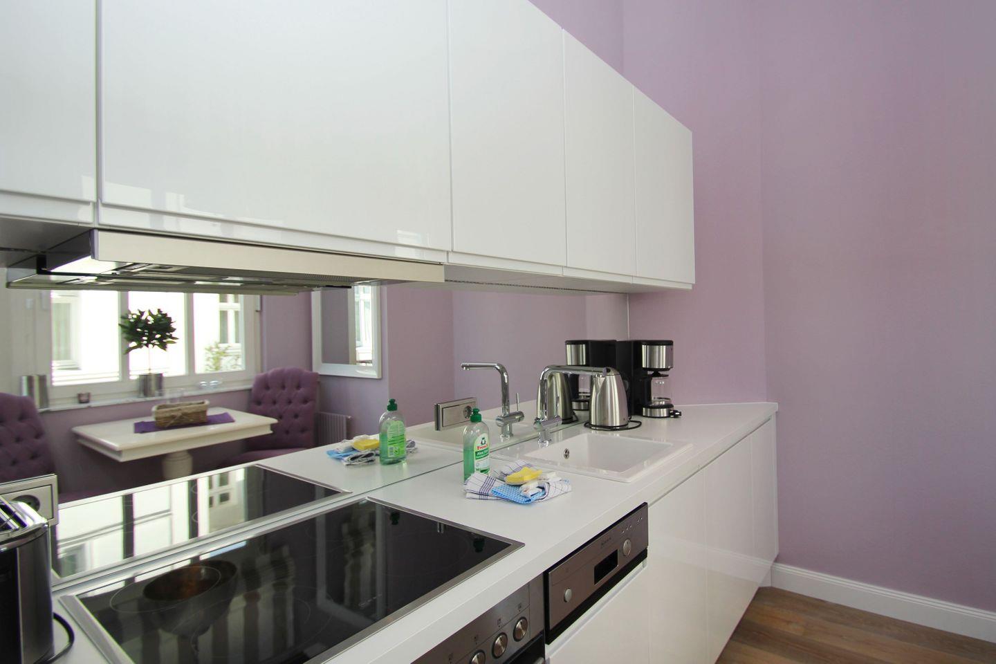 KÜCHE // Küchenzeile, 4-Platten Ceranfeld, Spülmaschine, Kühlschrank mit Gefrierfach, Backofen, Toaster, Wasserkocher, Kaffeemaschine, reichlich Besteck, Geschirr und Küchenutensilien ++