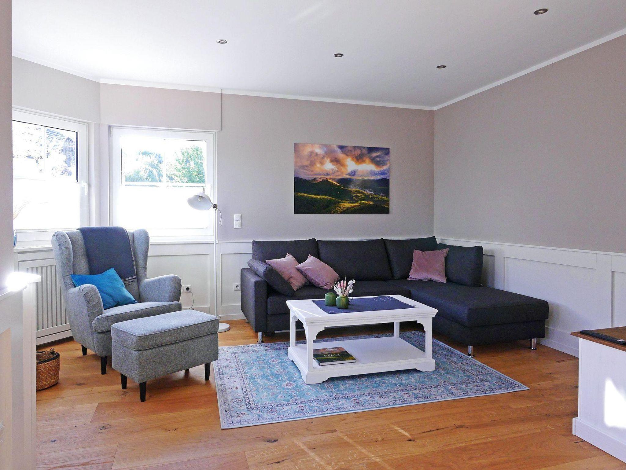 Diese Ferienwohnung liegt im ersten Stock und ist über eine Außentreppe zu erreichen. Durch einen kleinen Flur kommt man in die liebevoll ausgestattete Wohnung, welche über ein großzügiges Wohnzimmer mit gemütlicher Couch, Flatscreen-TV und Leseecke verfügt. Angrenzend befindet sich eine geräumige und voll ausgestattete Küche mit kleiner Eckbank. Das helle Schlafzimmer bietet Ihnen ein Doppel-Boxspringbett und einem Platz bietendem Schrank. Das Badezimmer der Wohnung verfügt über Tageslicht, eine komfortable Dusche, ein Waschbecken mit Spiegelschrank und ein WC. Über die Wohnzimmertür gelangen Sie auf die große Terrasse mit einladender Sitzmöglichkeit. Es handelt sich um eine Nichtraucherwohnung, in der Haustiere nicht erlaubt sind. Einen Parkplatz finden Sie direkt vor dem Haus.