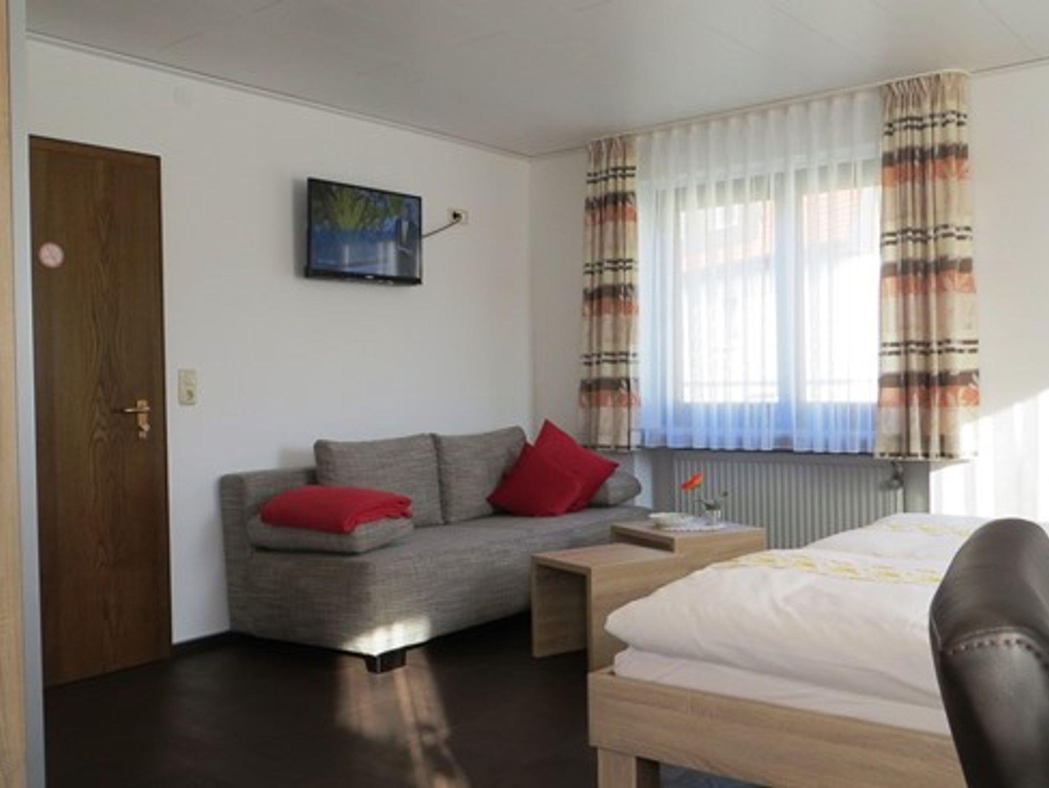 Das Wohn-Schlafzimmer des Appartements mit Doppelbett, Sat-TV und gemütlicher Schlafcouch lädt zum Verweilen ein