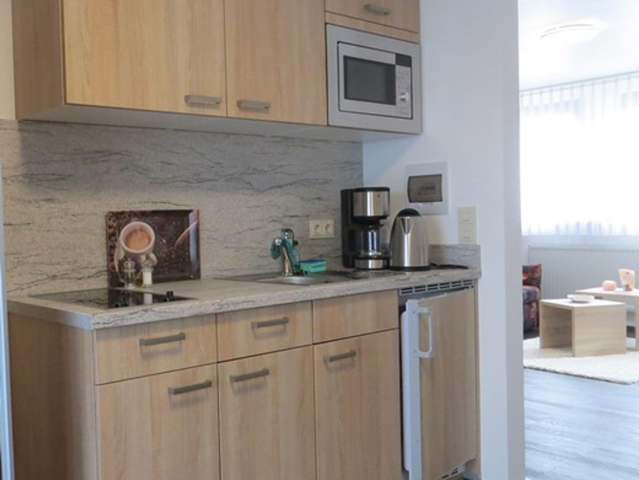 Die voll ausgestattete Küchenzeile mit Cerankochfeld, Mikrowelle, Kühlschrank, Kaffeemaschine, Toaster und Wasserkocher lässt keine Wünsche offen.
