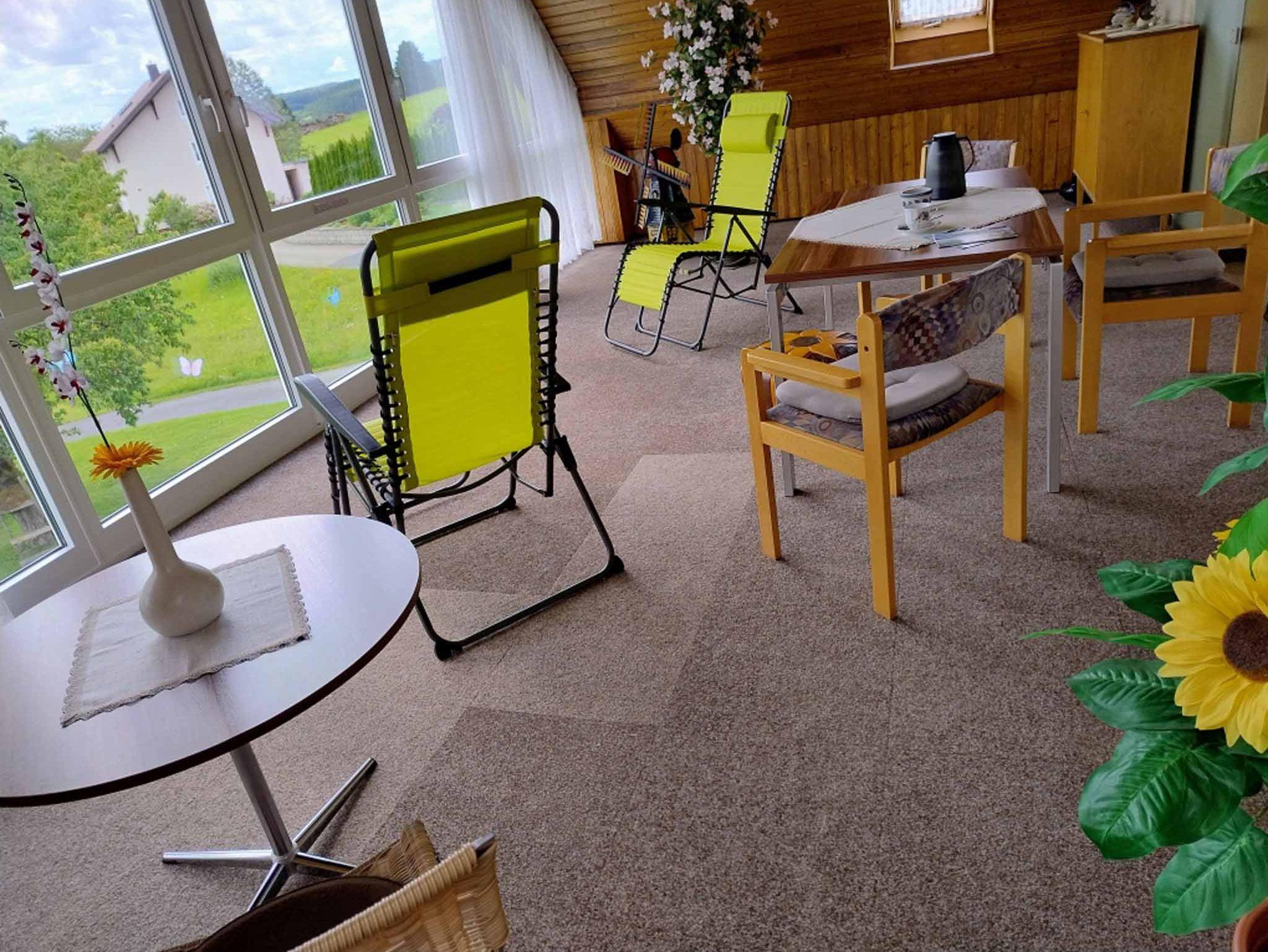 Vom großen Wintergarten aus haben Sie einen traumhaften Blick auf den Ort, den Ochsenkopf und den Schneeberg, die beiden höchsten Berge des Fichtelgebirges. Im Sommer können Sie im Garten entspannen – entweder in der Sitzecke am Haus oder im Liegestuhl auf der Wiese.