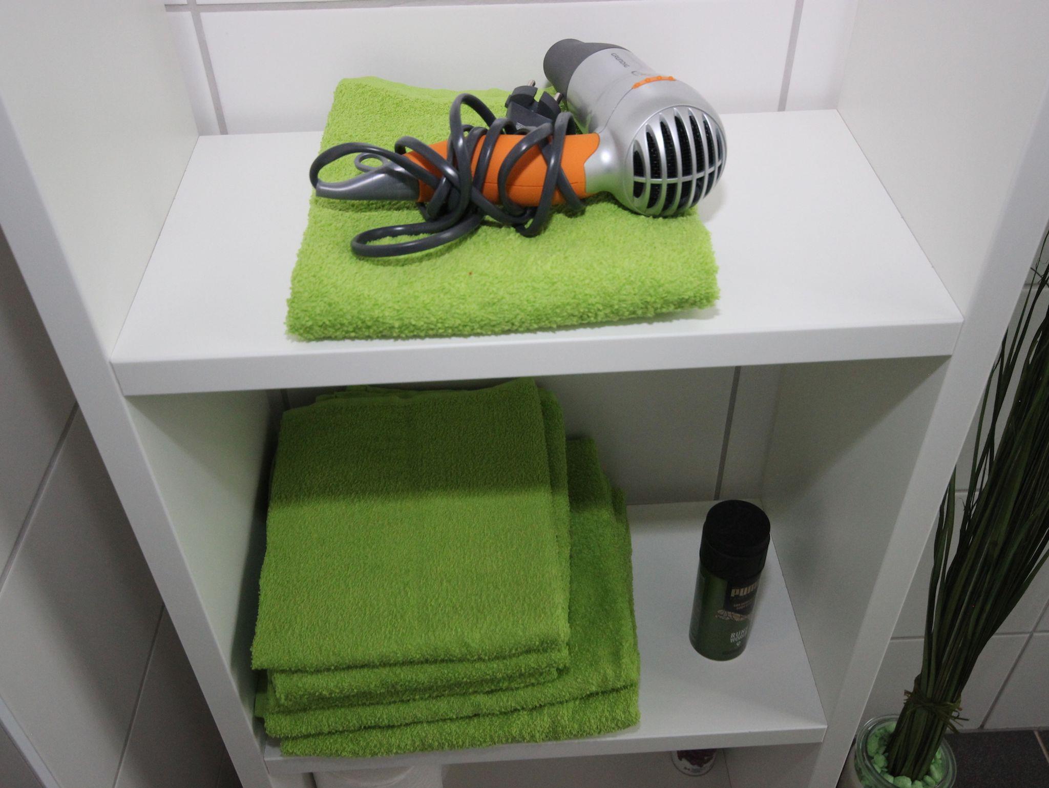 Bad: Handtücher, Toilettenpapier, Fön, Duschgel und Shampoo sind vorhanden.