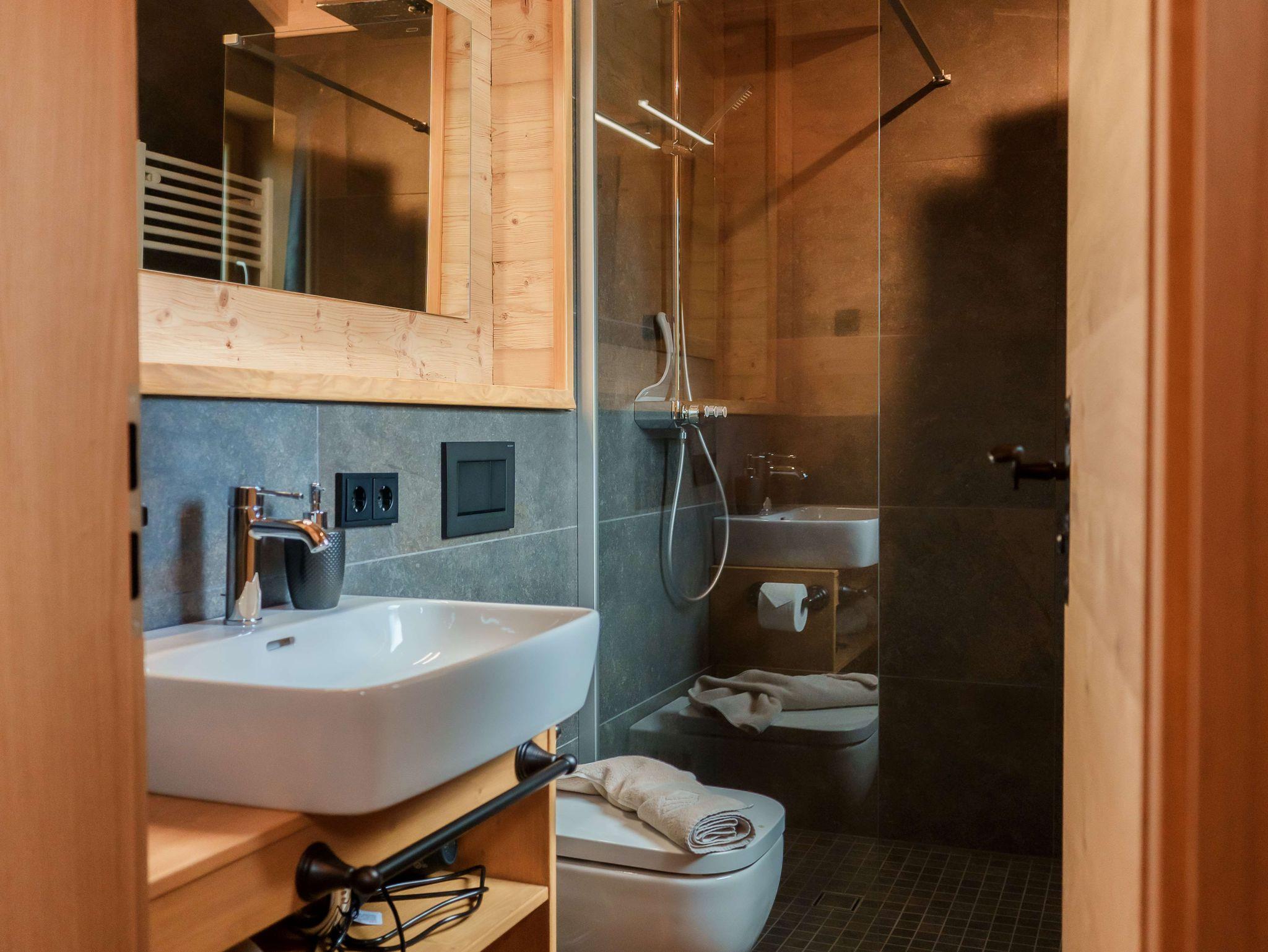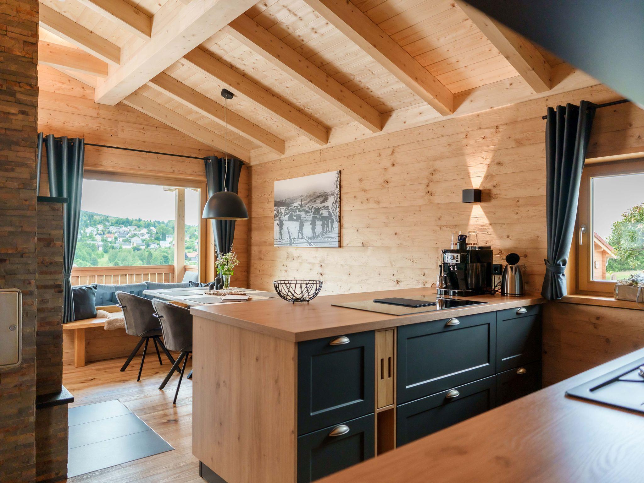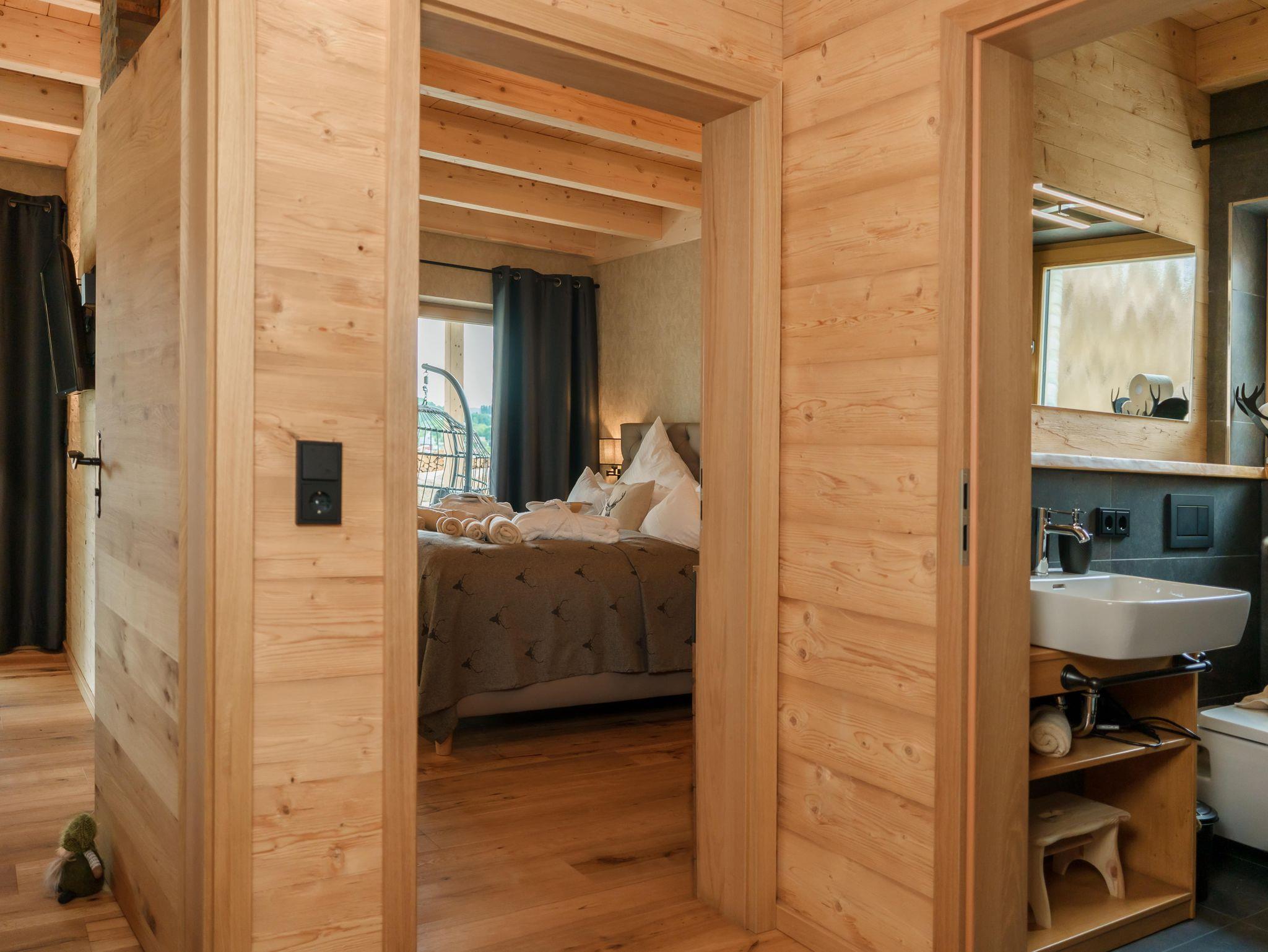 Chalet LISL ist ein Ferienhaus für 2-4 Personen. Das Obergeschoss begrüßt Sie mit einem offenen Sichtdachstuhl im Wohnbereich. Sie sehen ein großes Panoramafenster, eine geräumige Essgruppe und eine vollausgestattete Küche. Zudem einen Holzkaminofen, eine Garderobe und ein hochwertiges ausziehbares Schlafsofa für bis zu 2 Personen. Neben dem Badezimmer mit Dusche gibt es einen Zugang zum Balkon mit Relaxlounge und Privatsauna. Untergeschoss: Zwei Doppelzimmer mit Boxspringbetten und ein weiteres Badezimmer mit Dusche, Waschbecken und WC. Im Außenbereich ist ein beheizbarer Whirlpool, ein Grill, Relaxlounge und der Zugang zum Gemeinschaftsbereich.