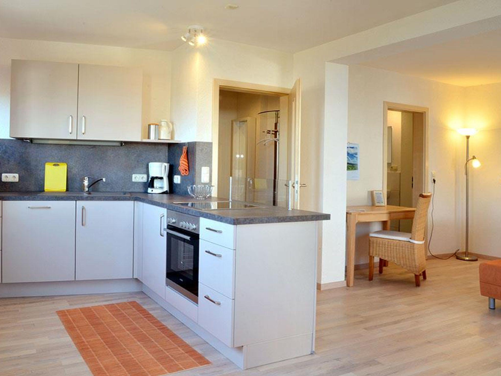 Alle 6 Ferienwohnungen haben eine komplett ausgestattete Wohnküche, Küchenzeile oder Kochnische, inkl. Mikrowelle, Kaffeemasch., Wasserk., Toaster, Backofen, Spülmaschine und Gefrierschrank oder Gefrierfach (Studio ohne Spülmaschine).