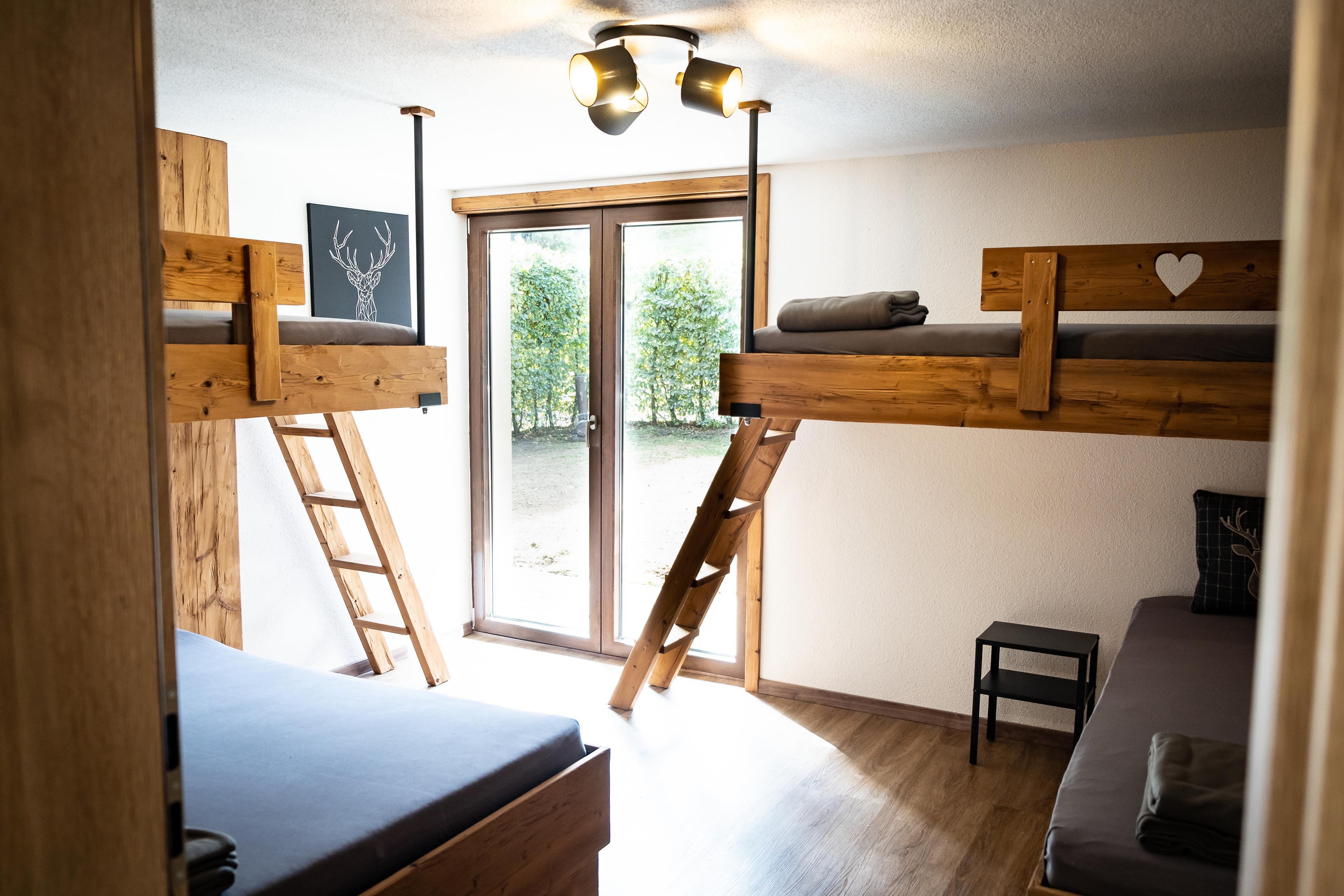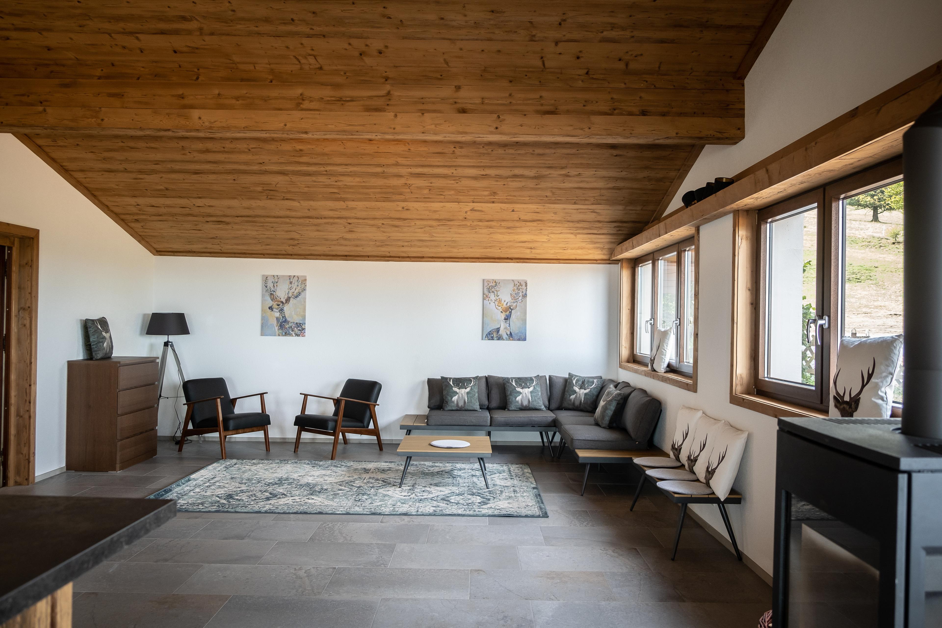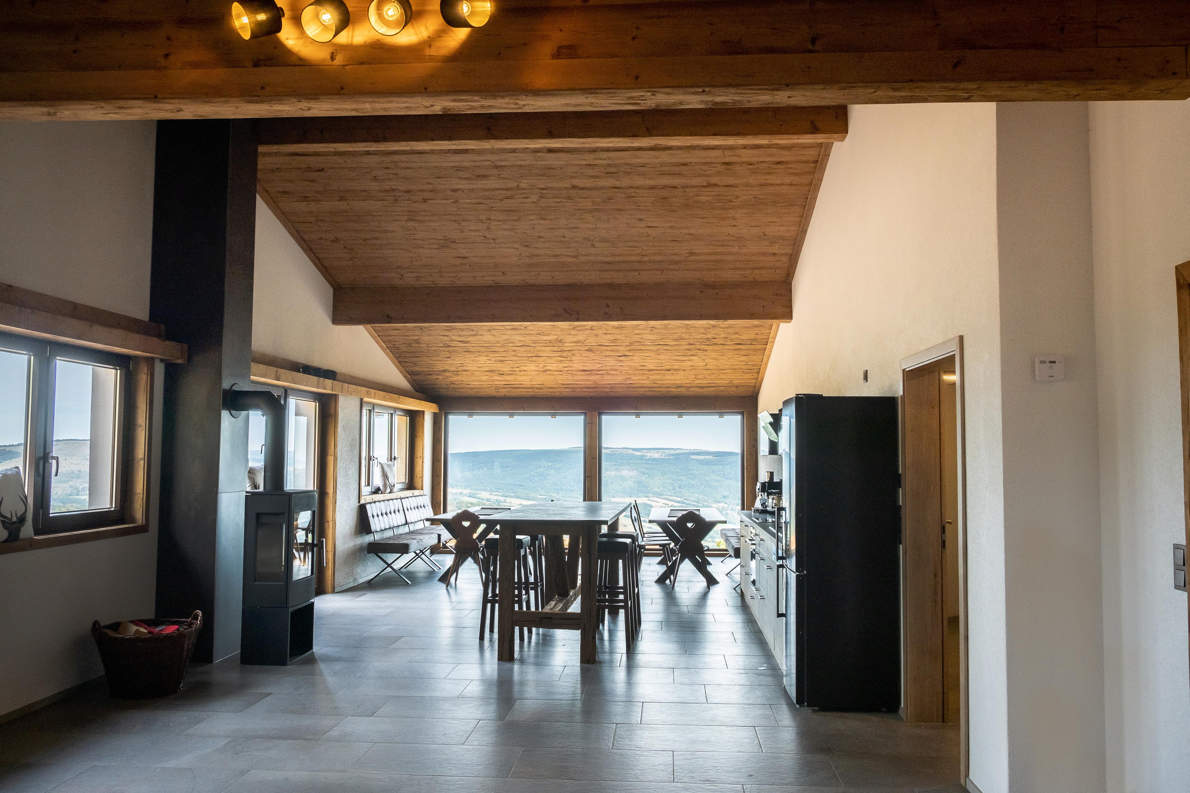 Unter anderem ausgestattet mit insgesamt 4 Schlafräumen mit je 4-5 Schlafplätzen und einem hochwertigem Matratzenlager mit romantischer Aussicht auf den Sternenhimmel, bietet unser Chalet somit Platz für maximal 20 Personen. Eine vollausgestattete und großzügige Küchenzeile im offenen Wohn- und Essbereich lädt zum gemeinsamen Kochen und Verweilen vor einer großen Panoramascheibe ein. Für die richtige Atmosphäre und Gemütlichkeit sorgt ein Holzofen mit Glasscheibe im Wohnbereich sowie ein Grillplatz mit Feuerstelle auf der großzügigen Außenfläche vor der Alm. Insgesamt verfügt die Alm über 3 moderne Bäder mit großer Panoramadusche. Für Kinder steht ein kleiner Spielplatz zur Verfügung. Von der Haflinger Alm aus können Sie viele schöne Wanderungen durch die Rhön starten, oder im Winter Ski fahren. Eine kostenfreie Parkmöglichkeit befindet sich direkt vor dem Chalet. Nach ca. 6,5 km erreichen Sie die kleine Stadt Bischofsheim mit einer schönen Altstadt und Einkaufsmöglichkeiten.
