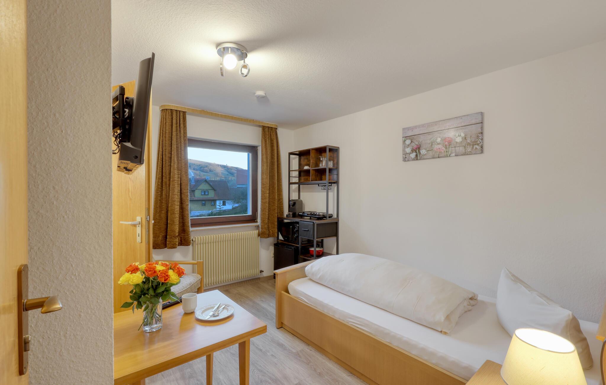 Tilbring nogle afslappende dage i jeres ferielejlighed nær Bischofsheim. Gå ind og føl jer straks velkommen. Lejligheden tilbyder jer en behagelig seng, et praktisk tekøkken, ideel til små måltider eller te om eftermiddagen, og et hyggeligt opholdsområde. På stille aftener kan I se en god film og nyde den behagelige atmosfære i rummet.