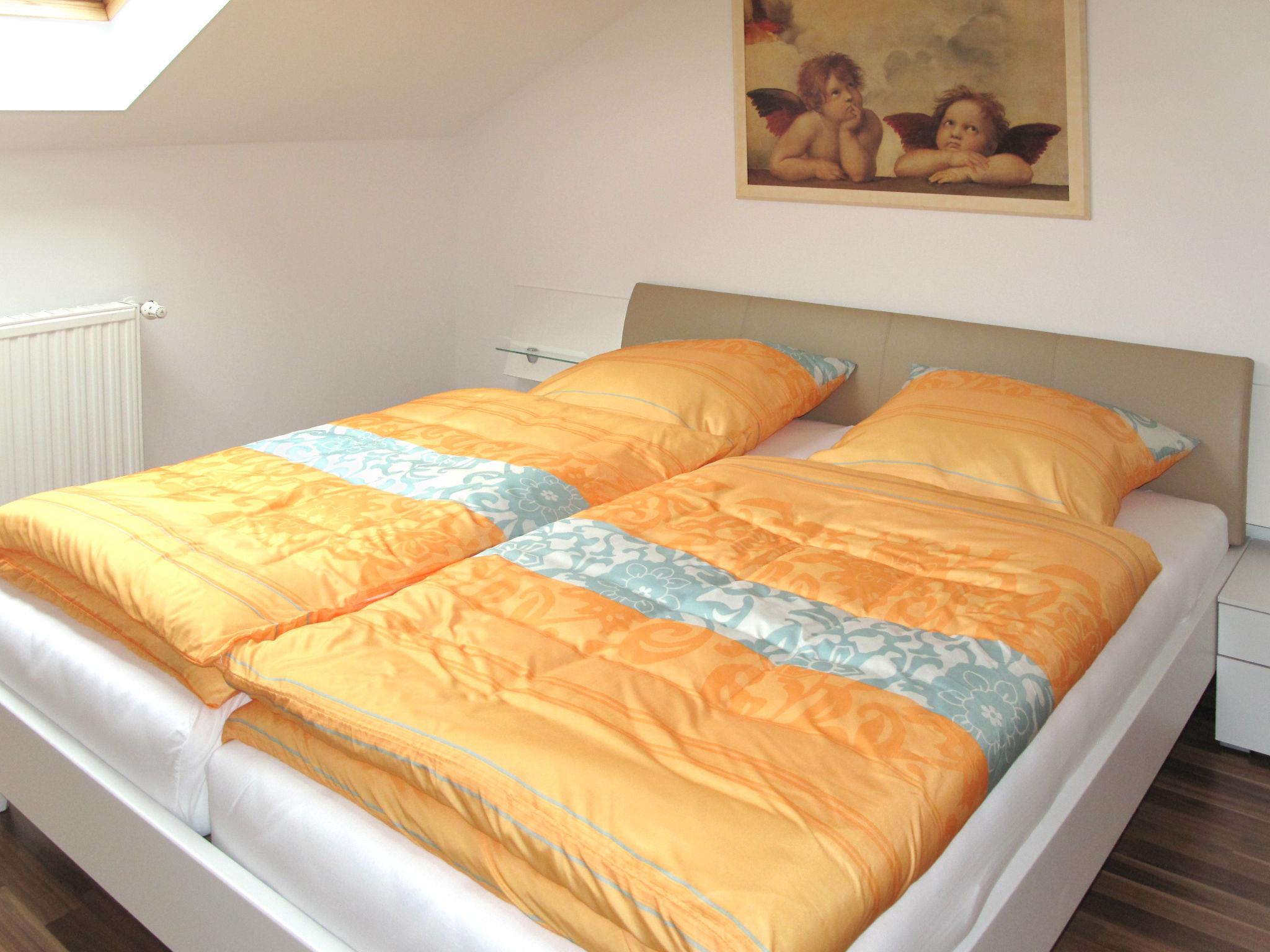 3-room apartment 100 m2 on 2nd floor. Rustic furnishings: living/sleeping room with 2 fold-away beds, satellite TV and DVD. Exit to the balcony. 1 room with 1 x 2 bunk beds (length 180 cm), 1 double bed. Exit to the balcony. 1 double bedroom. Kitchen (4 hot plates, oven, dishwasher, toaster, kettle, microwave, freezer, electric coffee machine) with dining table. Shower/WC with corner bath. Heating. Balcony, patio. Balcony furniture, deck chairs (2). Facilities: children's high chair, baby cot. Internet (WiFi, free). Please note: non-smokers only. Smoke alarm, fire extinguisher.