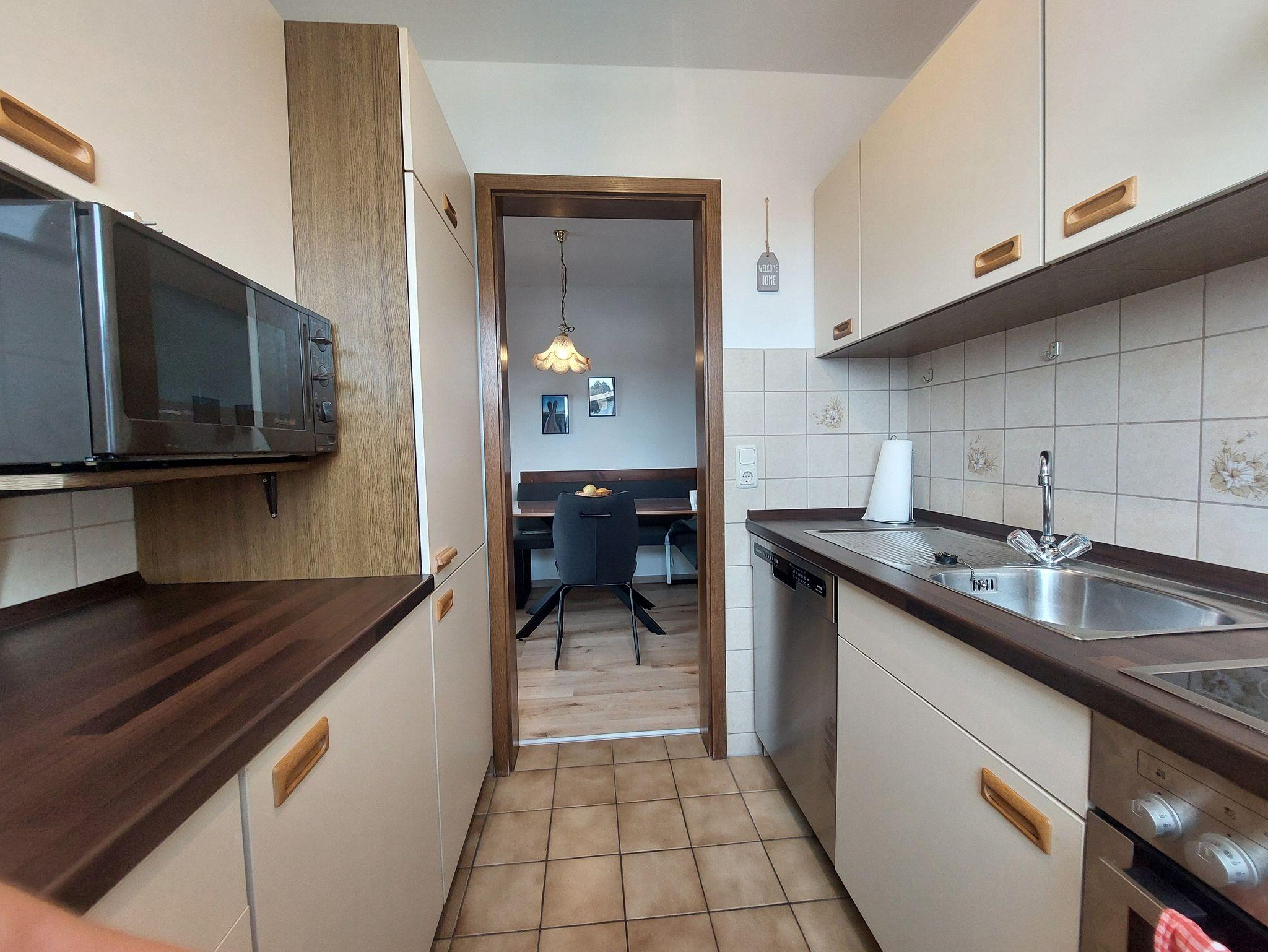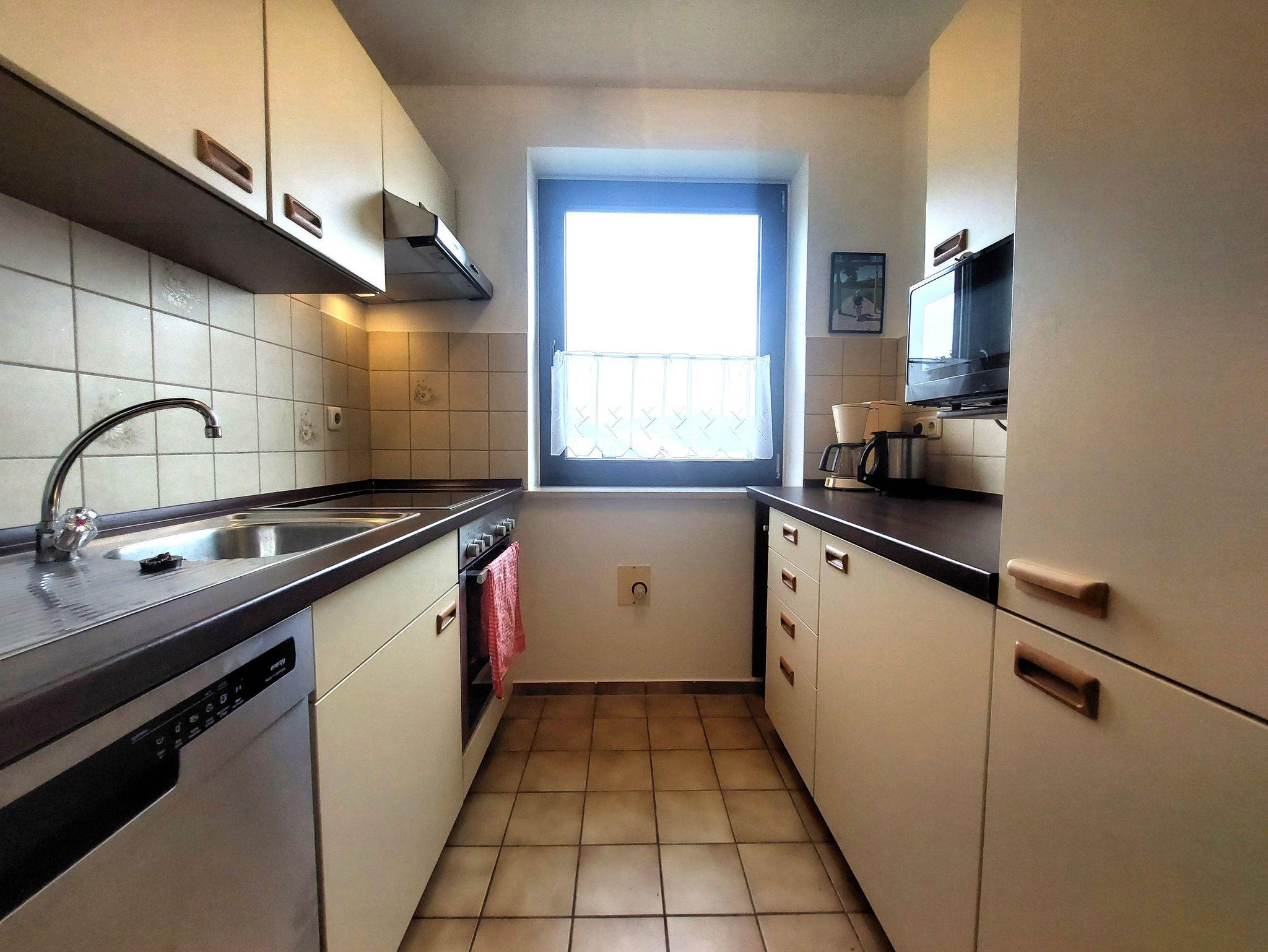 • Die Einbauküche verfügt über ein 4-Platten-Kochfeld, Herd, Spülmaschine, Kühlschrank mit Gefrierfach, Wasserkocher, Kaffeemaschine, Toaster, Eierkocher, Mixer und ausreichend Geschirr.