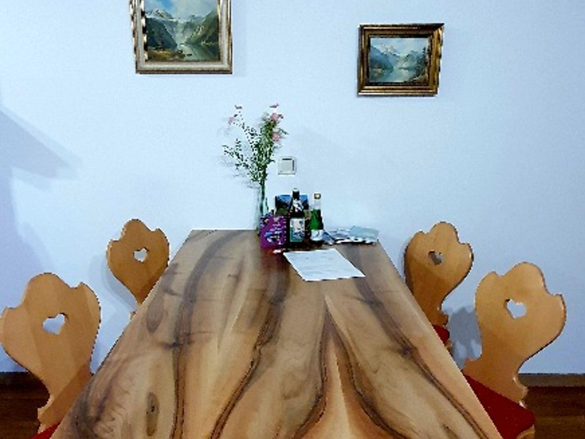 • einer Holz-Einbauküche vom renommiertem Schreiner in heimischen Bio-Fichten- und Nussholz gefertigt und ausgestattet mit hochwertigen Geräten, wie Backofen, Ceranfeld, Kühlschrank, Mikrowelle, Geschirrspülmaschine, kleinen praktischen Küchenhelfern, wie Messerblock, Handrührgerät, Eierkocher, Wasserkocher, Kaffeemaschine, Toaster usw.