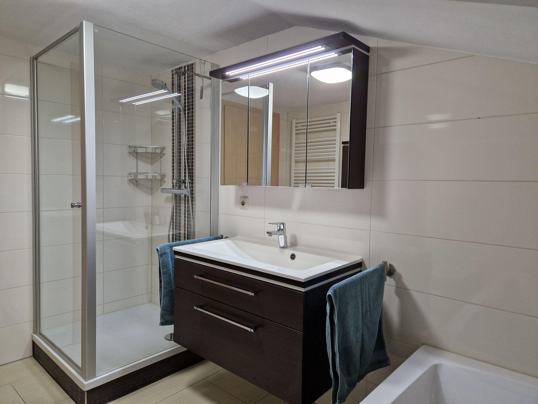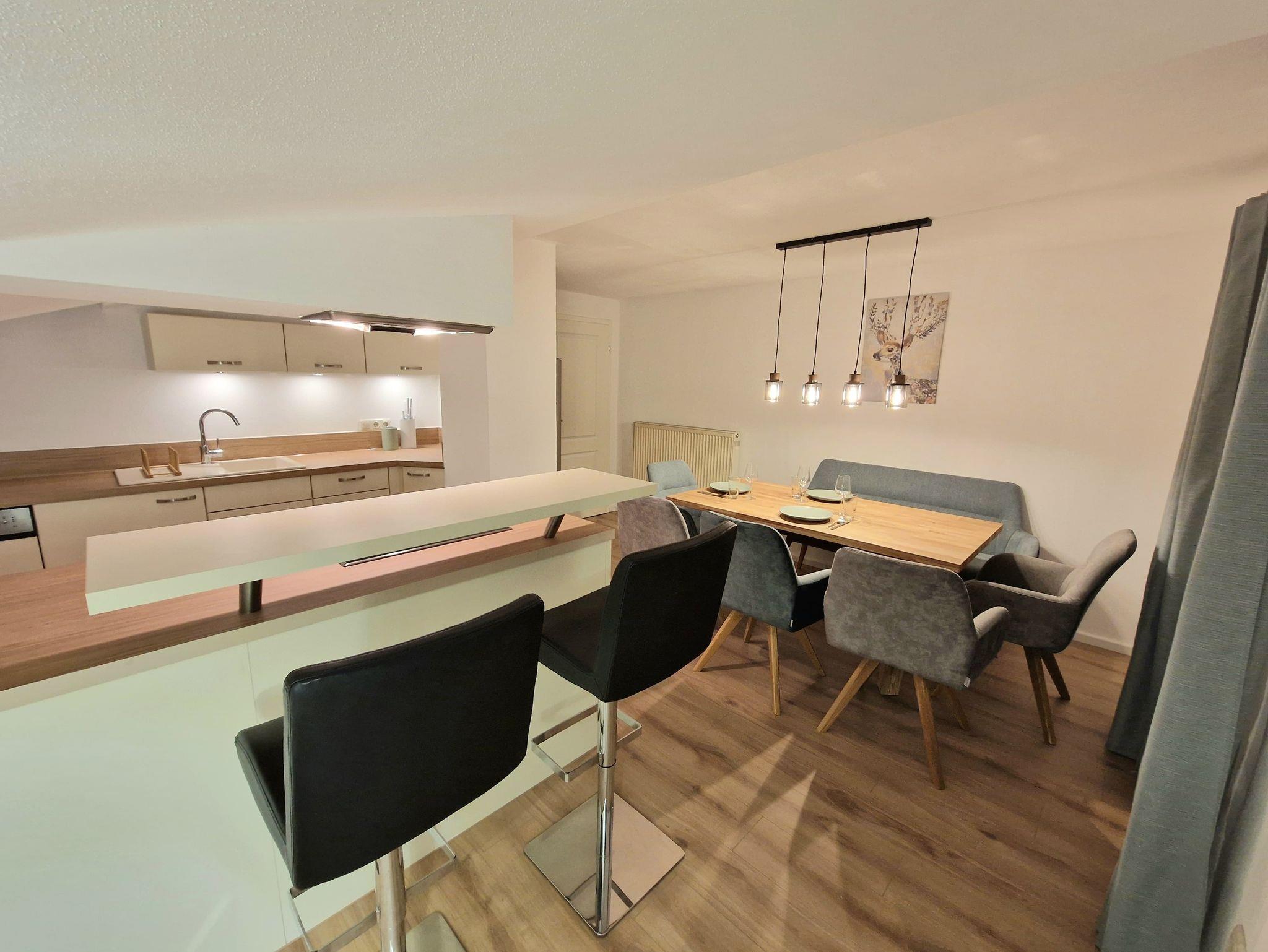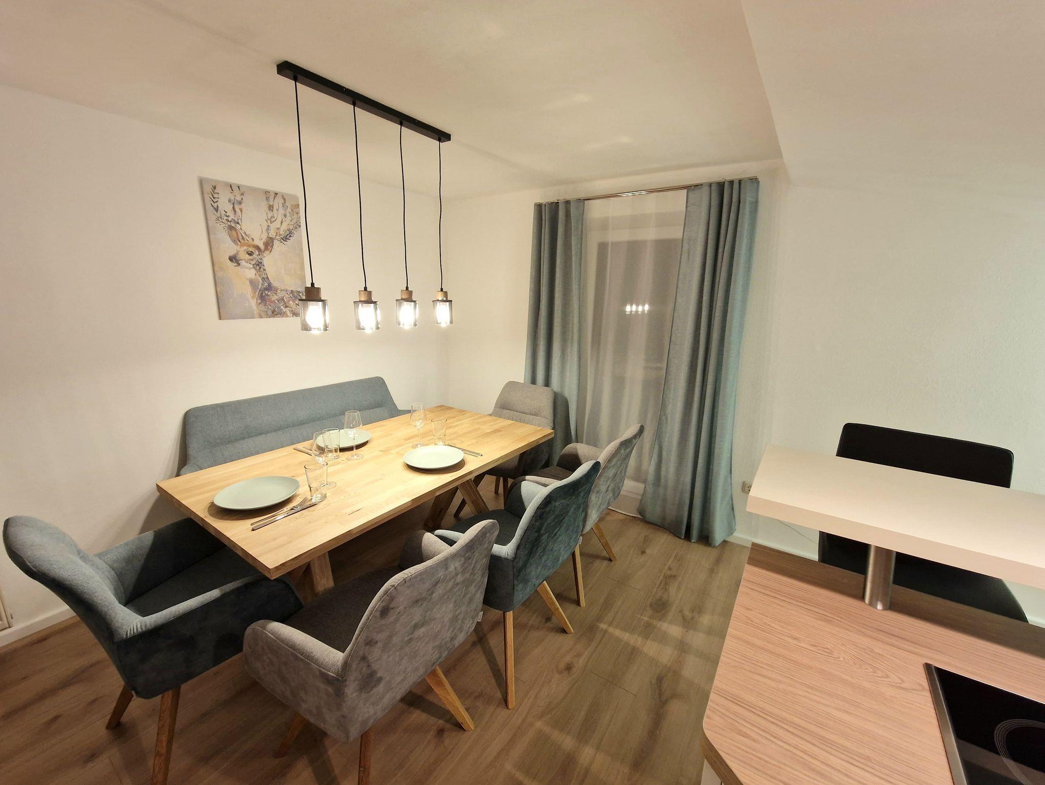 Unsere gemütlich-modern eingerichtete Ferienwohnung Kehlsteinblick befindet sich im Dachgeschoss (2. Stock) unseres Bauernhauses und wurde komplett renoviert. Mit 2 getrennten Schlafzimmern und einer großen Schlafcouch sowie einem Schrankbett im Wohnzimmer können hier bis zu 8 Personen und ein Kleinkind (Reisebett) ihren Urlaub verbringen. Die voll ausgestattete Küche (Spülmaschine, Senseo Kaffemaschine, Wasserkocher, Toaster, Backofen mit Ceranfeld) mit gemütlicher Essecke lädt zum gemeinsamen Kochen und Genießen ein. Backpapier, Gewürze, Spülmittel und -lappen, Geschirrtücher und Spülmaschinentabs stehen bereit. Im Badezimmer ist Seife vorhanden sowie 2 Rollen Toilettenpapier für den Anreisetag. Kostenloses WLAN und Parkplätze am Haus sind vorhanden. Auf Anfrage stellen wir für unsere kleinen Gäste gerne kostenfrei ein Reisebett (60cmx120cm),einen Hochstuhl, eine Wickelkommode und einen Windeleimer zur Verfügung. Nach Absprache und gegen Gebühr kann eine Waschmaschine und ein Wäschetrockner genutz werden.