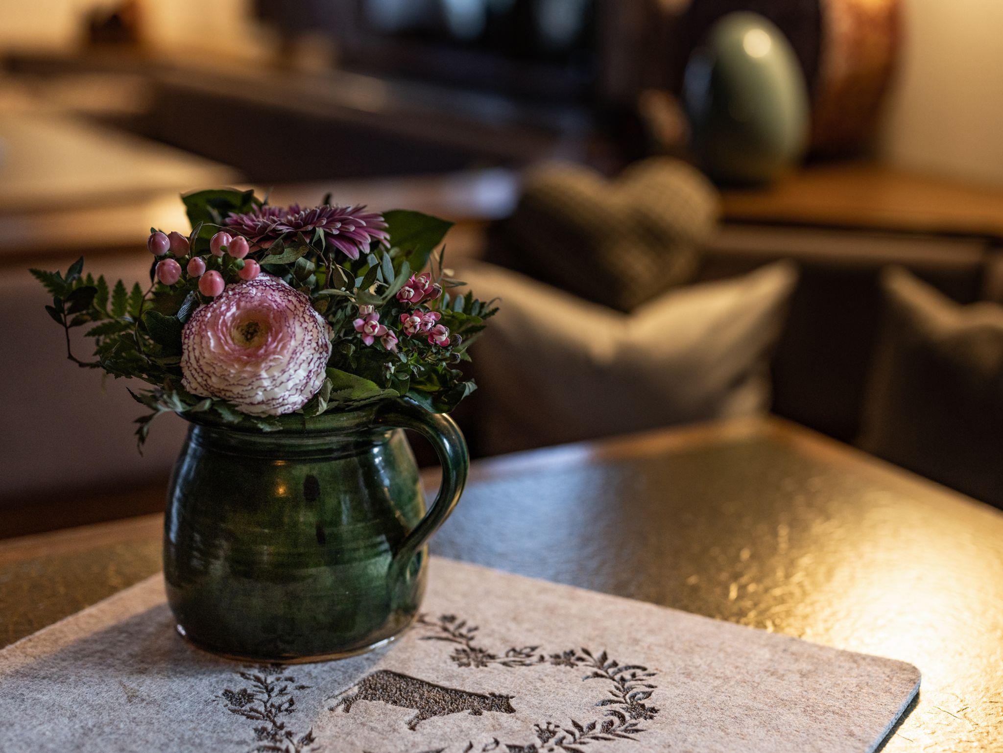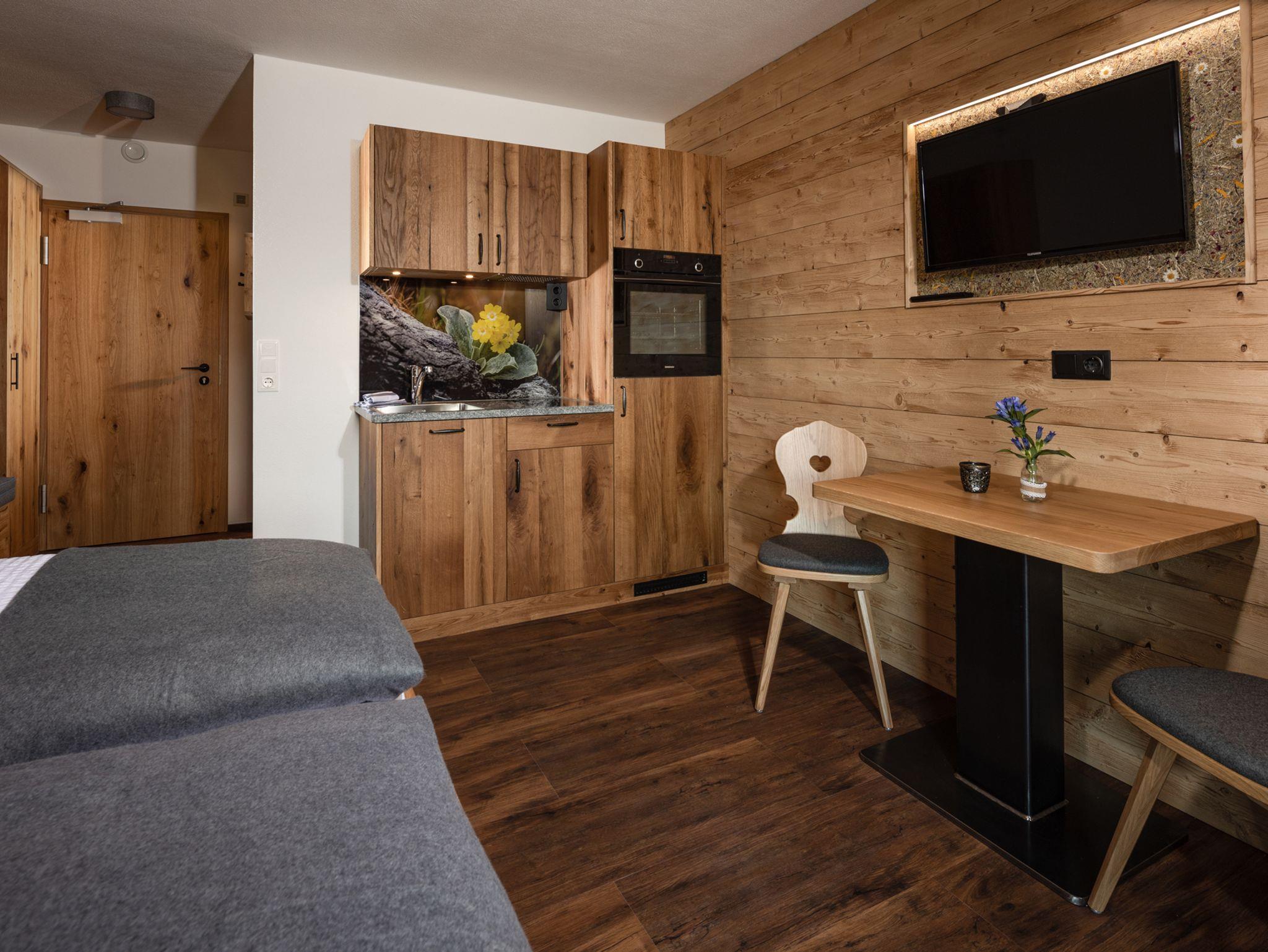 Sie suchen Erholung in einer Ferienwohnung, die komplett ausgestattet ist, bei traumhaftem Bergpanorama inmitter der Natur liegt und von der aus Sie ideal Ihre Ausflugsziele erreichen können? Dann sind Sie bei uns richtig!Unsere Ferienwohnung Gamsbleame eignet sich perfekt für den Urlaub zu zweit, als kleine Familie oder mit Freunden und bietet für Sie:-Verfügbarkeit für bis zu 2 Personen- ein Massivholzbett im Wohn-/Schlafraum- Flachbildfernseher- einen Balkon mit herrlichem Bergblick- Badezimmer mit Regendusche- eine komplett ausgetattete Küchenzeile mit Herd, Backofen, Kühlschrank, Kaffeemaschine, Wasserkocher und Toaster- eine Fußbodenheizung, die für angenehme Wärme sorgt- kostenlose WLAN-Nutzung- Hand- und Geschirrtücher, sowie Bettwäsche- Wäscheservice nach Anfrage- täglicher Semmelservice und großzügige Getränkeauswahl im Haus- wöchentlicher WäschewechselAlle Möbel wurden exklusiv von einer heimischen Schreinerei gefertigt.